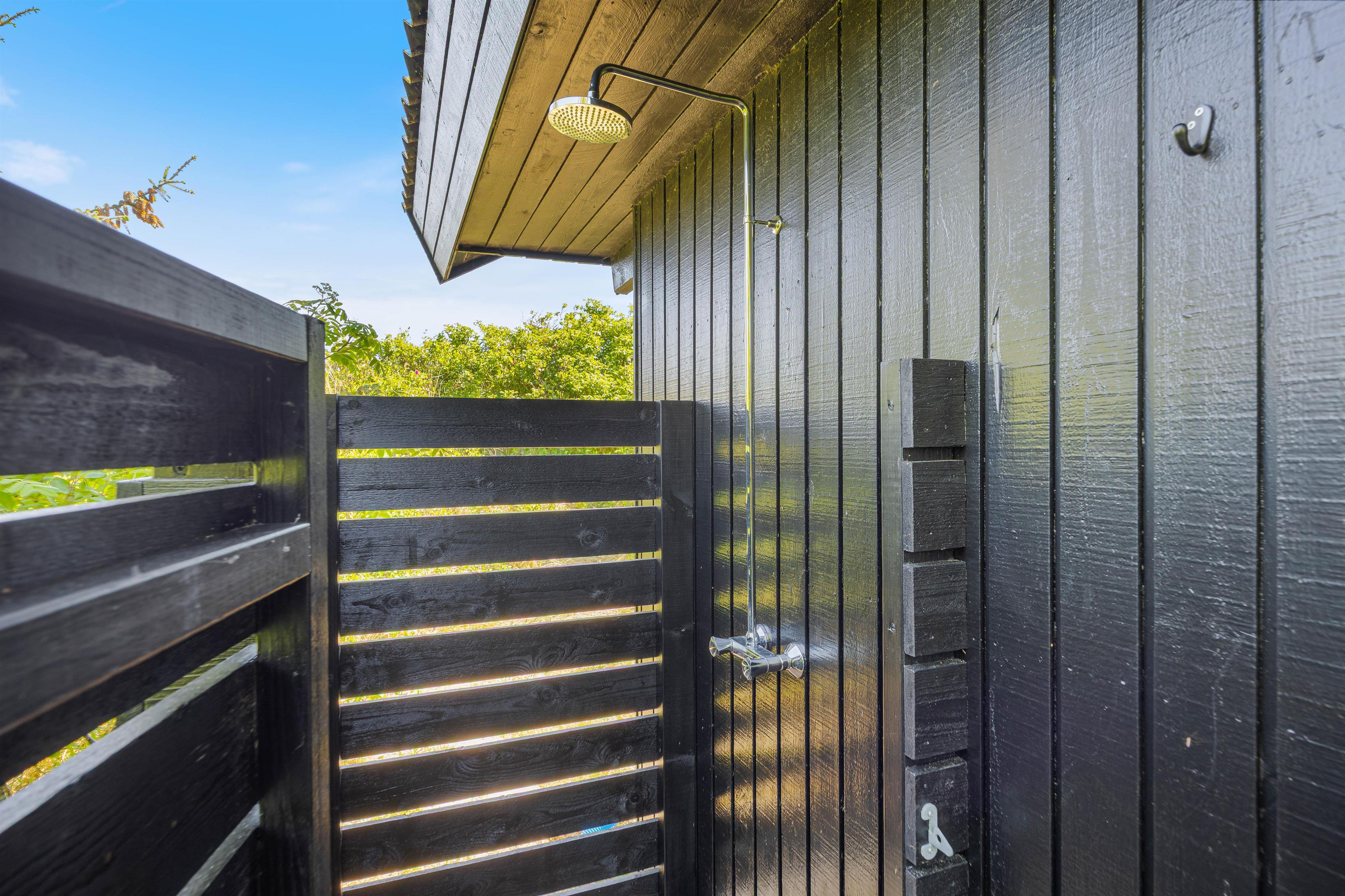 På de lune sommeraftener kan I tænde op i grillen og tilberede et lækkert måltid, som I kan nyde i læ under terrassens overdækning. Når I trænger til en forfriskning efter en dag ved stranden, kan I tage et bad under udebruseren, der kan benyttes fra april til november – en skøn detalje, der forstærker sommerhusfølelsen og gør det ekstra nemt at skylle sandet af kroppen efter strandturen.