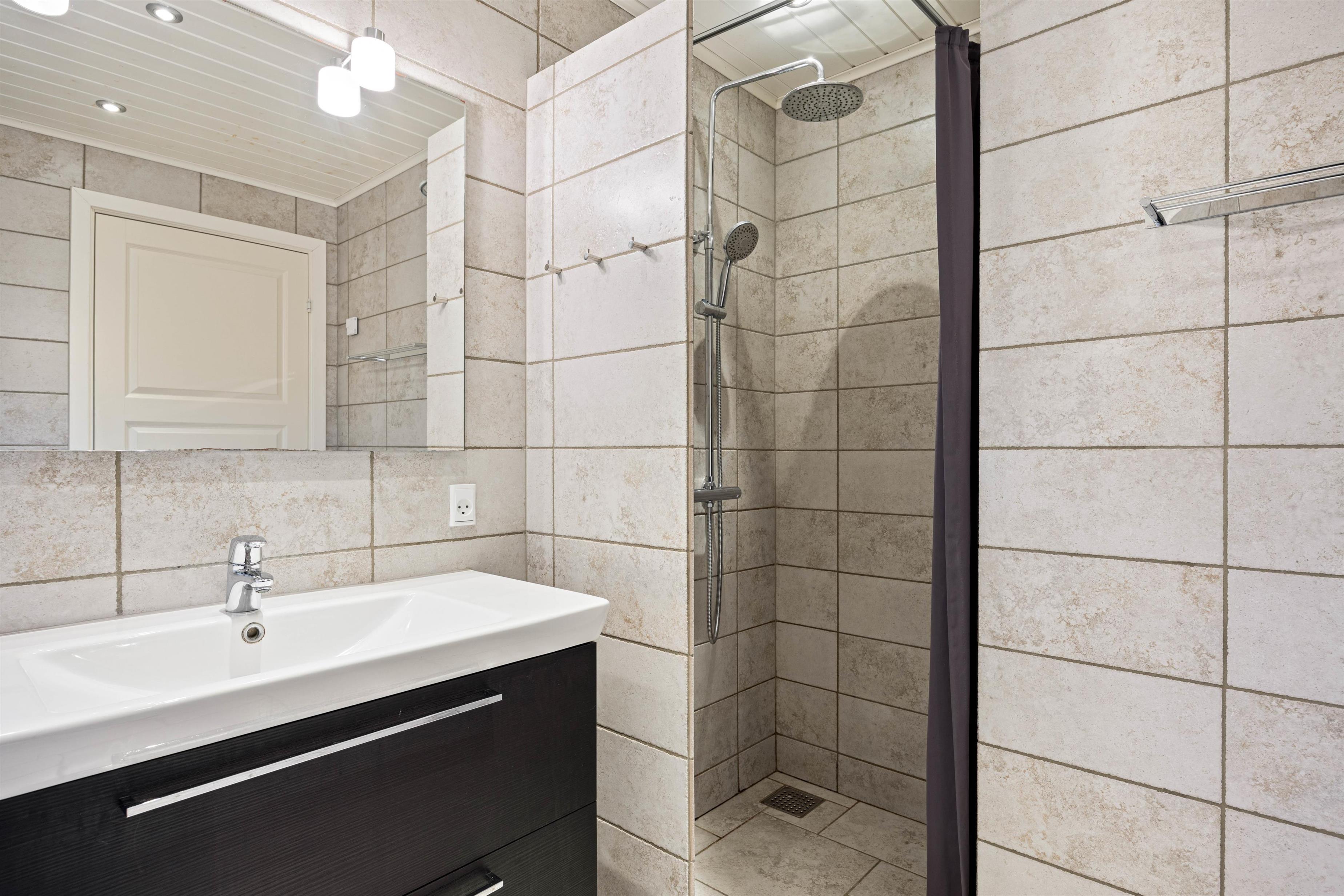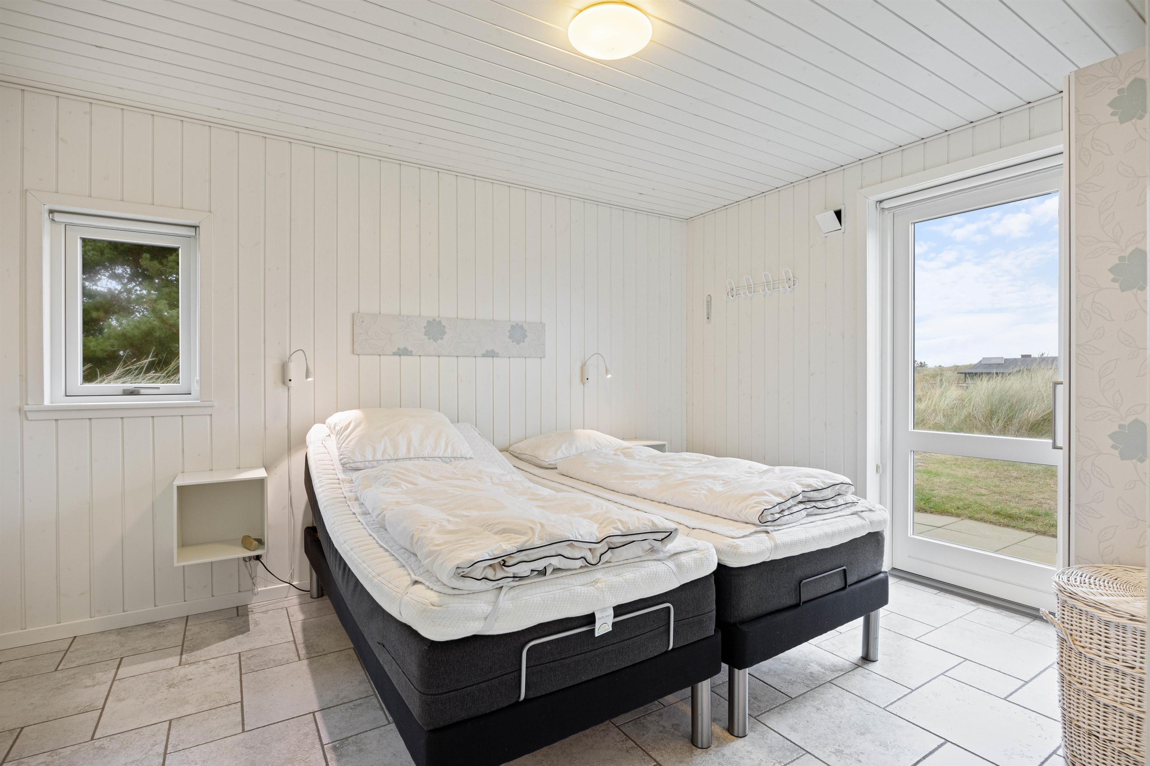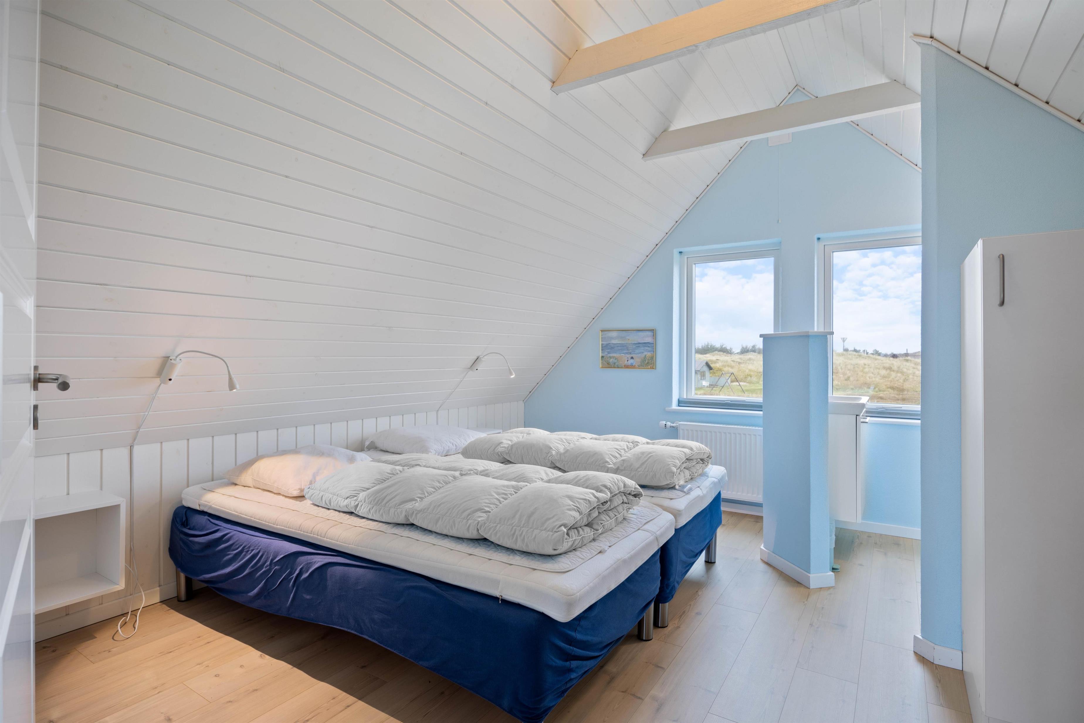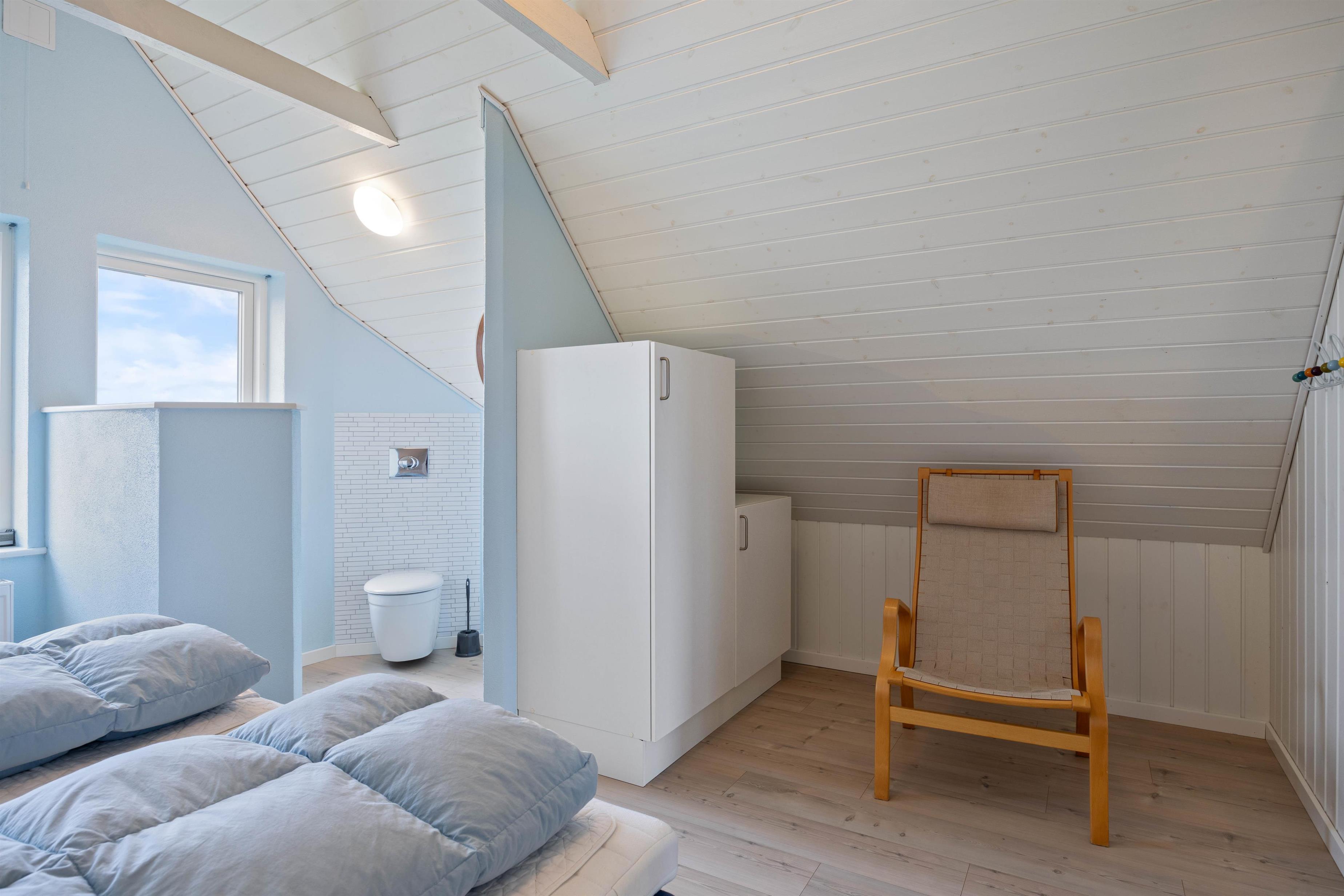 Efter middagen er det tid til at slappe af, f.eks. med din yndlingsbog foran den knitrende ild i brændeovnen. Ud over brændeovnen kan I også opvarme stueetagen med gulvvarmen, som drives af en energibesparende luft-til-luft varmepumpe. Her er også et fint badeværelse med dagslys og 1 af de hyggelige soveværelser med 2 enkeltsenge. Bemærk, at der på dette værelse er meget lavt til loftet. Med vaskemaskine og tørretumbler til rådighed kan I regelmæssigt opfriske badehåndklæderne.