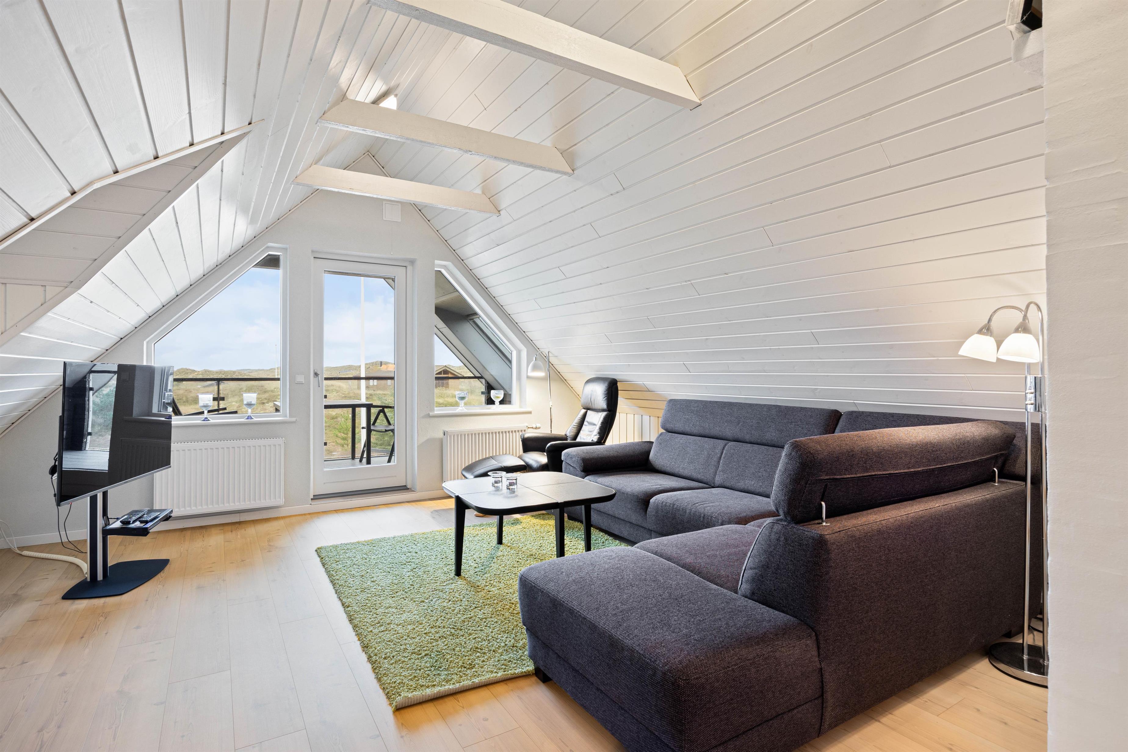 På 1. etage finder I endnu en hyggelig stue med udgang til balkonen, hvorfra I kan nyde en fantastisk panoramaudsigt over det omkringliggende landskab i retning mod fjorden. De 2 andre soveværelser og 1 praktisk gæstetoilet i forbindelse med det ene soveværelse er også placeret her. Bemærk venligst, at der ikke er dør imellem gæstetoilettet og soveværelset.