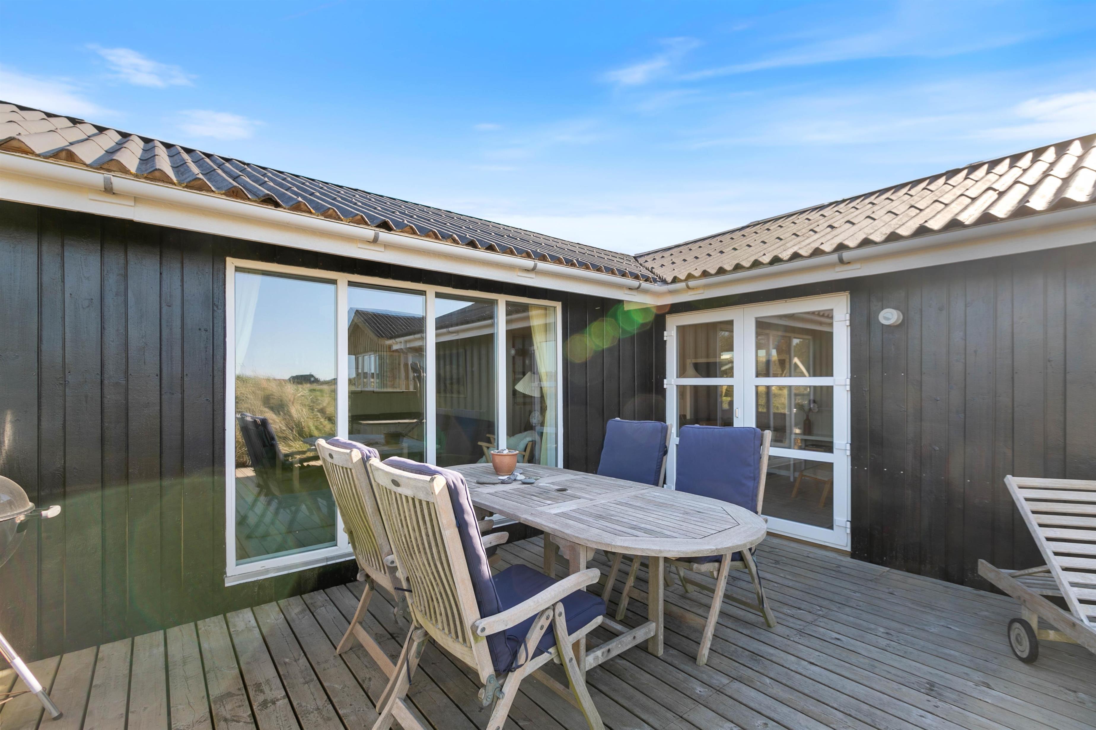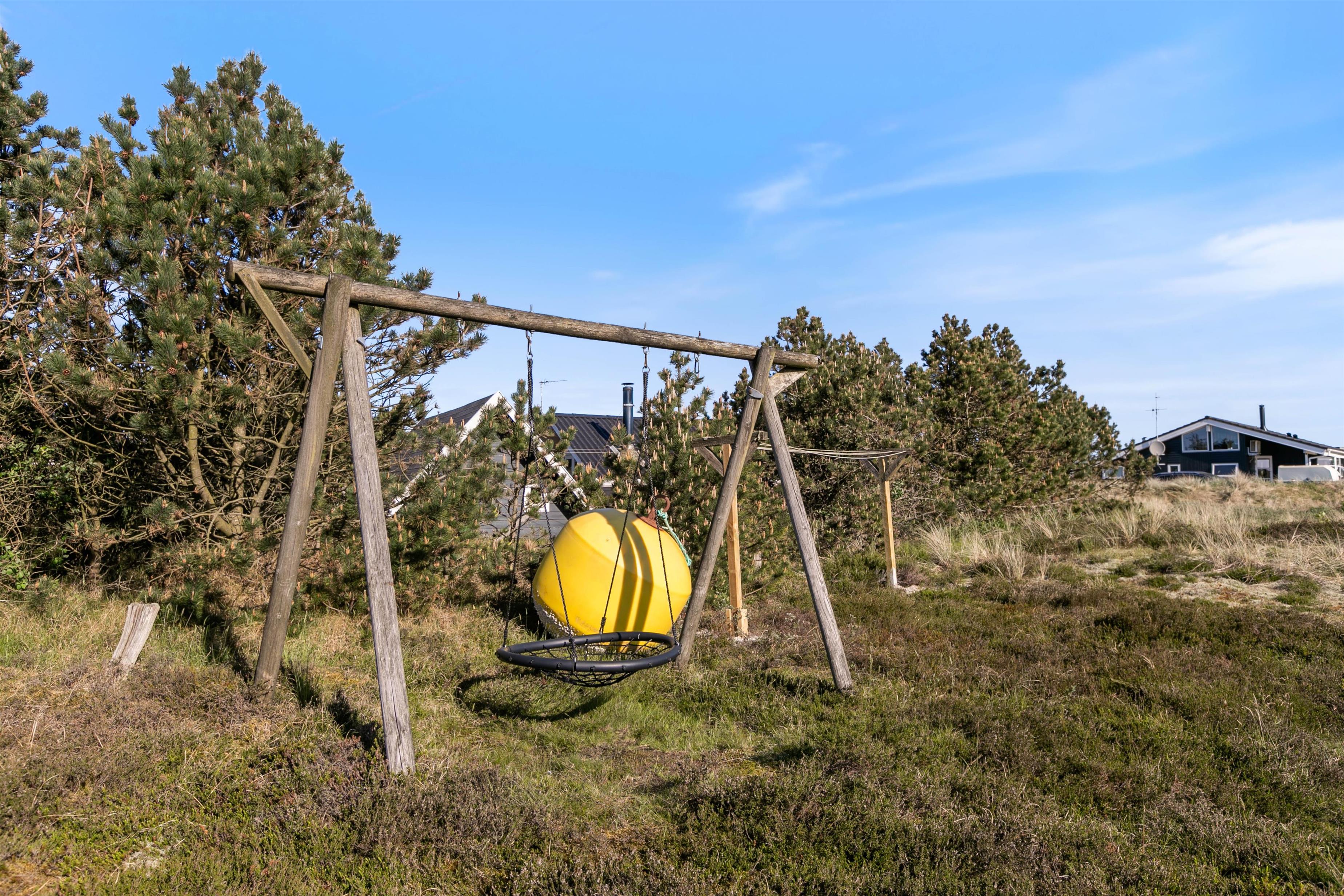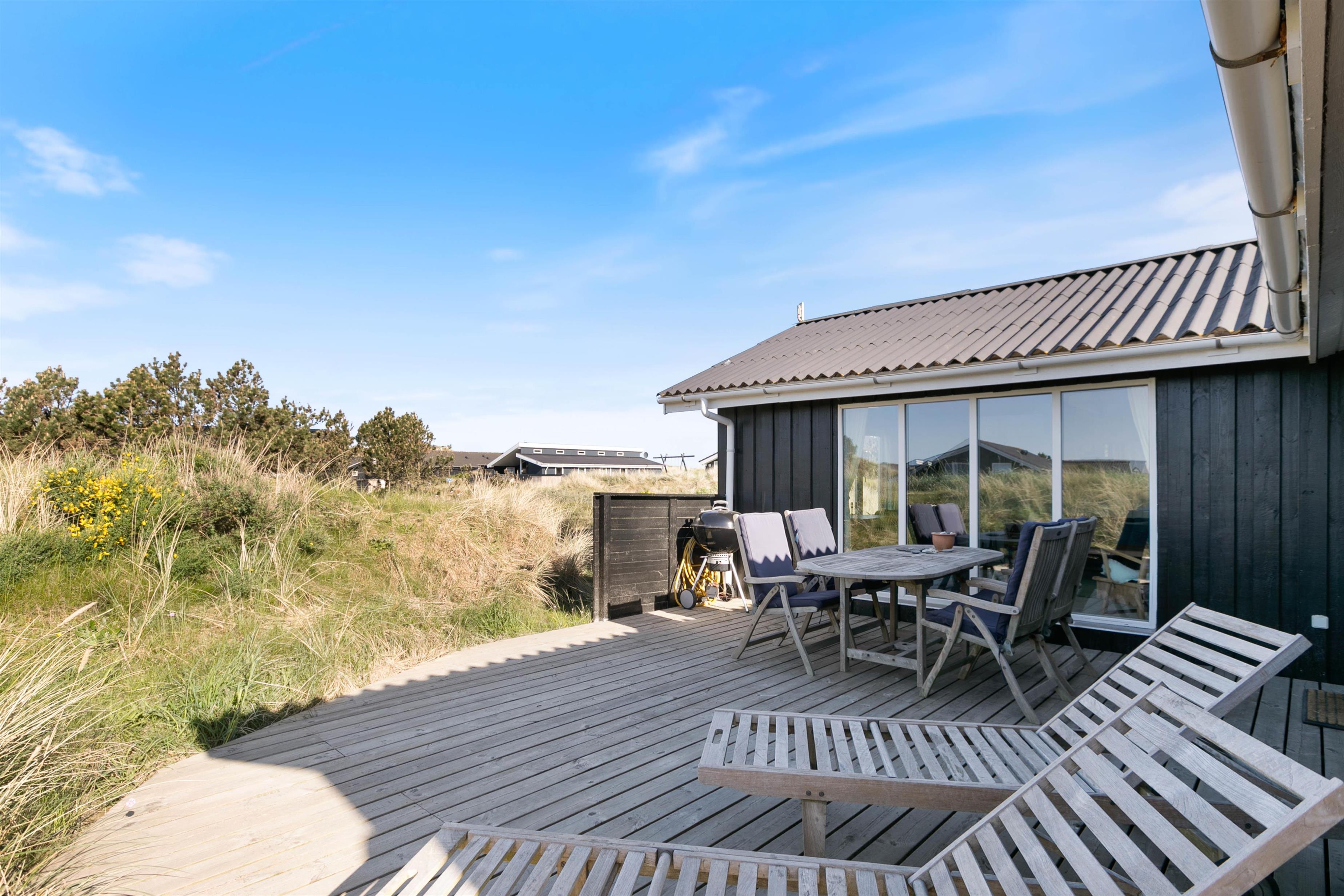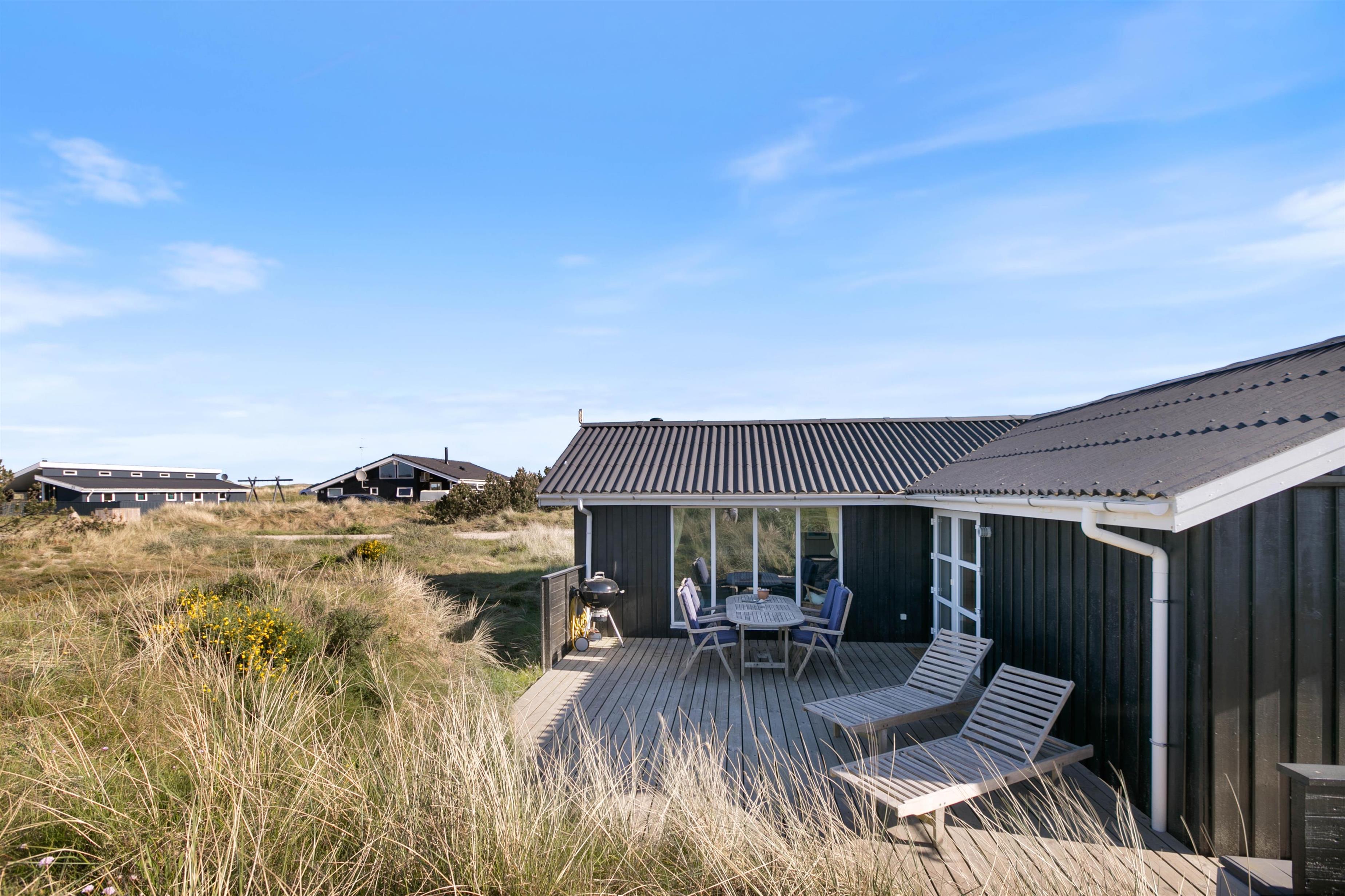 Terrassen omkring sommerhuset er delvist afskærmet, så du kan altid finde en rolig plet, hvor du kan sidde med en god bog. Slap af i de komfortable havemøbler, imens børnene udforsker naturgrunden eller leger på gyngerne. Om aftenen kan I slutte af med en lækker BBQ, imens solen går ned bag klitterne.