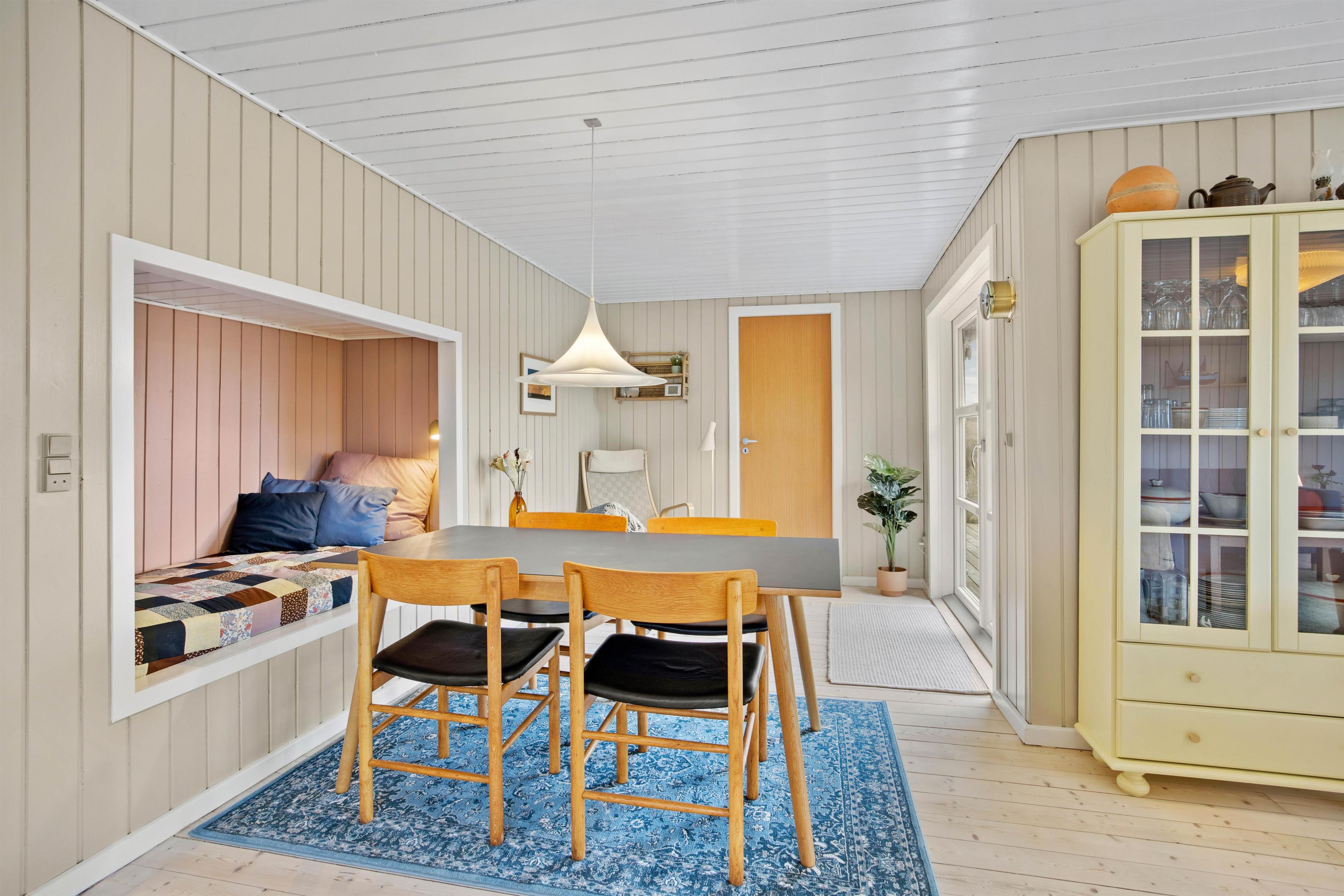 I forbindelse med stuen ligger det åbne køkken med spiseplads. Indretningen gør, at I fra spisebordet kan følge med i, hvad der sker i både køkken og stue. I køkkenet er alt, hvad du behøver, for at tilberede et lækkert måltid, inklusive opvaskemaskine. Desuden er her en alkove, hvor du kan tage et velfortjent hvil i løbet af dagen, eller børnene kan lege, imens maden tilberedes.