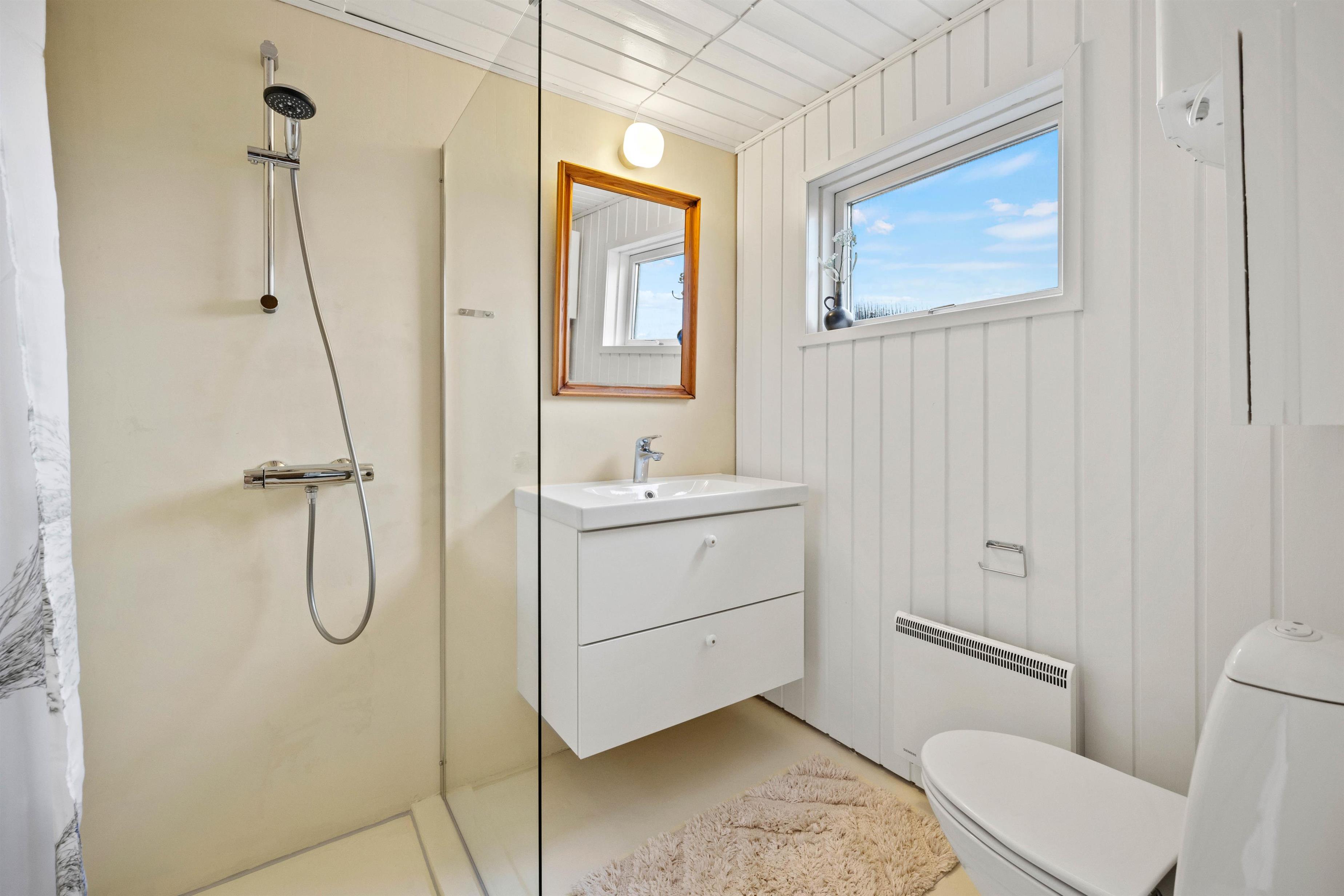 I badeværelset med gulvvarme er en bruseniche. Desuden er der en energibesparende varmepumpe i sommerhuset.