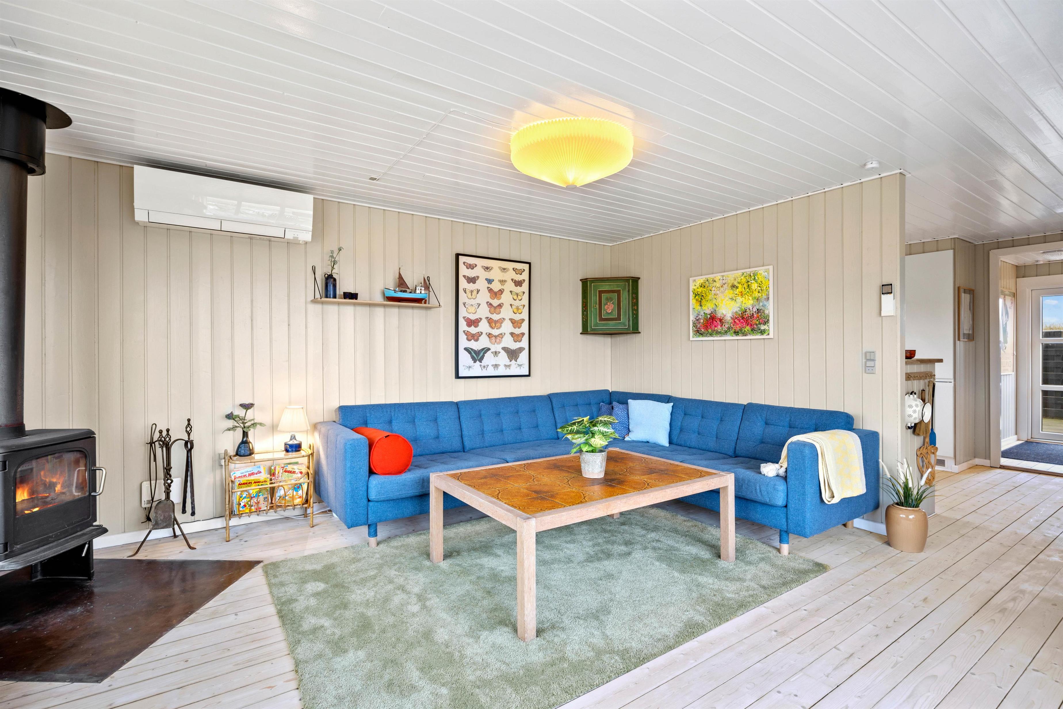 Indretningen i sommerhuset på Baunebjergvej 21 er nænsomt koordineret med henblik på at skabe et harmonisk helhedsbillede. Det fine lysindfald fra brede vinduespartier bidrager til den helt rigtige feriestemning. I den charmerende opholdsstue finder du en komfortabel sofa, hvor du kan slappe af med en god film og en varm te. Der er 2 Apple TV og en Playstation i feriehuset, så der burde være muligheder nok for at finde noget, I kan lide. Tænder I samtidig op i brændeovnen, er hyggestemningen perfekt.