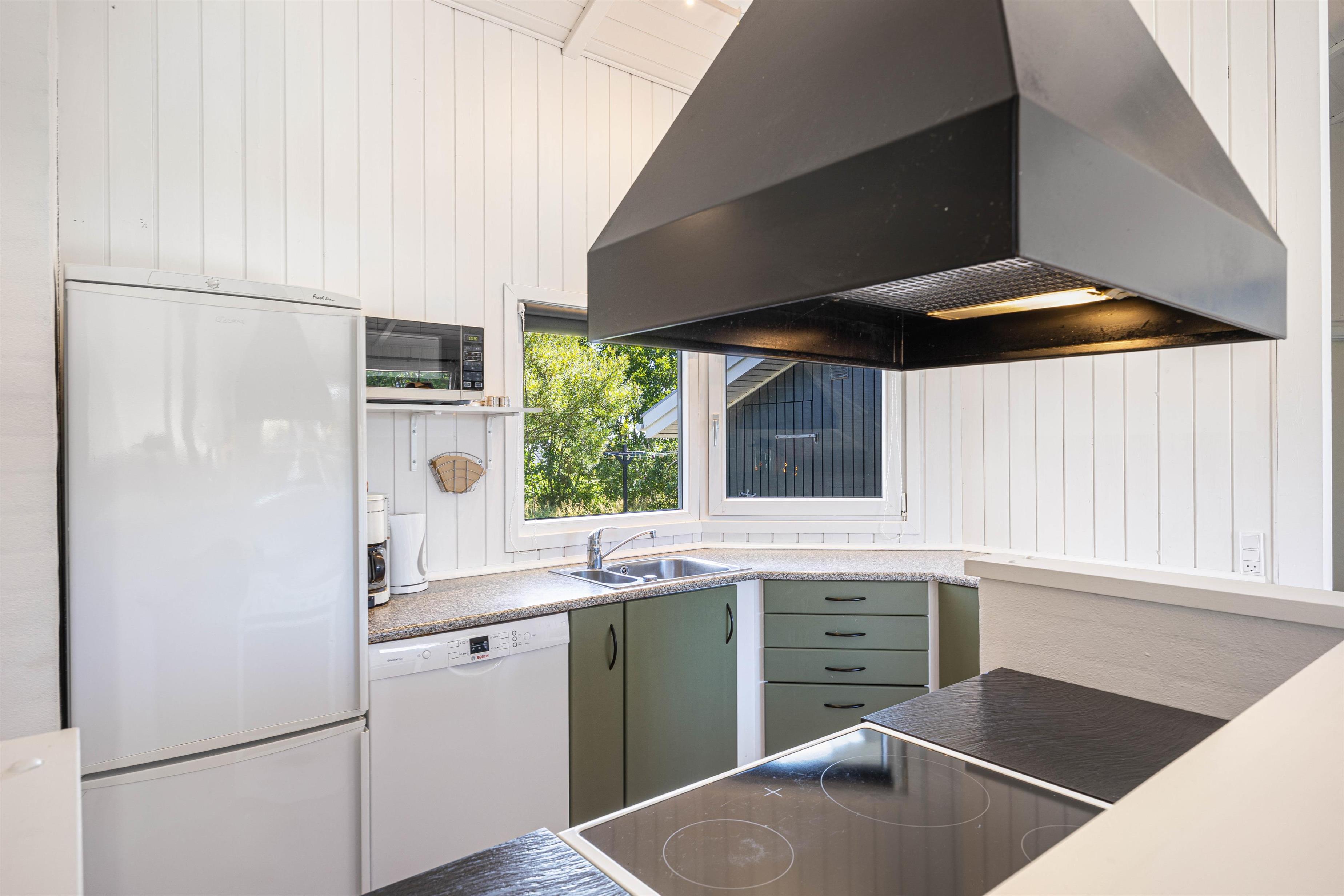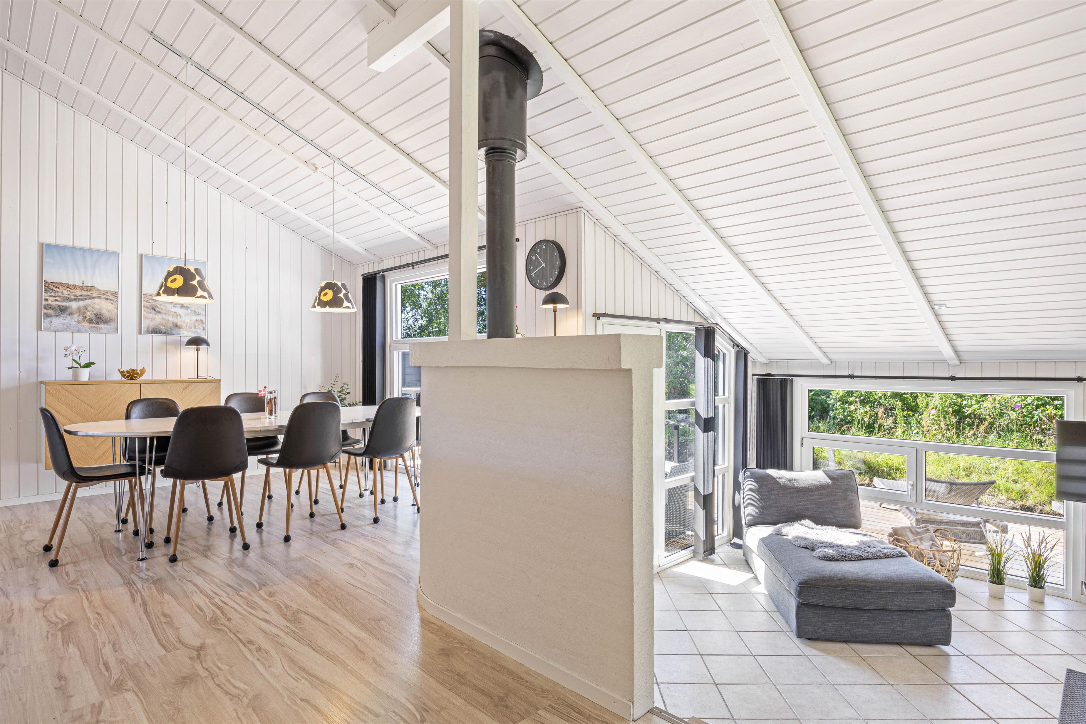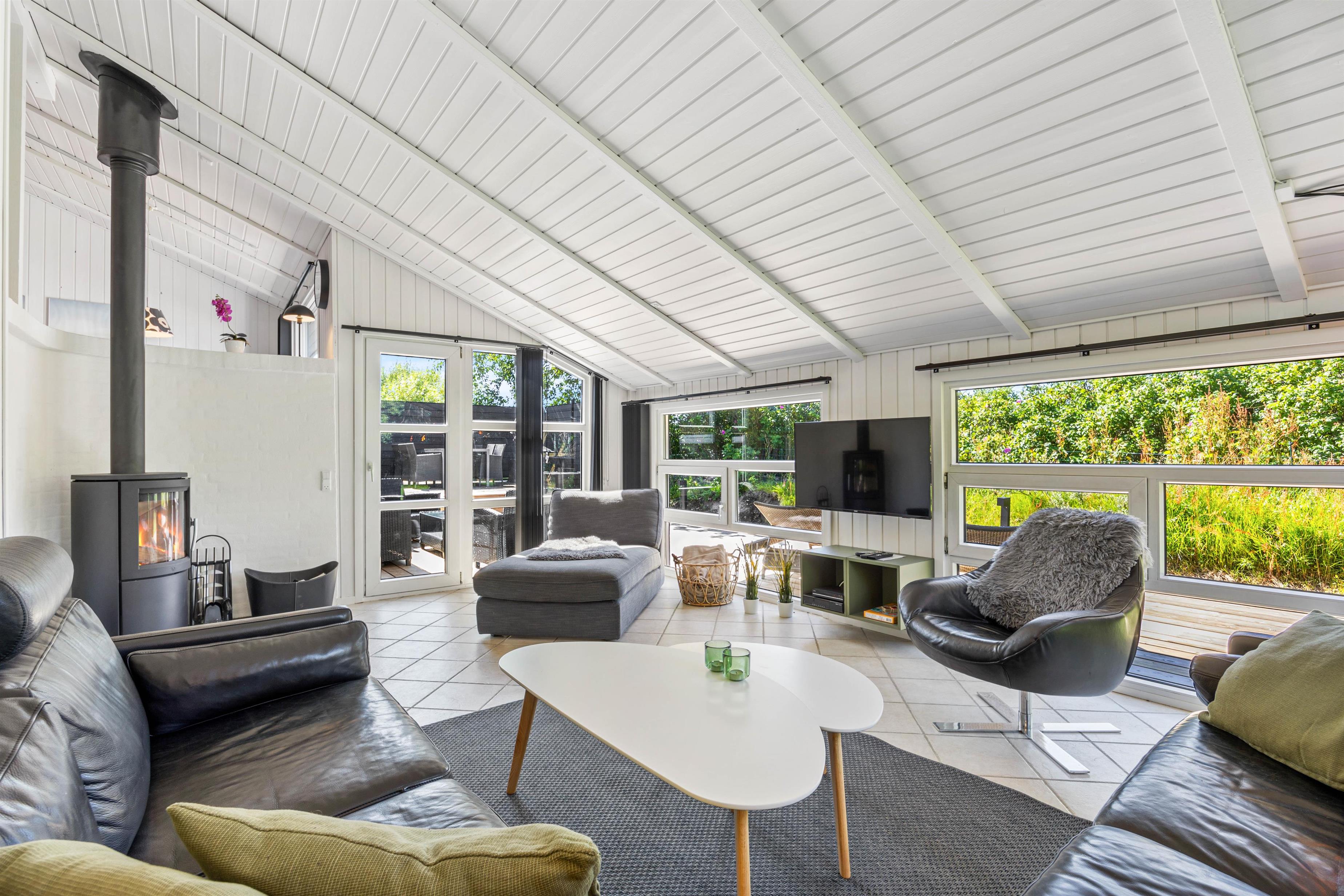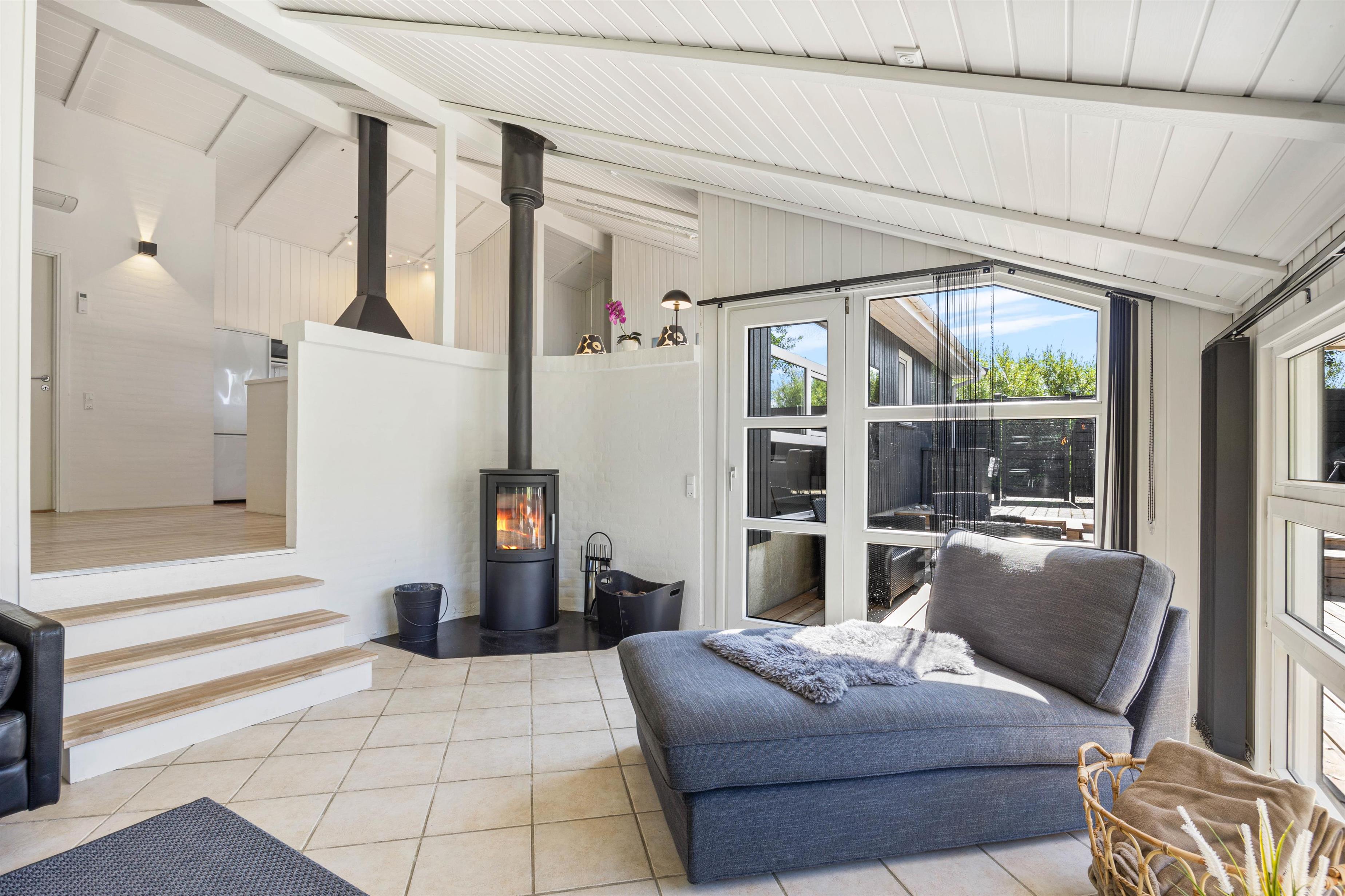 Sommerhusets hjerte er det åbne opholdsrum, der binder køkken og stue sammen. Vær sammen om madlavningen, spil brætspil eller find en sjov film i tv’et – mulighederne er mange. Brændeovnen fuldender den gode feriestemning med sin knitren i baggrunden, og ellers sørger en energivenlig luft-til-luft varmepumpe for et behageligt indeklima i sommerhuset. Også her er en stige til hemsen, der kan er en hyggelig krog for børnene.
