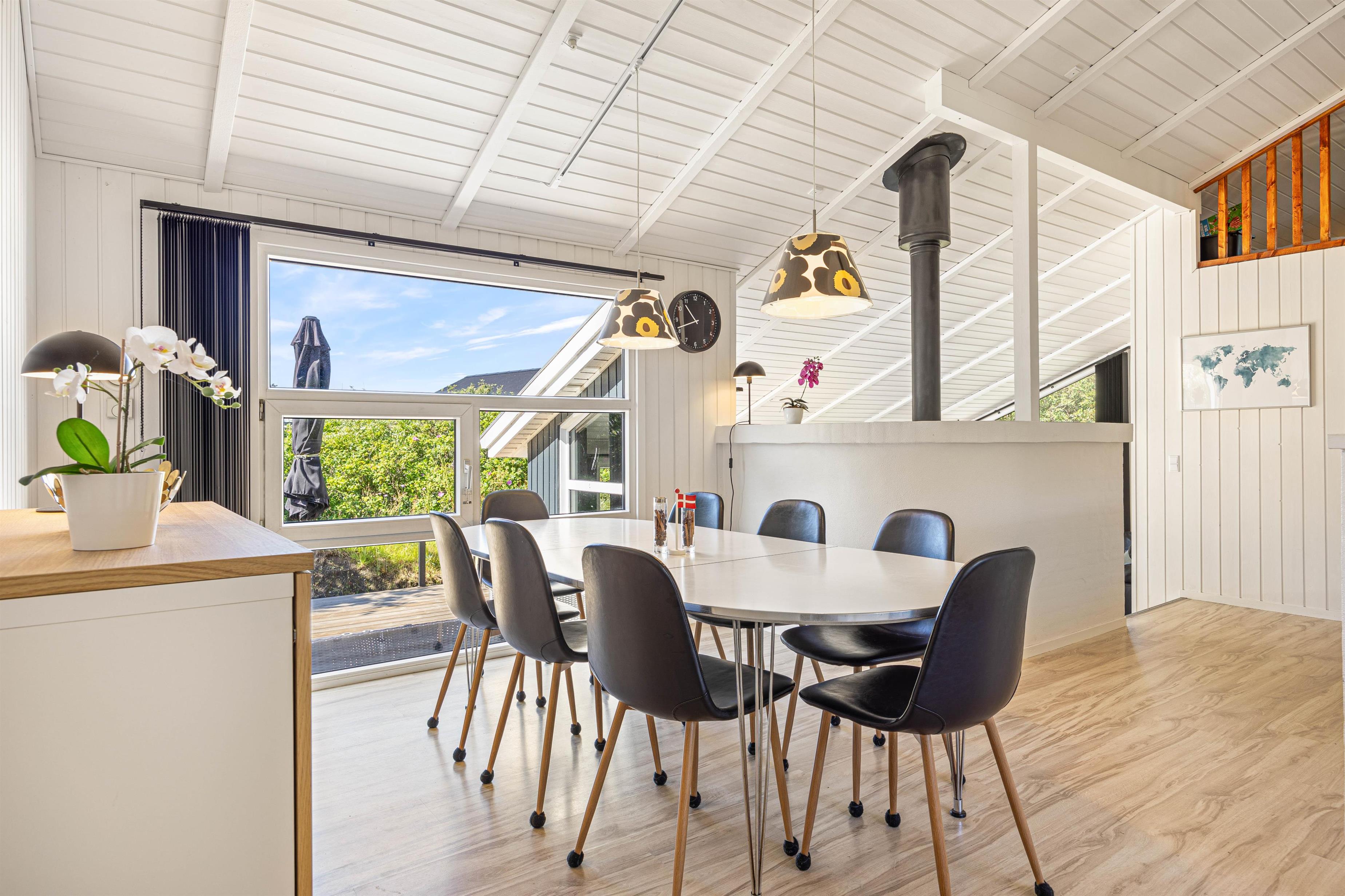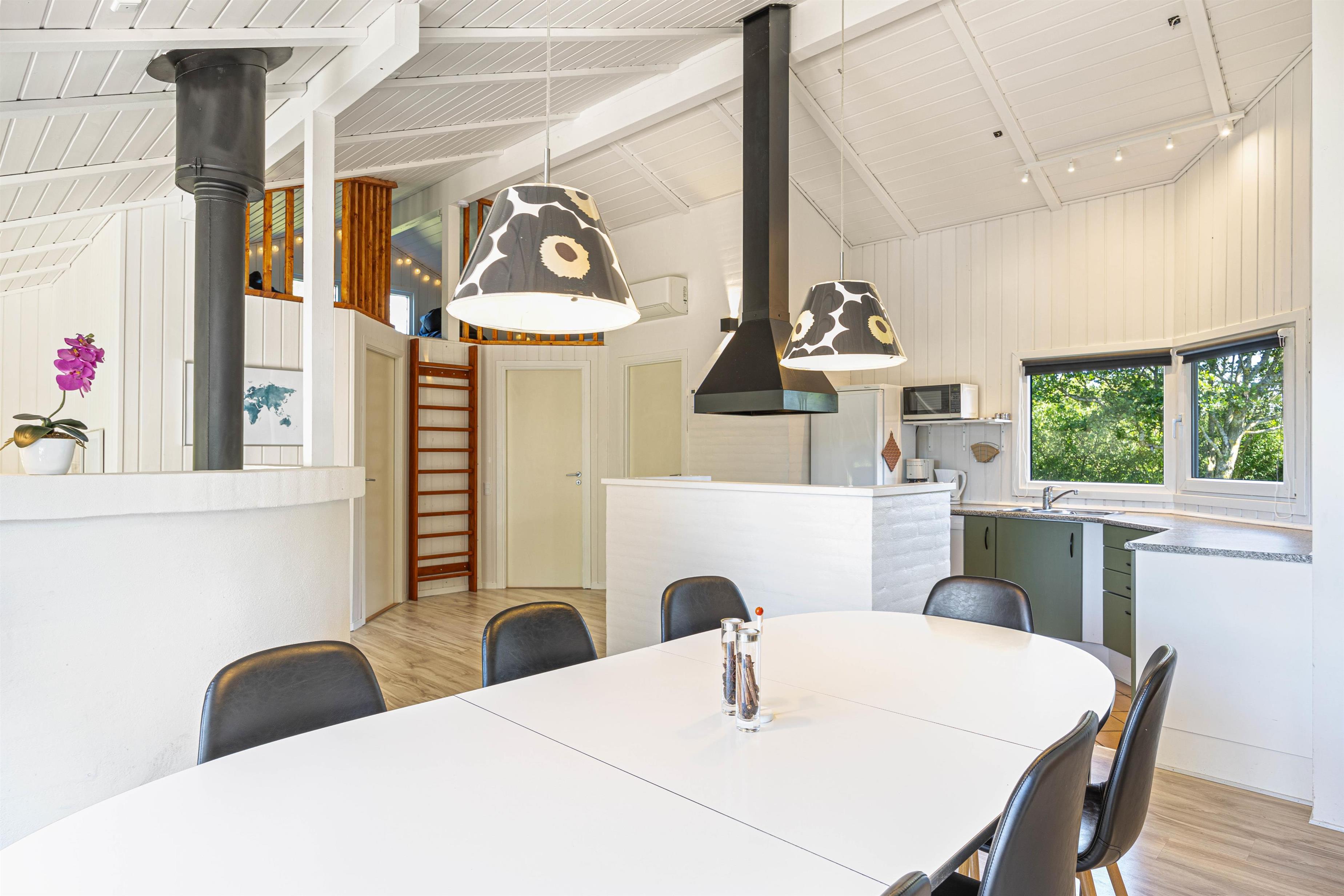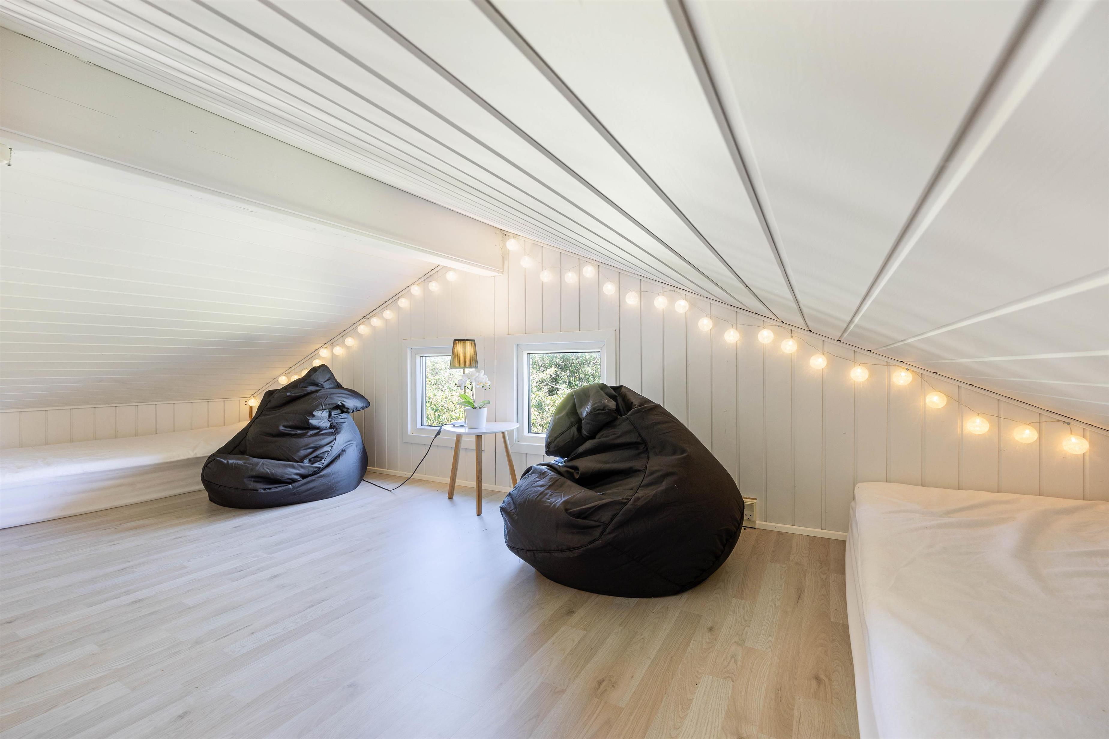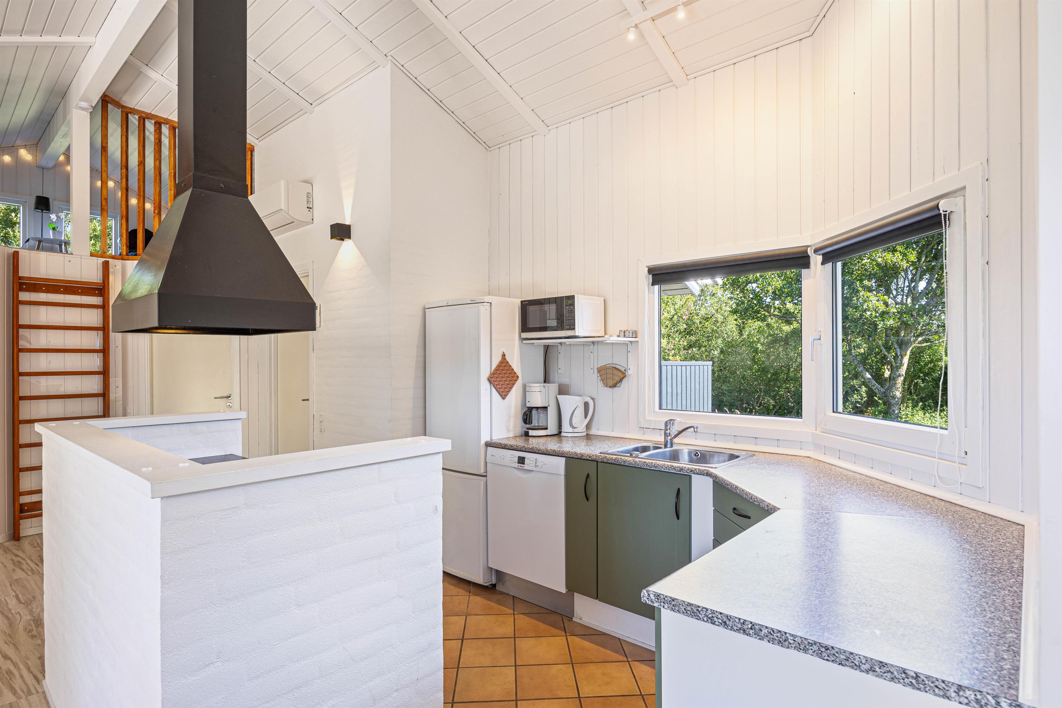 Sommerhusets hjerte er det åbne opholdsrum, der binder køkken og stue sammen. Vær sammen om madlavningen, spil brætspil eller find en sjov film i tv’et – mulighederne er mange. Brændeovnen fuldender den gode feriestemning med sin knitren i baggrunden, og ellers sørger en energivenlig luft-til-luft varmepumpe for et behageligt indeklima i sommerhuset. Også her er en stige til hemsen, der kan er en hyggelig krog for børnene.