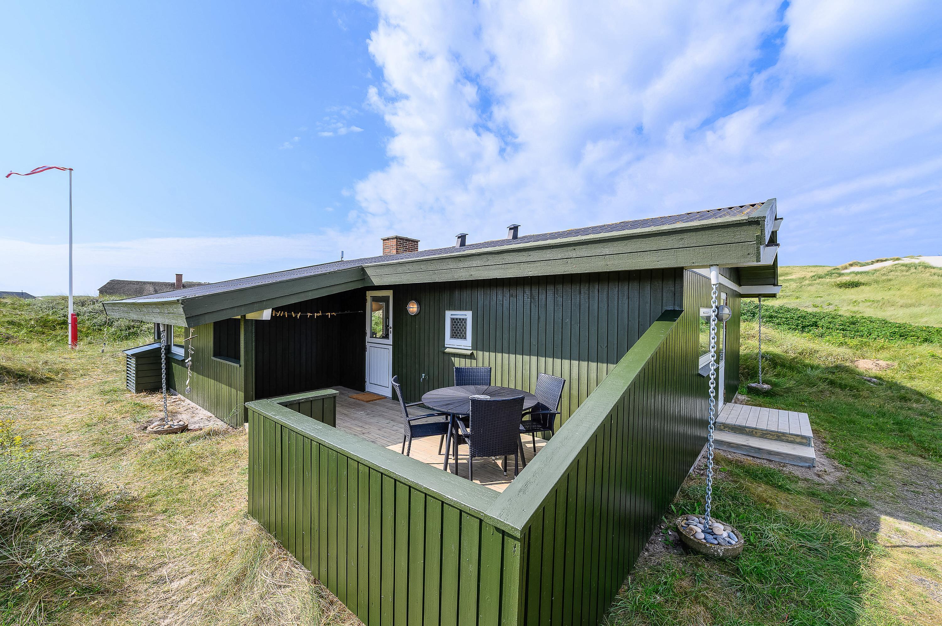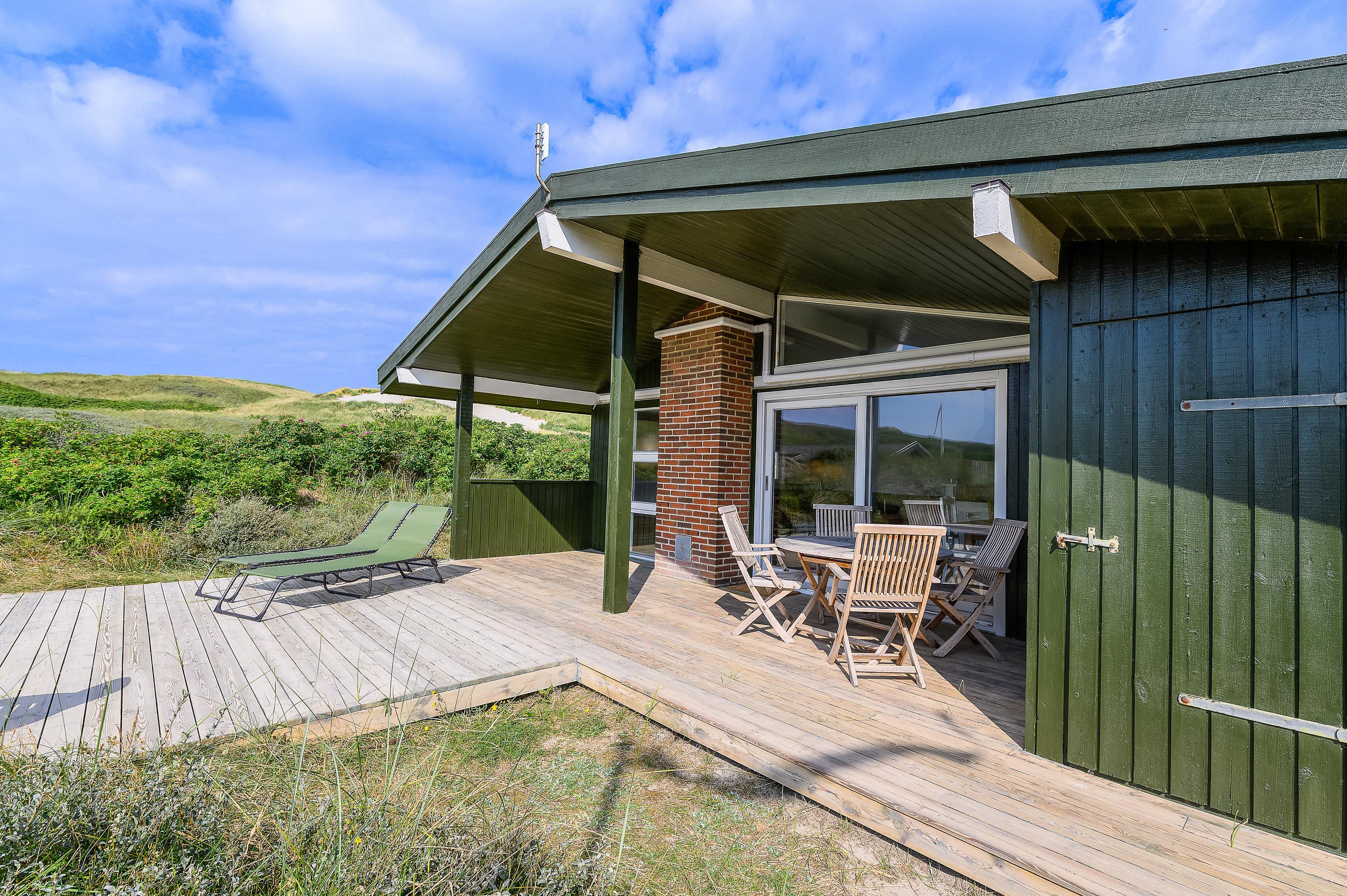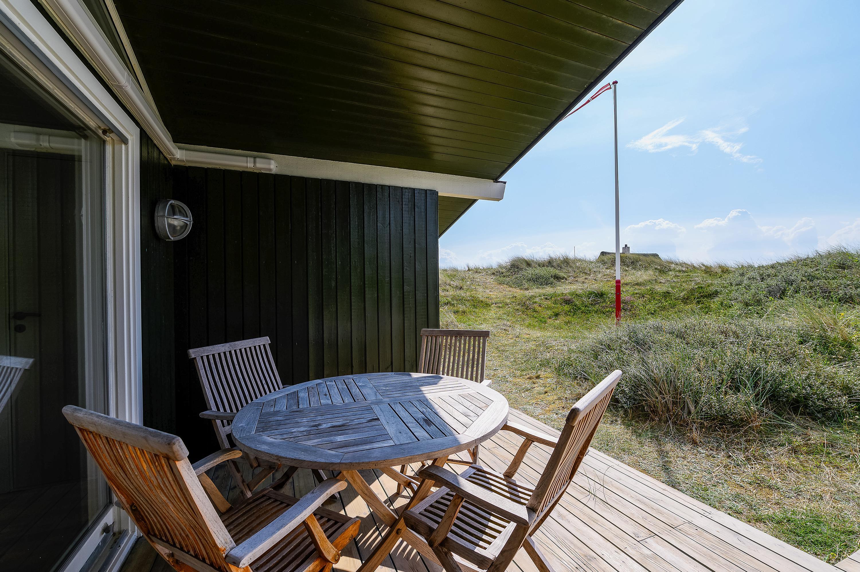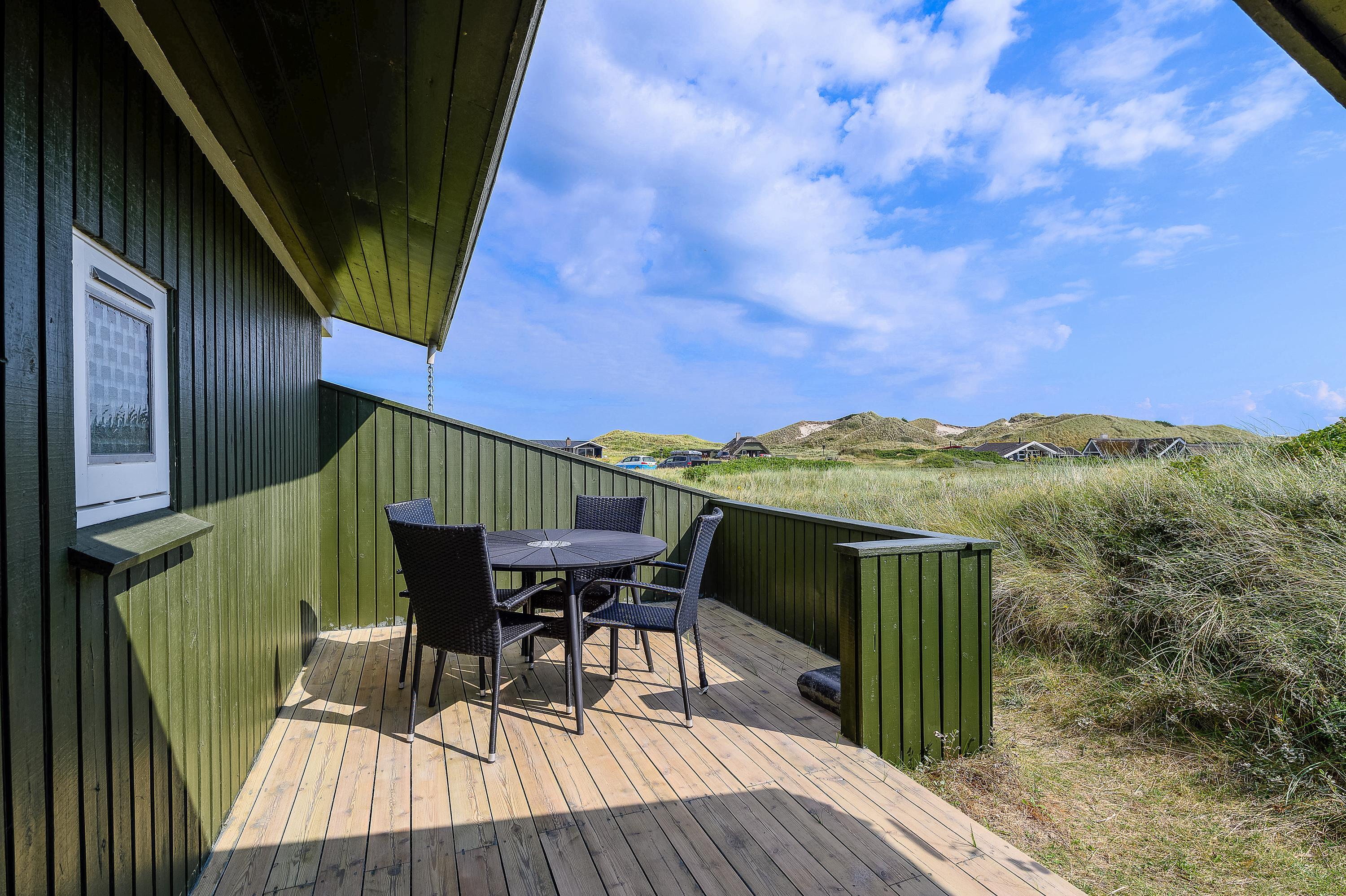 På den skønne naturgrund midt i klitterne i Haurvig venter en åben og delvist overdækket terrasse, hvorfra I kan nyde solen på varme sommerdage. Hør lyden af Vester??havet, mens du slapper af på enten havemøblerne eller liggestolene med et køligt, forfriskende glas vin.