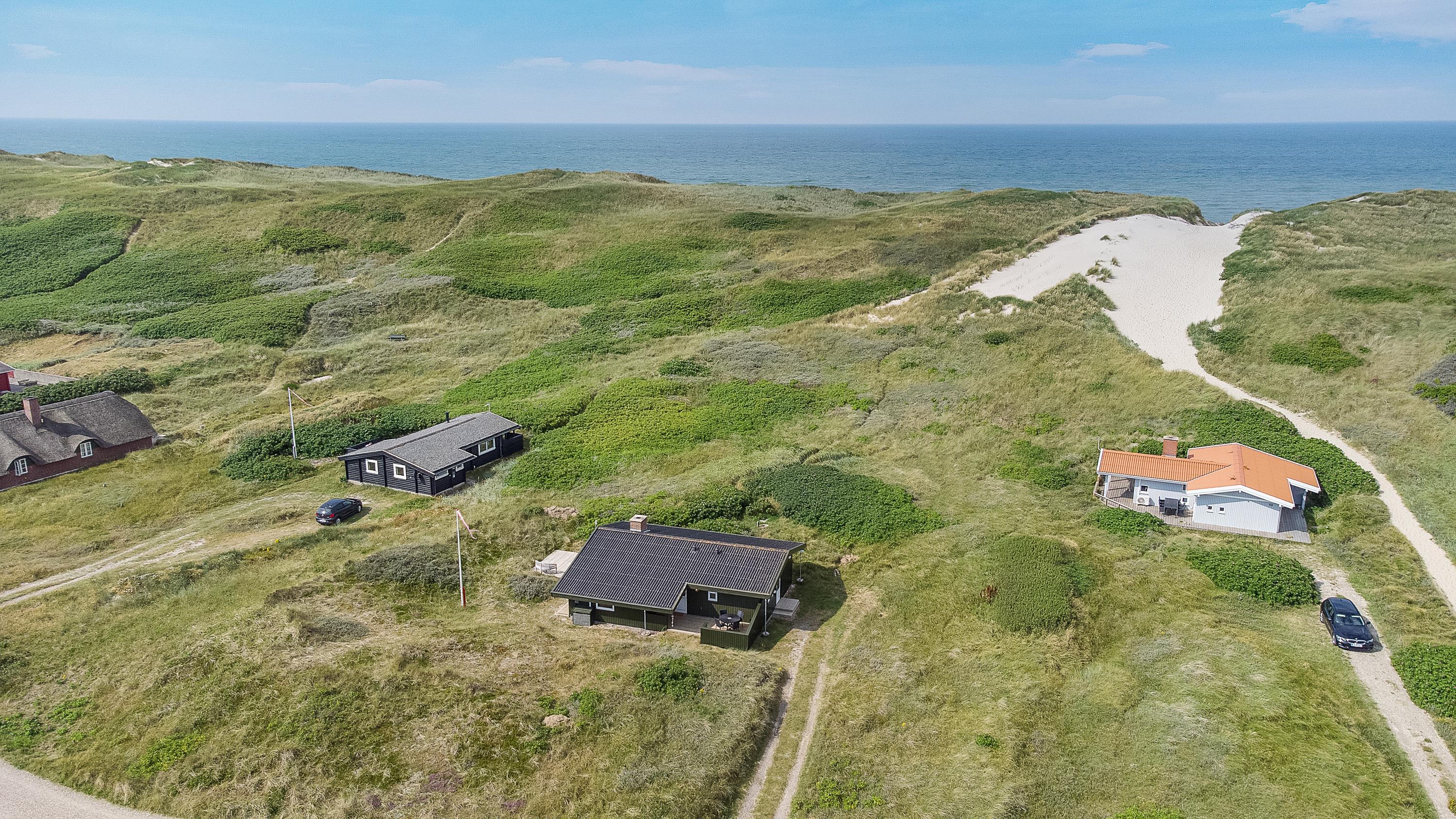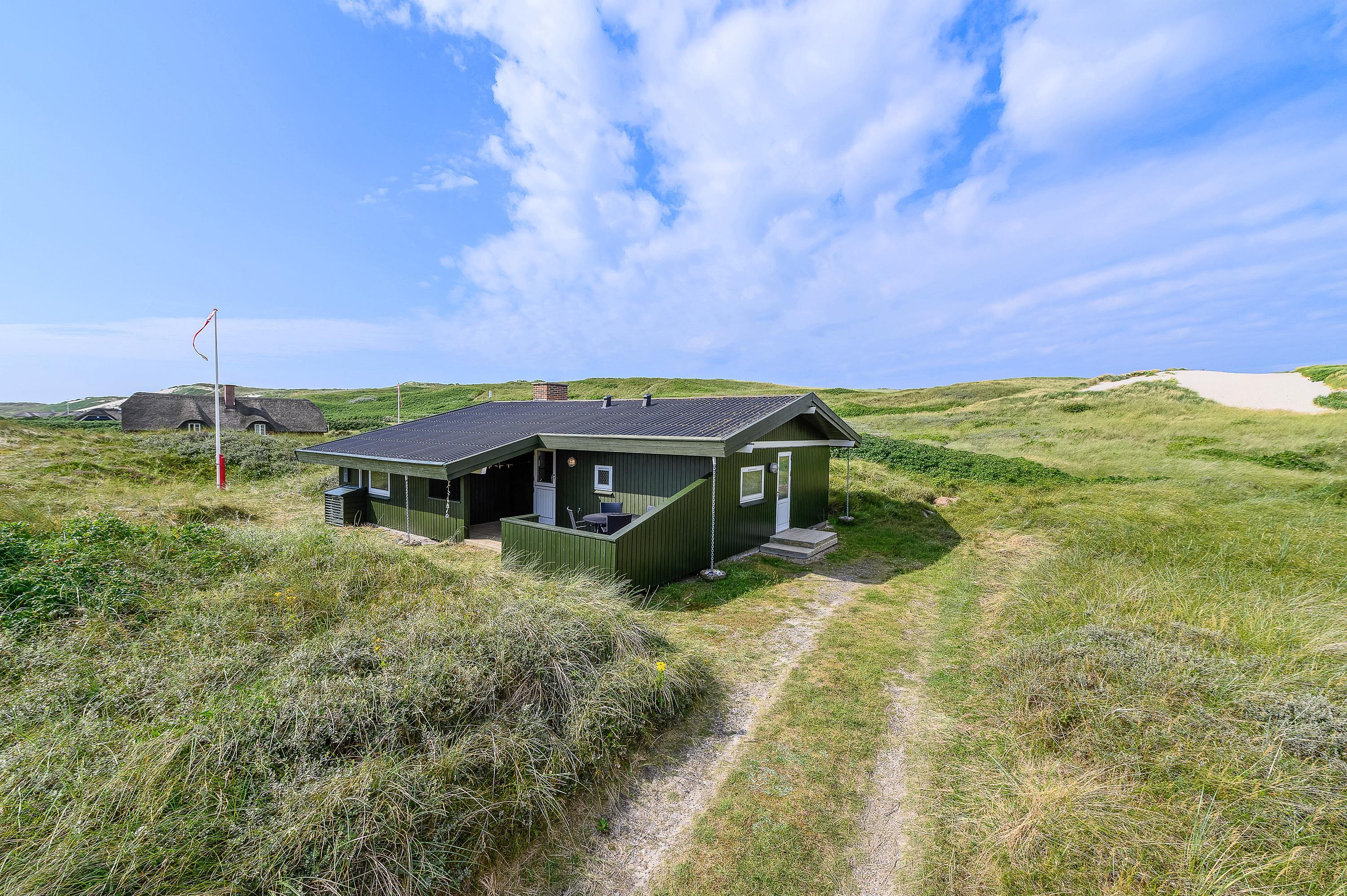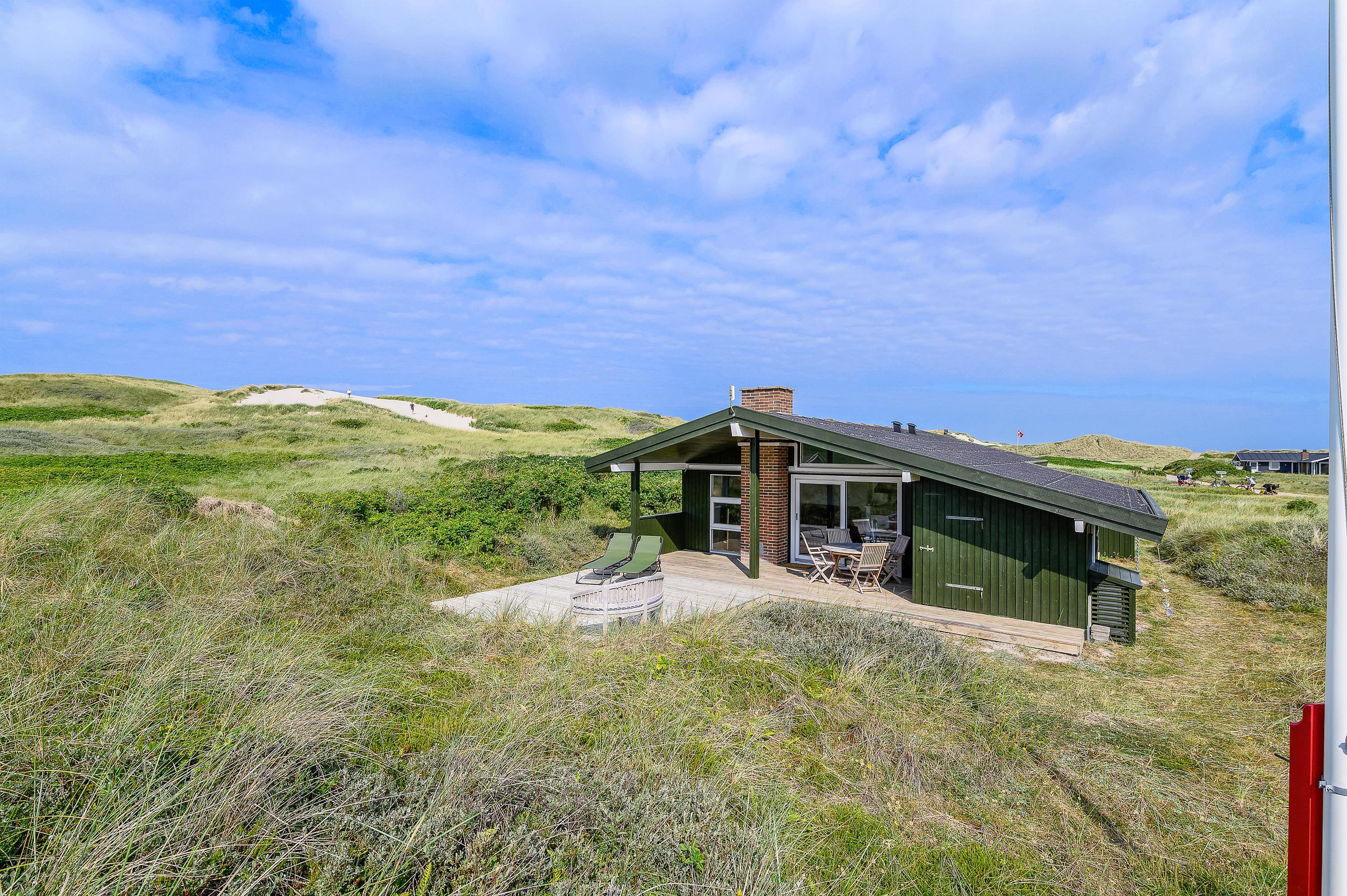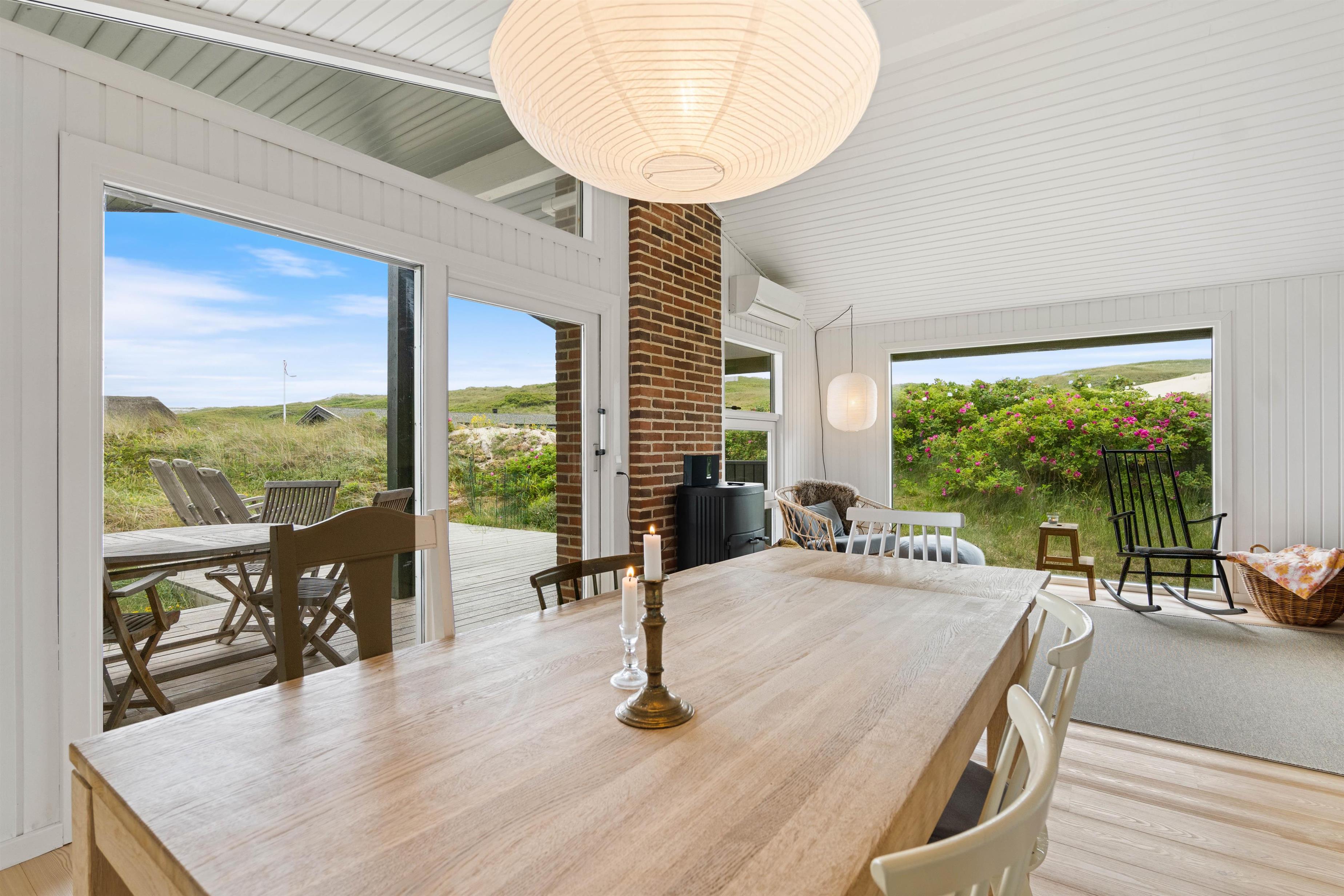 På den skønne naturgrund midt i klitterne i Haurvig venter en åben og delvist overdækket terrasse, hvorfra I kan nyde solen på varme sommerdage. Hør lyden af Vester??havet, mens du slapper af på enten havemøblerne eller liggestolene med et køligt, forfriskende glas vin.
