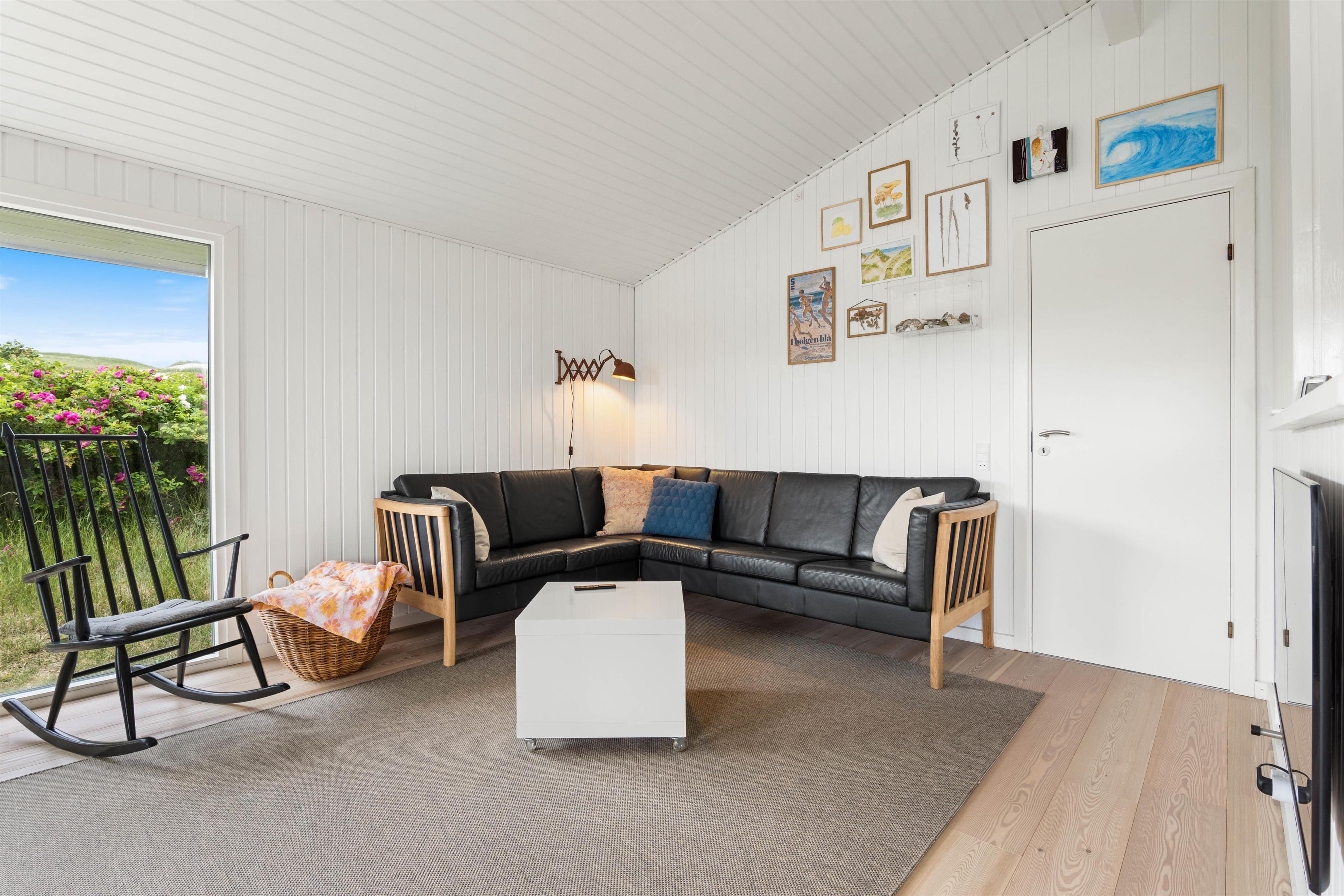 Sommerhusets samlingsrum er det lyse og indbydende opholdsrum, som byder plads til hele familien. Her kan I samles til en hyggelig aften med et spil kort eller en filmaften. Sommerhuset har både TV2 Play, Yousee og HBO MAX, der kan tilgås direkte fra fjernsynet. Der er et stort, vestvendt panoramavindue, som giver jer en skøn udsigt over området og samtidig et godt lysindfald i rummet.