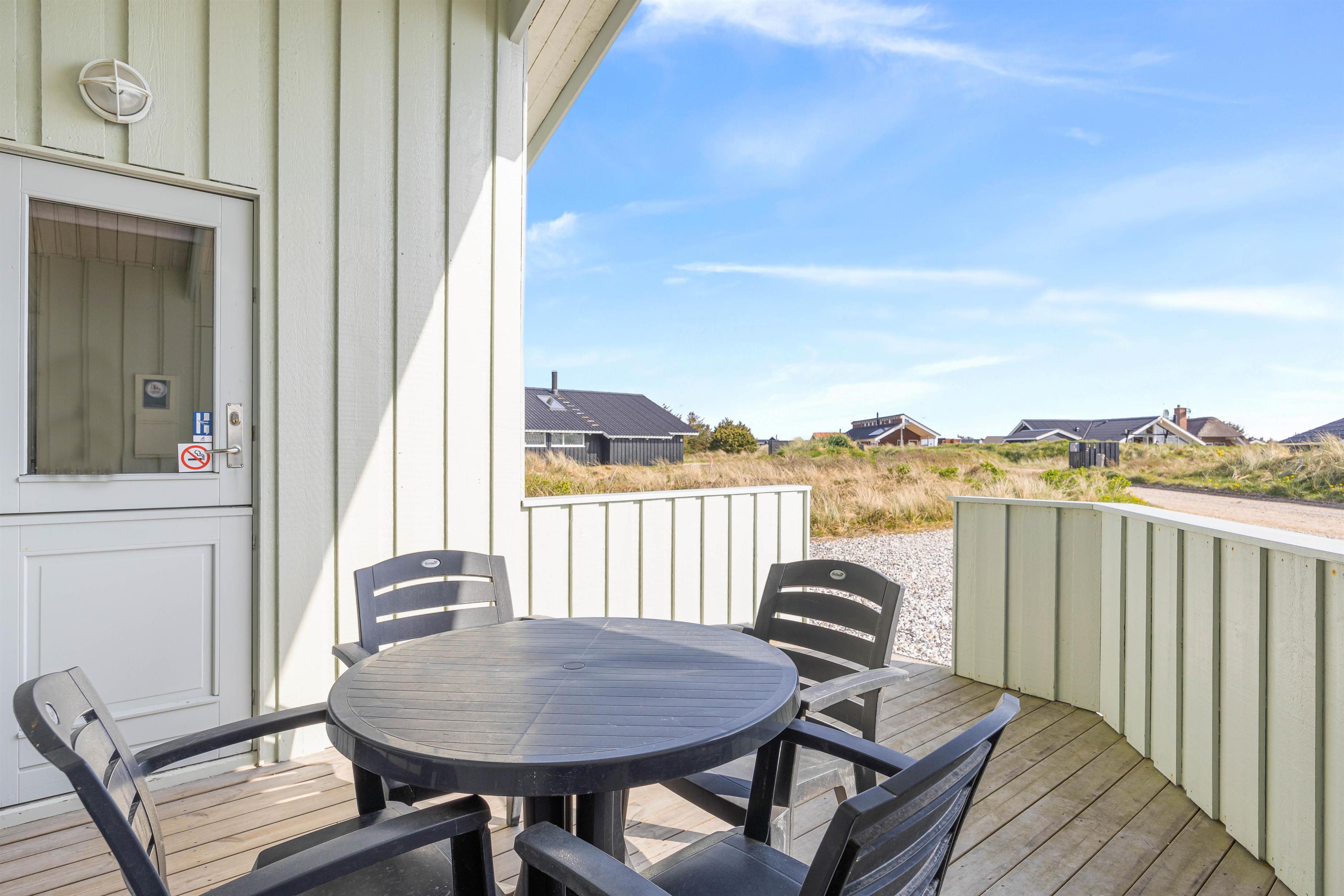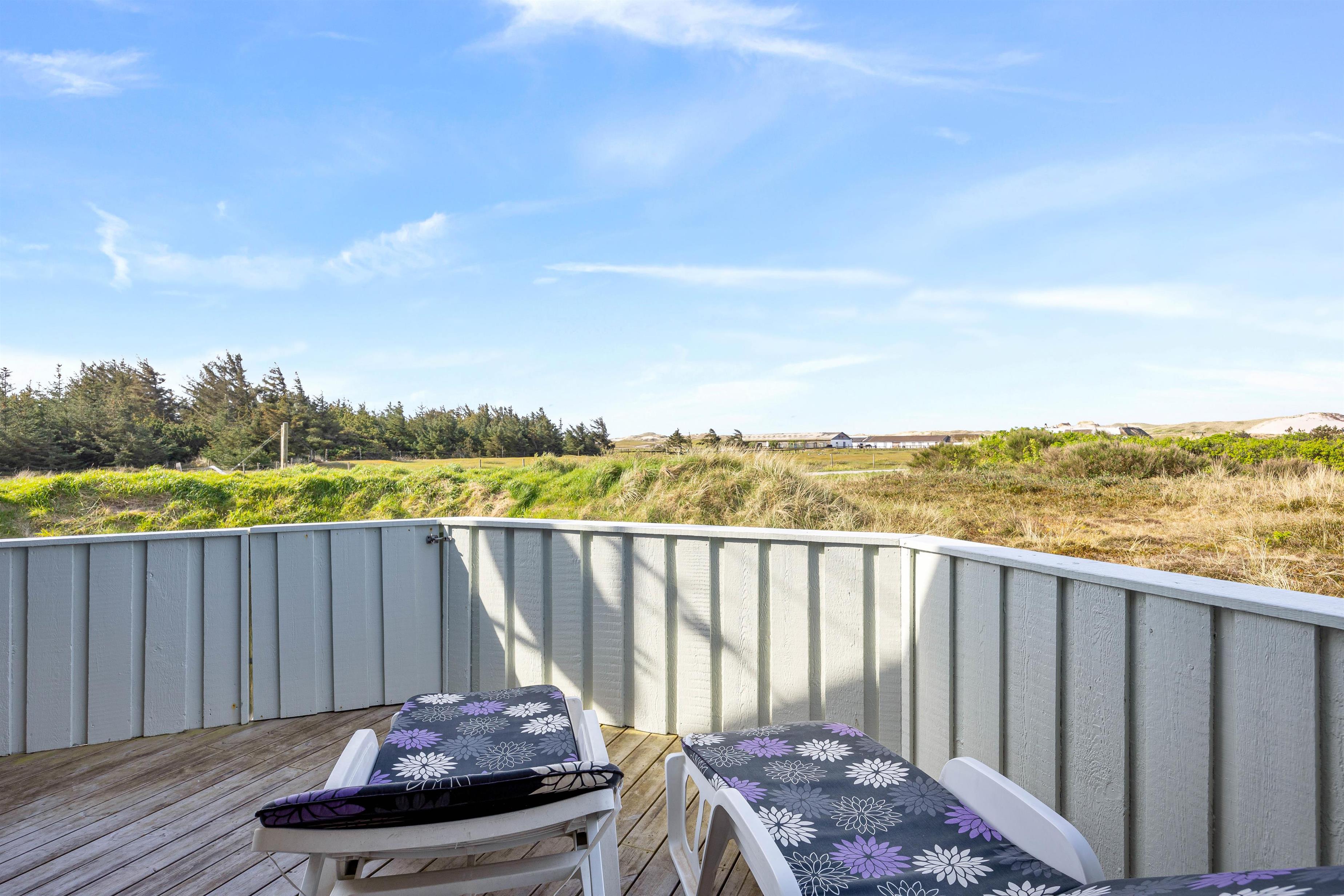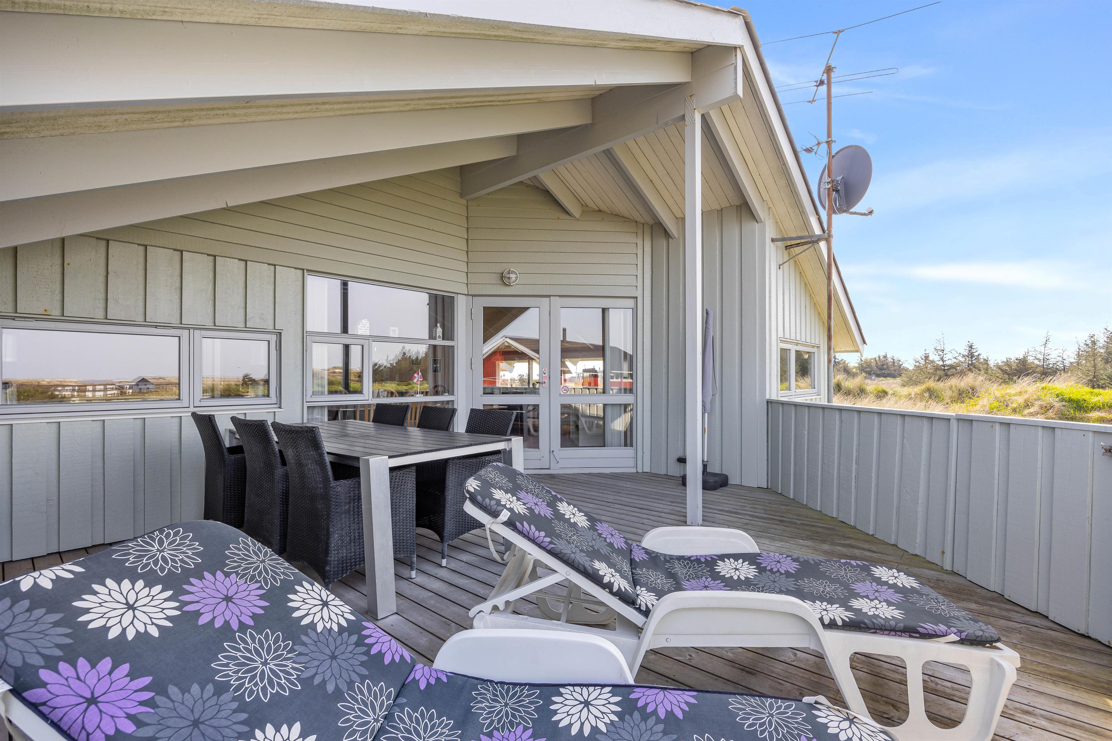 Fra opholdsområdet kan I gå ud på den lukkede og delvist overdækkede terrasse. Her kan I lade de små børn lege frit, uden at de kommer ud på den store naturgrund. Behagelige havemøbler og liggestole indbyder til afslapning. Nyd en forfriskning og den friske havluft, mens børnene leger på gyngen eller spiller vikingeskak. Afslut feriedagen med at tilberede aftensmaden på grillen og nyd den under åben himmel. I kan stadig nå en hyggelig gåtur til stranden og opleve solnedgangen i Vesterhavet før sengetid.