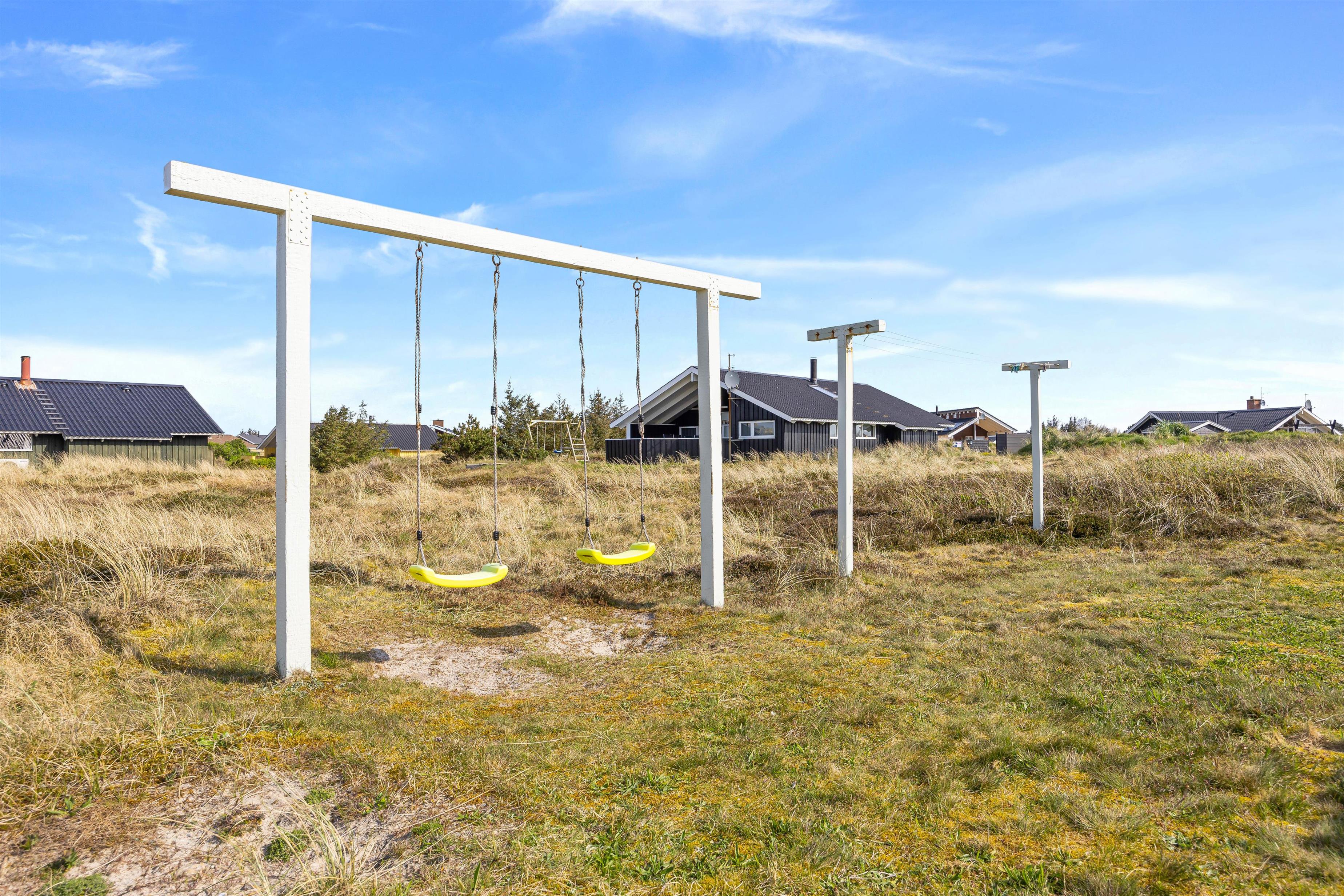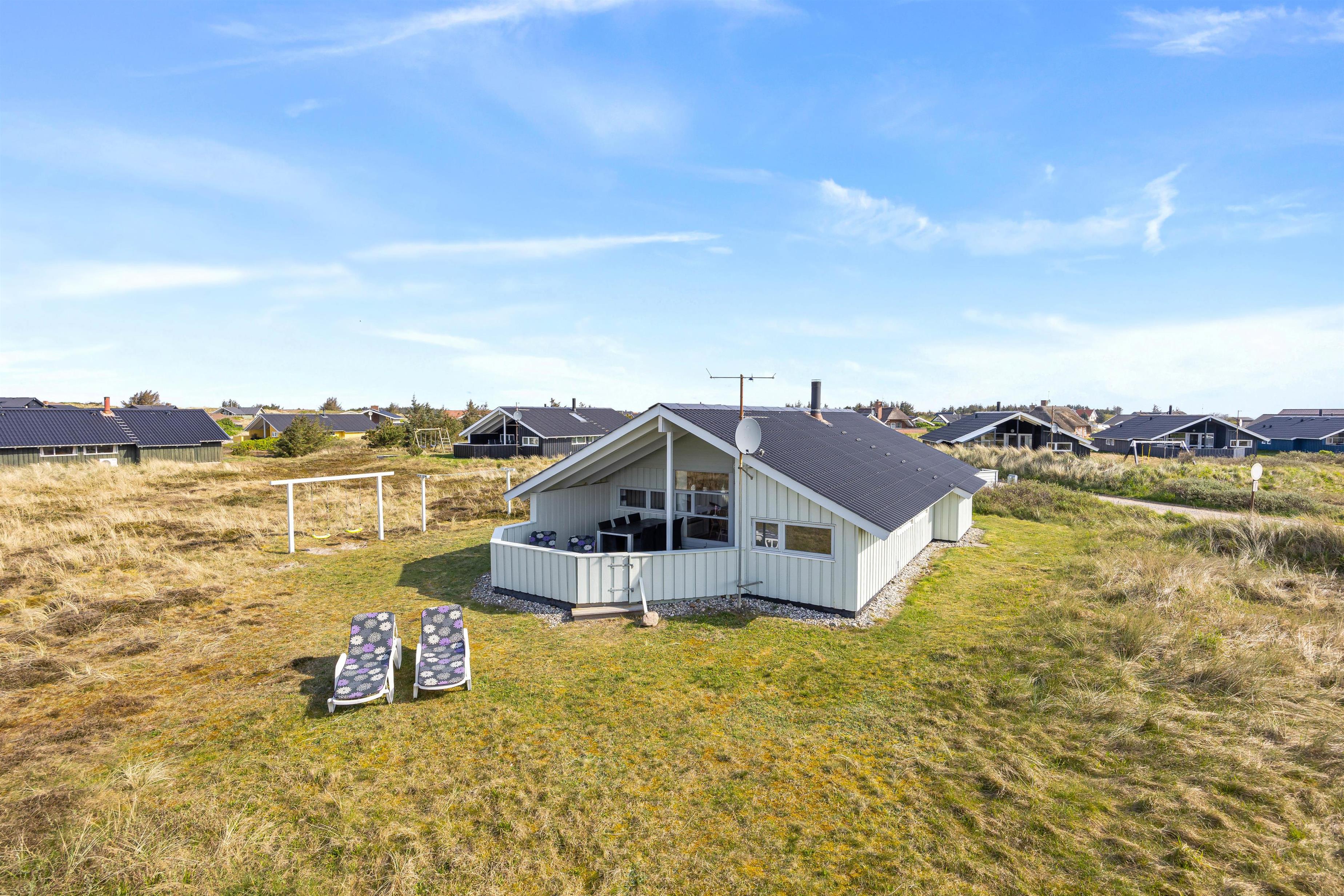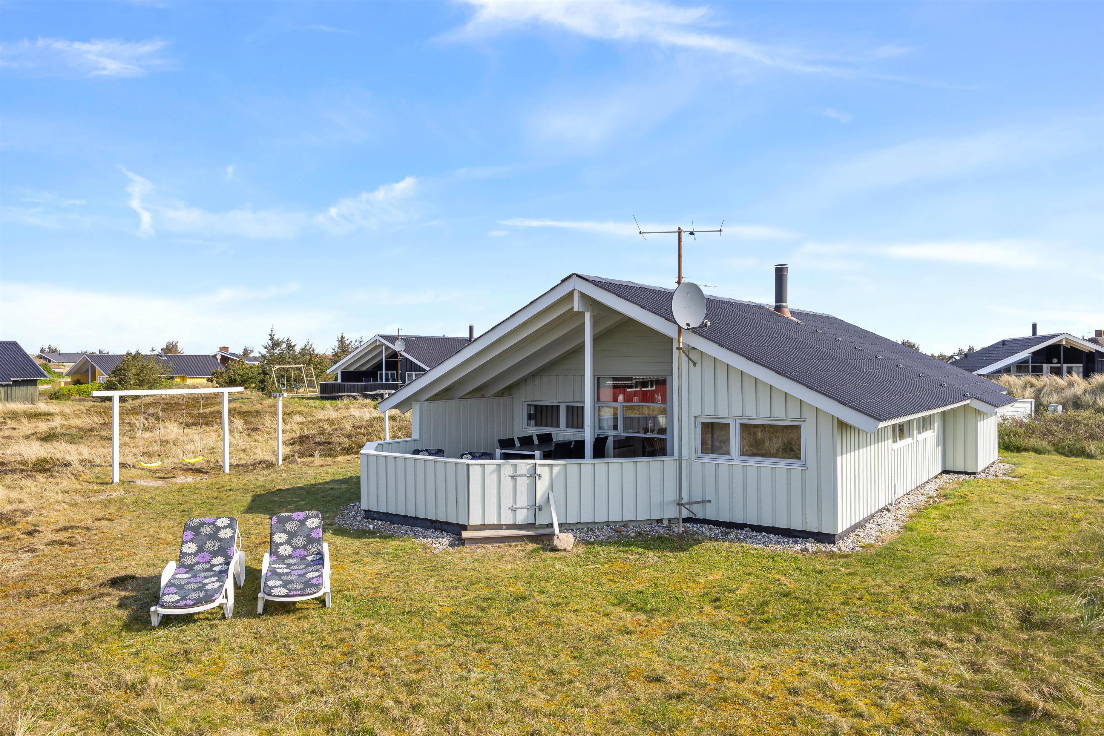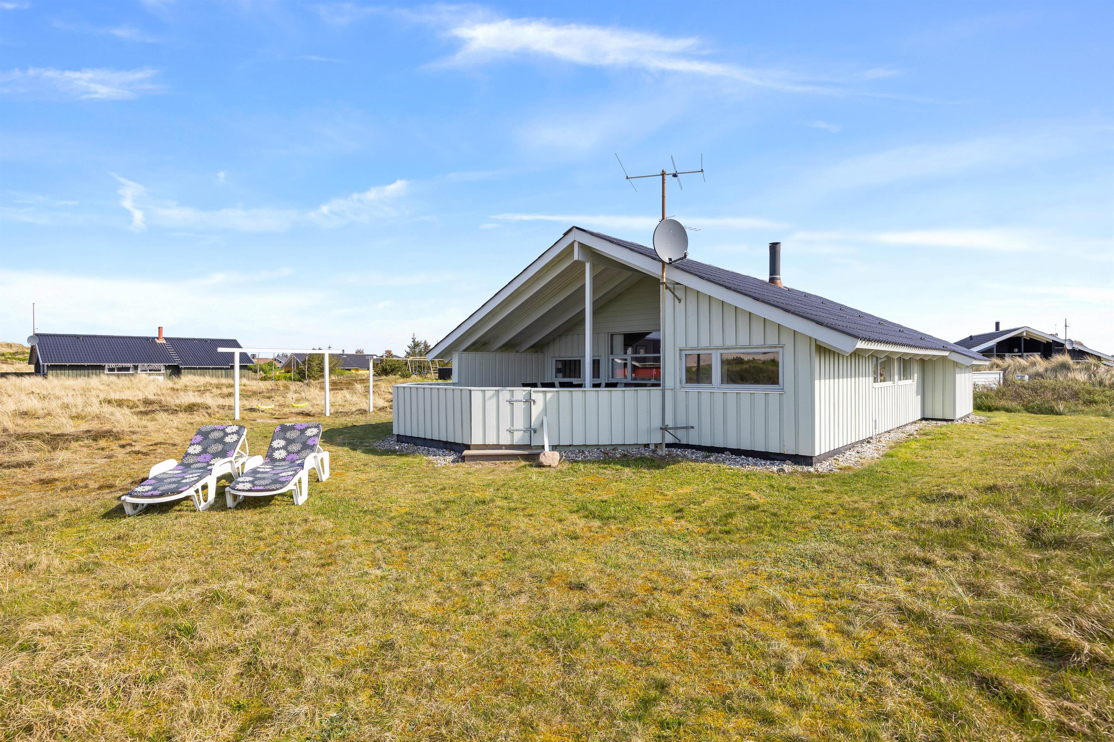 Fra opholdsområdet kan I gå ud på den lukkede og delvist overdækkede terrasse. Her kan I lade de små børn lege frit, uden at de kommer ud på den store naturgrund. Behagelige havemøbler og liggestole indbyder til afslapning. Nyd en forfriskning og den friske havluft, mens børnene leger på gyngen eller spiller vikingeskak. Afslut feriedagen med at tilberede aftensmaden på grillen og nyd den under åben himmel. I kan stadig nå en hyggelig gåtur til stranden og opleve solnedgangen i Vesterhavet før sengetid.