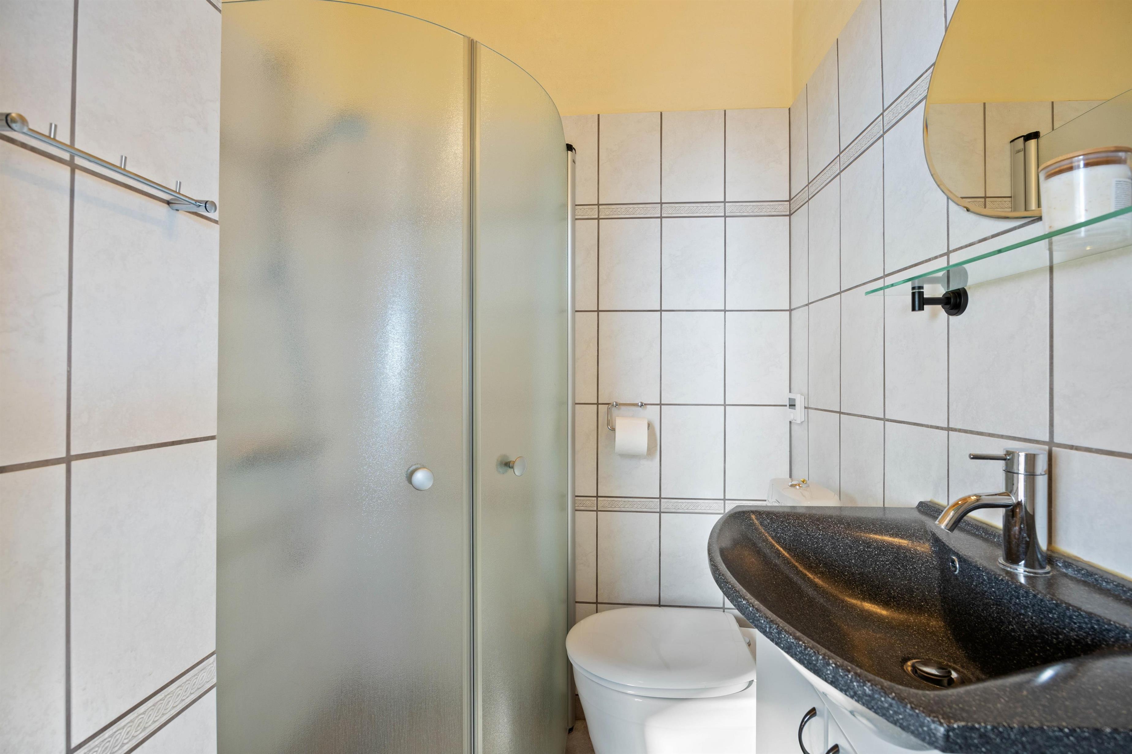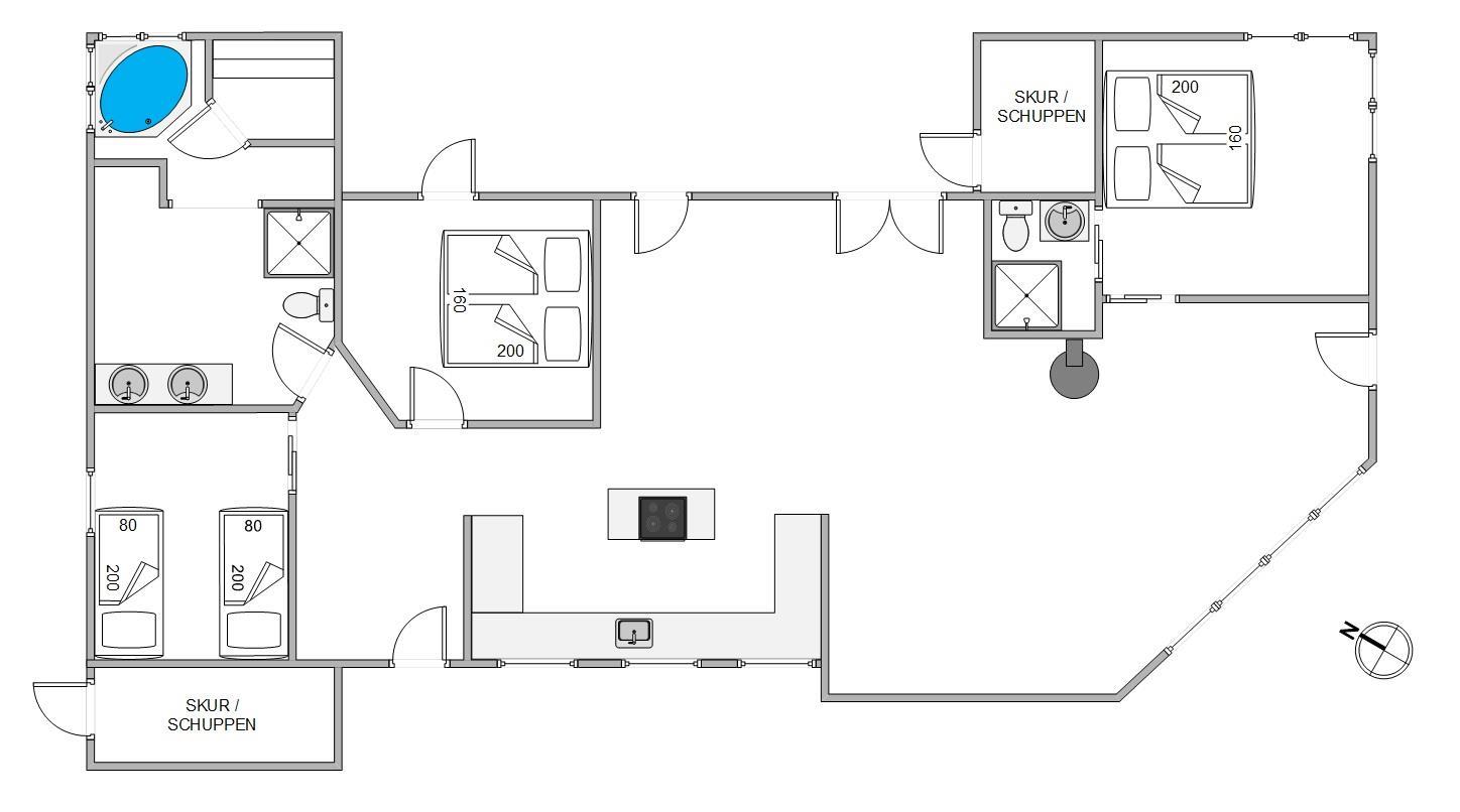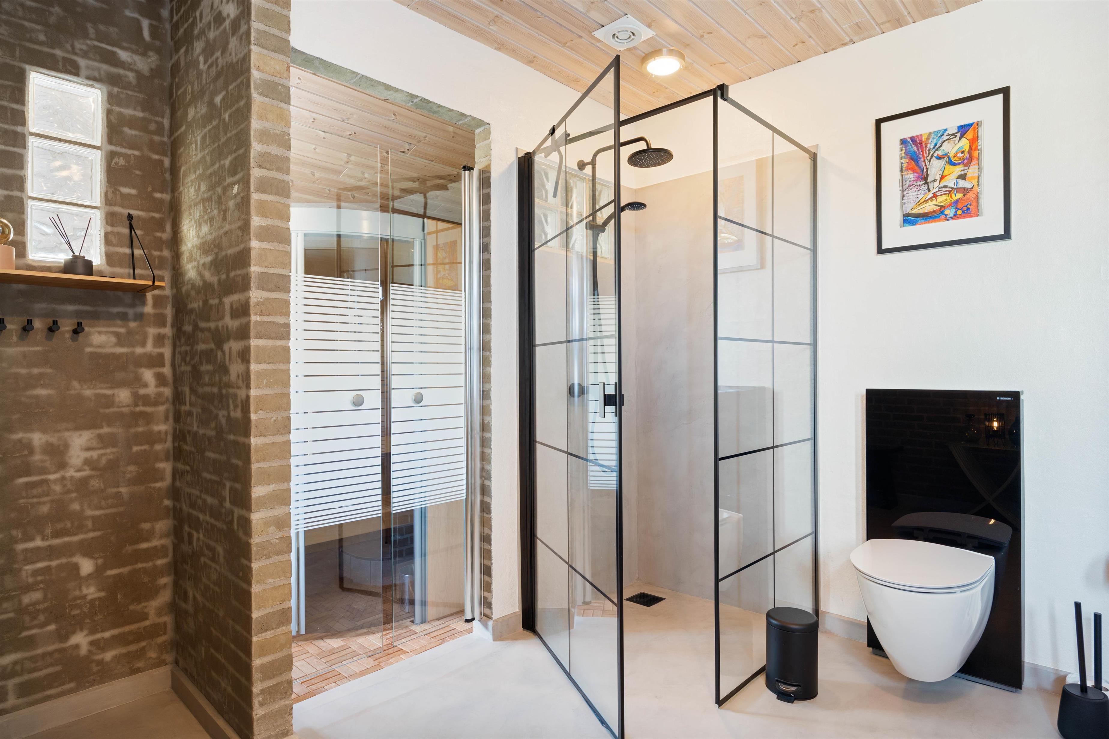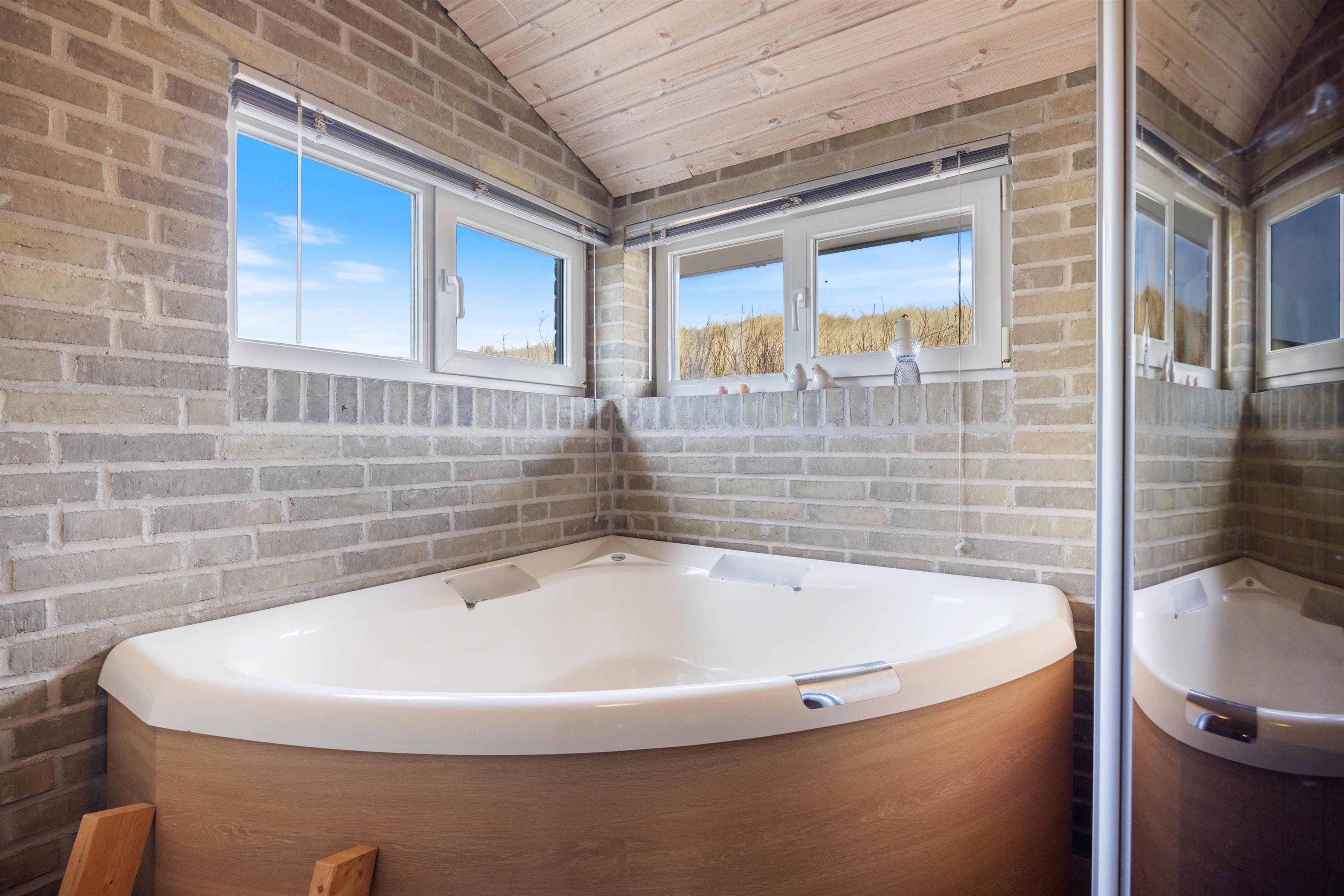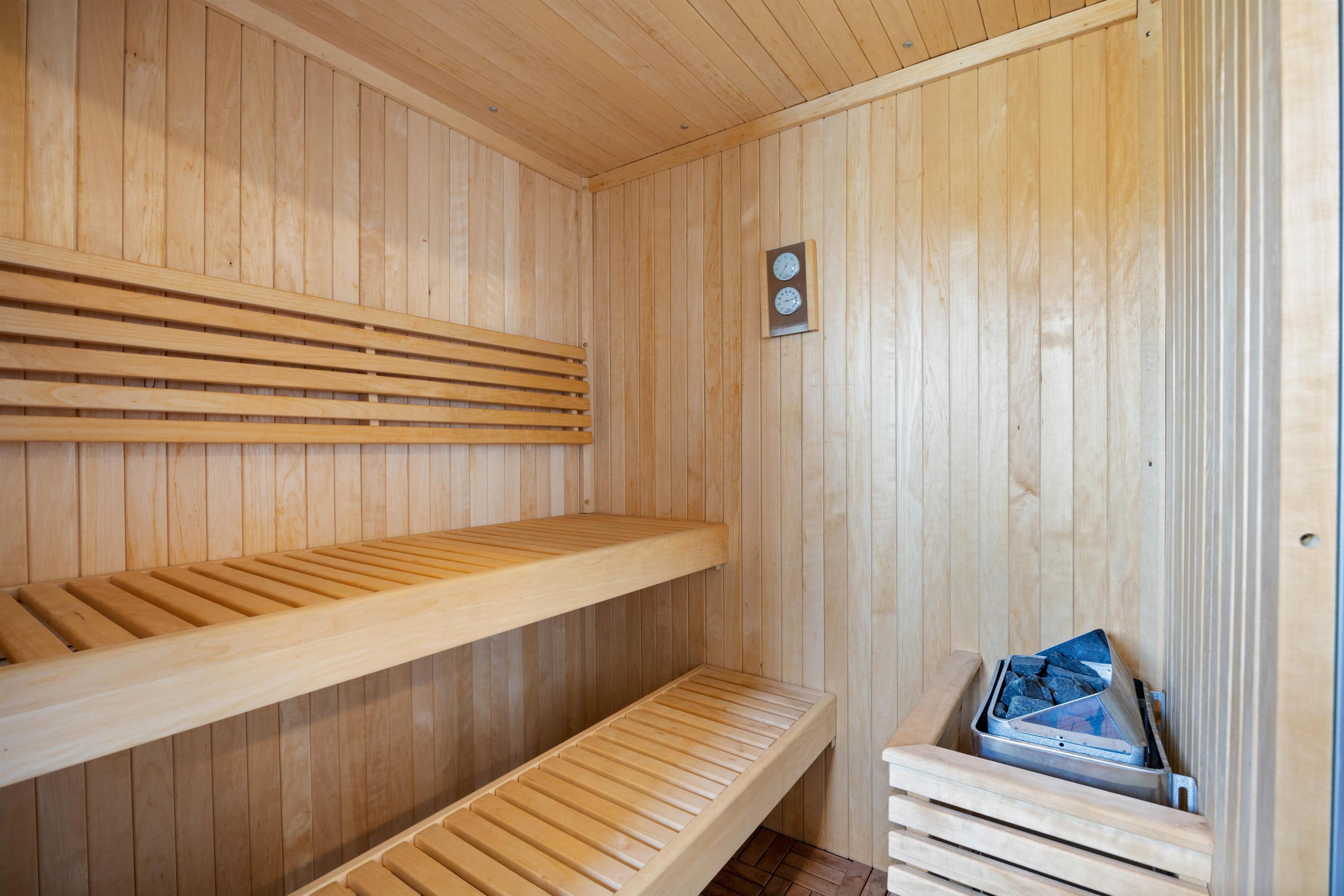 Efter en spændende dag kan du nyde en afslappende stund i spaen eller en tur i saunaen, som begge er i forbindelse med det store badeværelse. Vær opmærksom på, at der fra gulvet i badeværelset og ned til saunaen og spaen er et trappetrin.