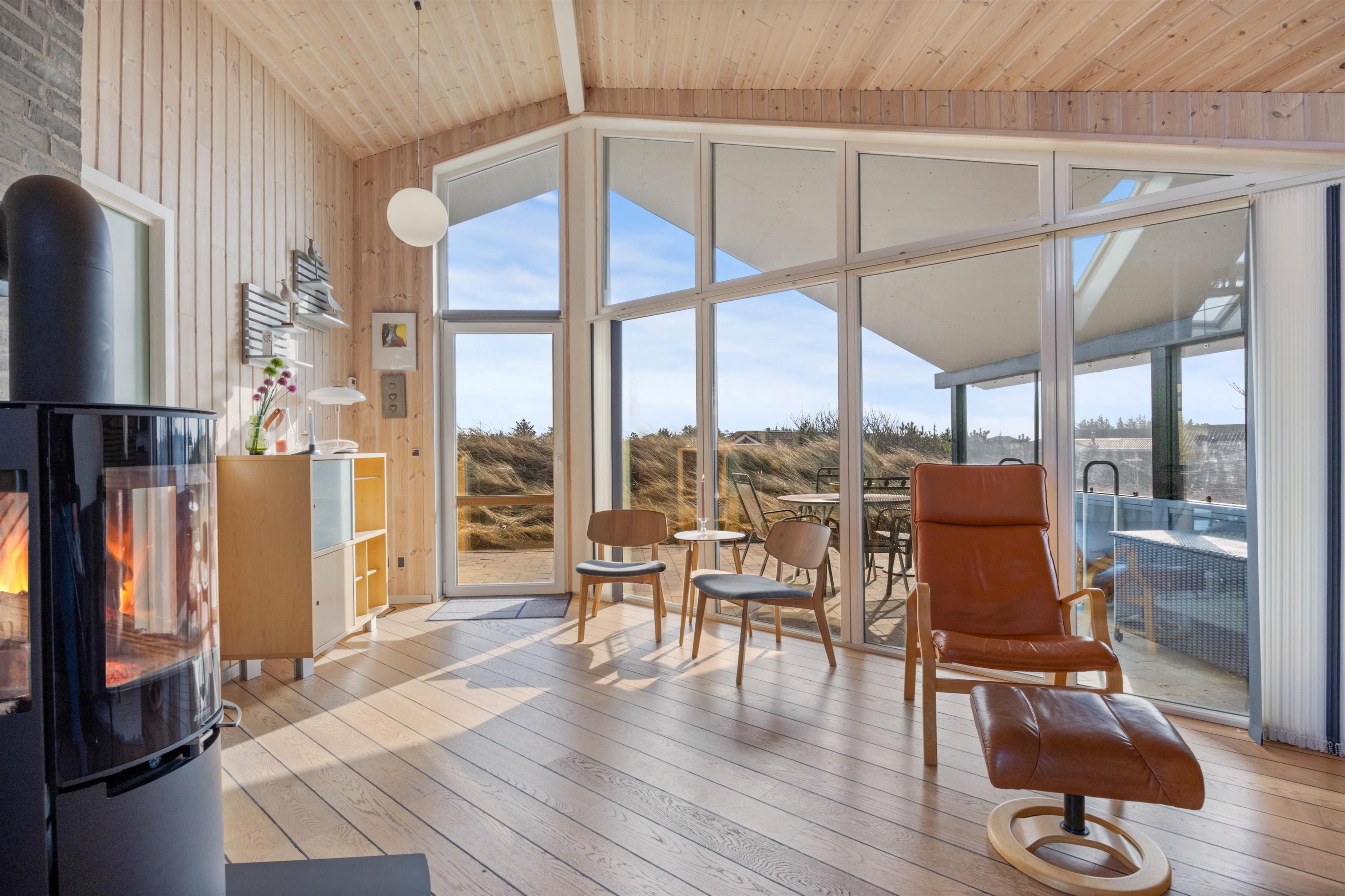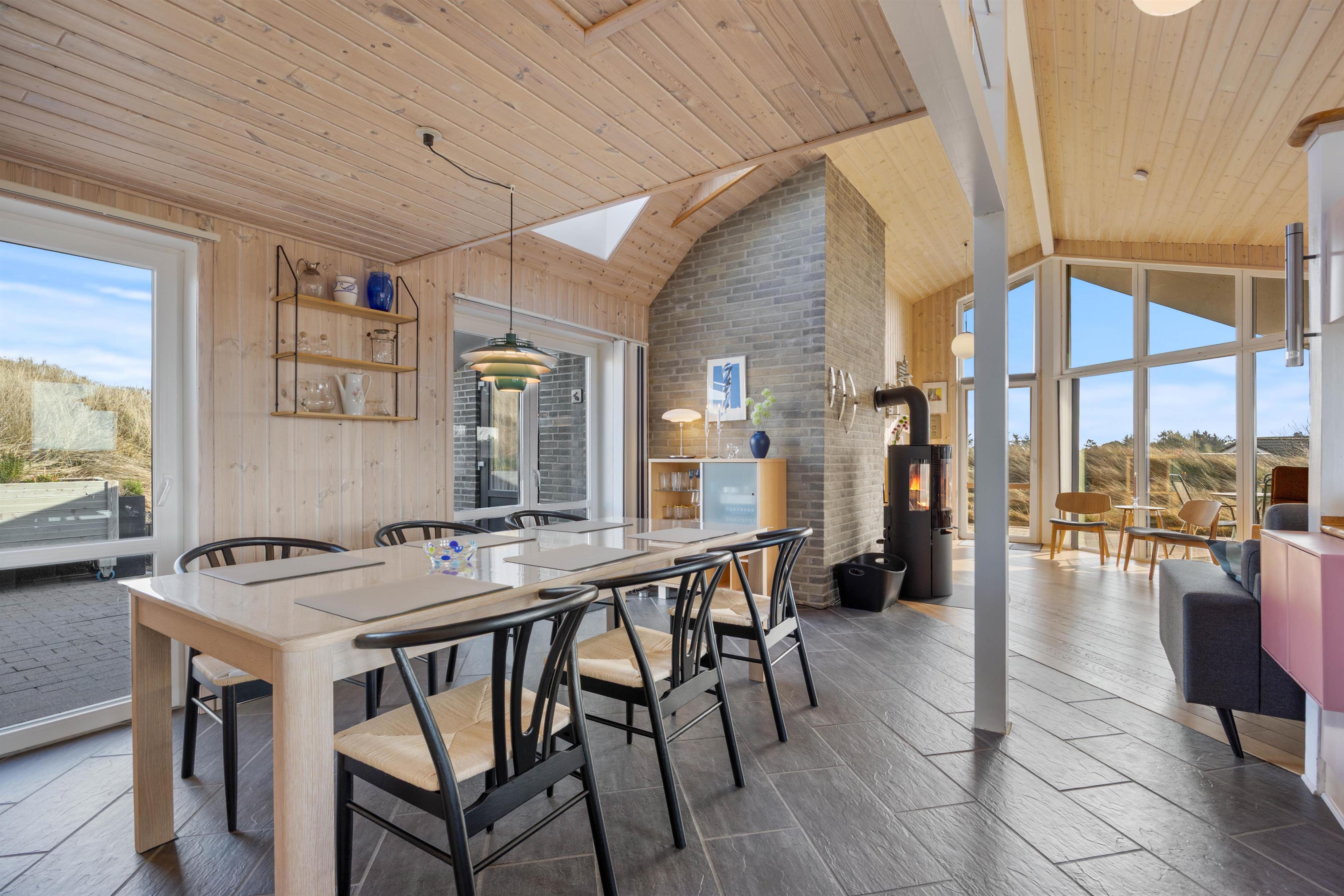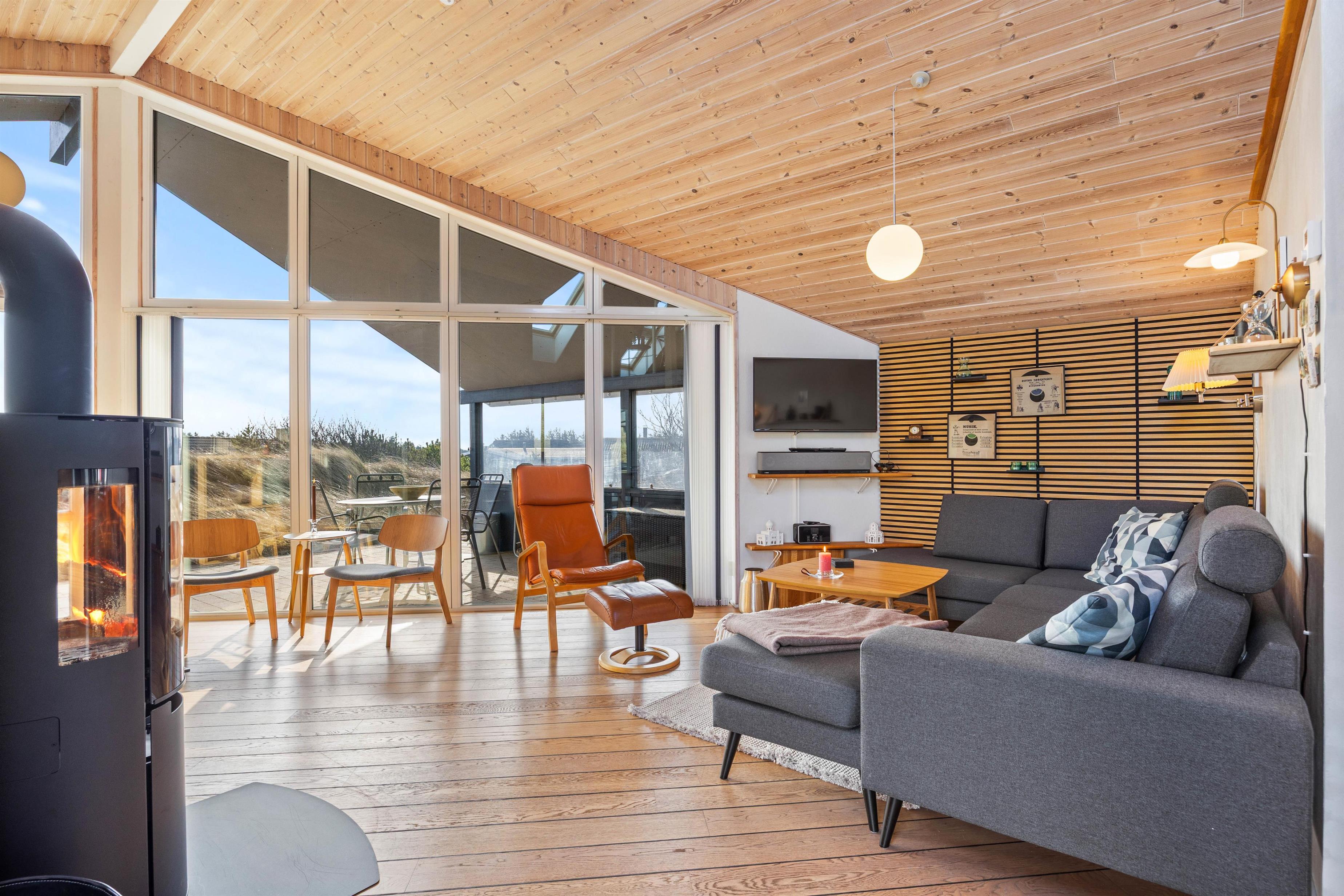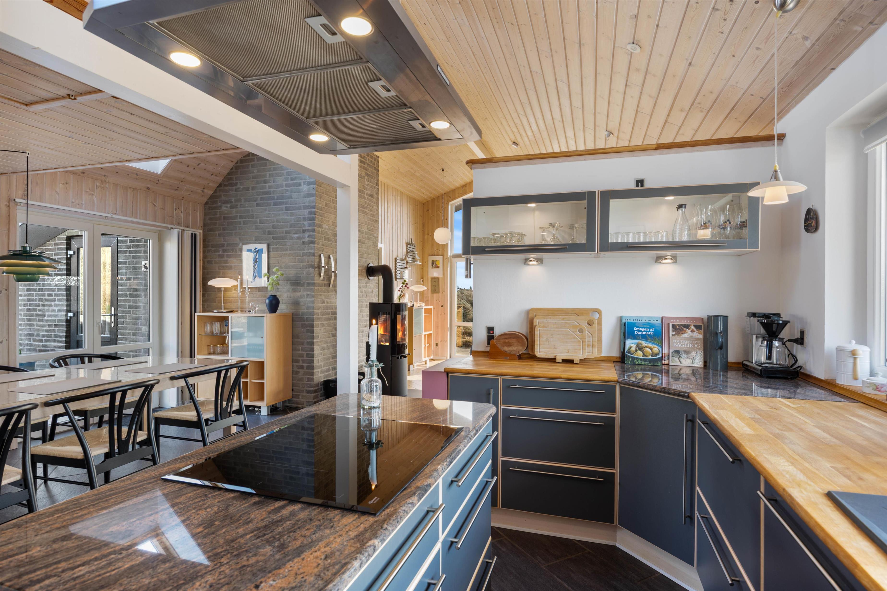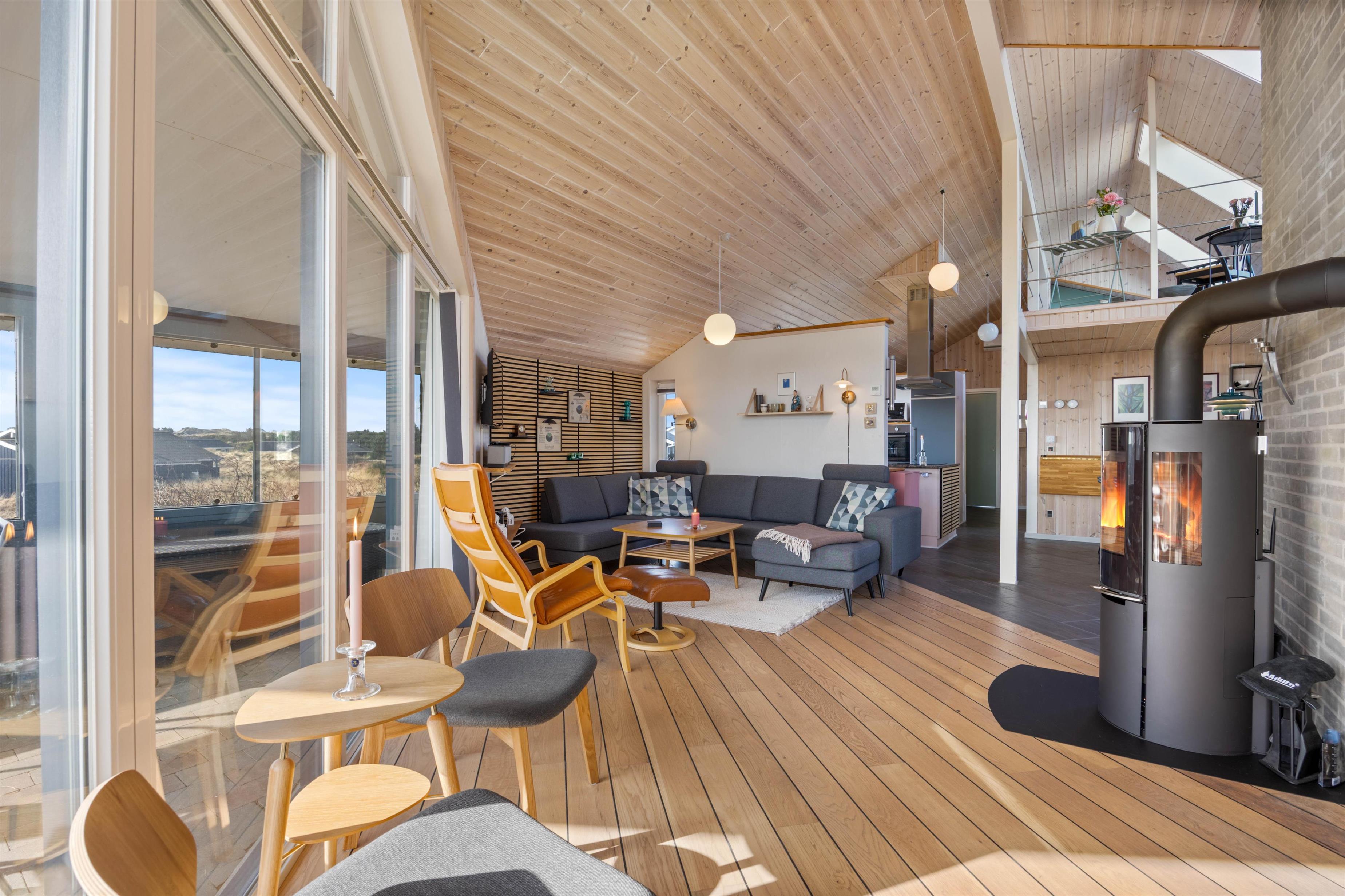 Det lyse feriehus er på 115 velindrettede kvadratmeter. I den hyggelige stue med mange vinduer og komfortable møbler finder du en brændeovn til en afslappende aften med familien. Det rummelige, åbne køkken indeholder alt, hvad I behøver for at forkæle hinanden med lækre hjemmelavede måltider, herunder opvaskemaskine og en separat fryser på 100 l, som især lystfiskere vil blive glade for.