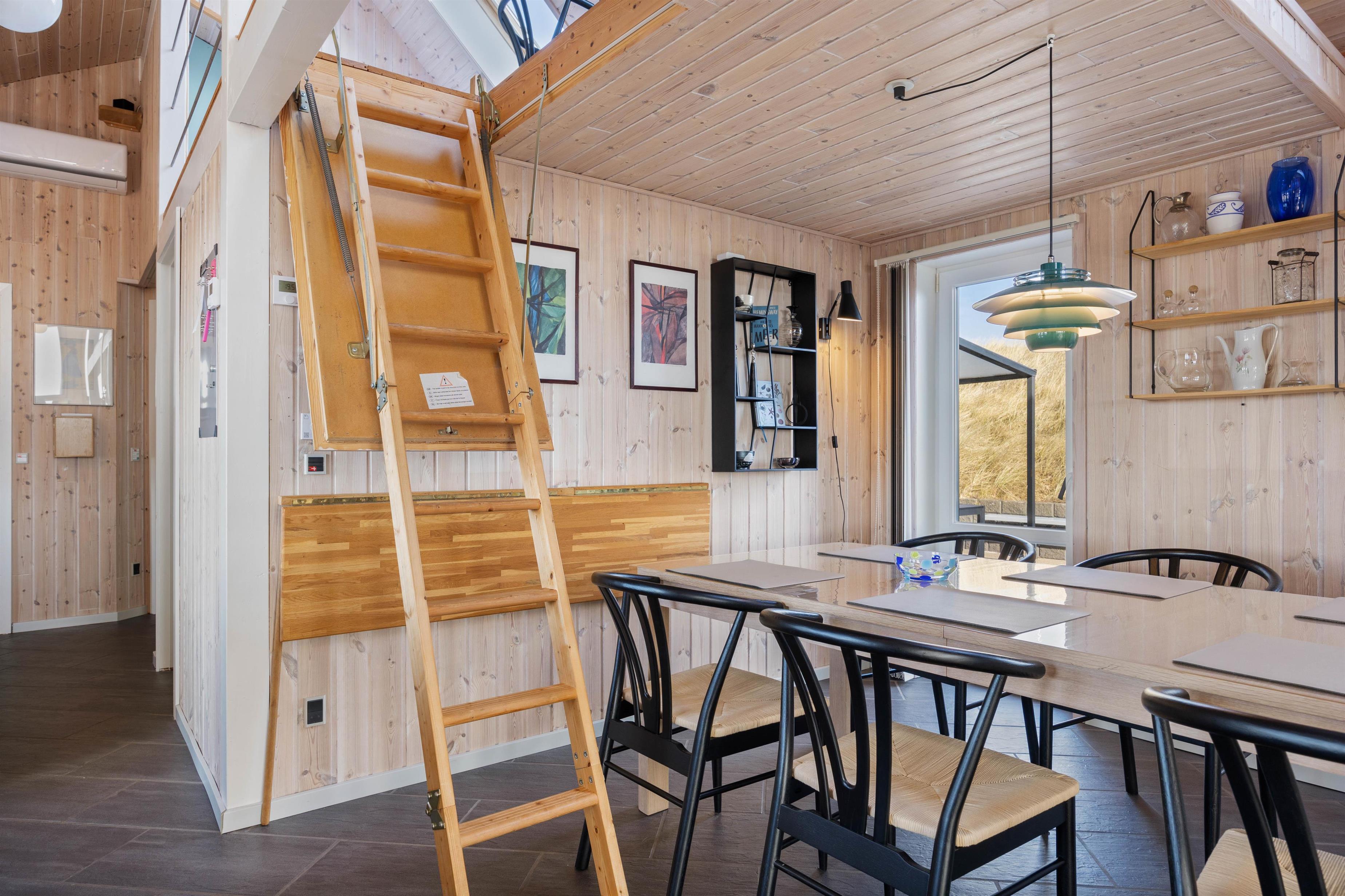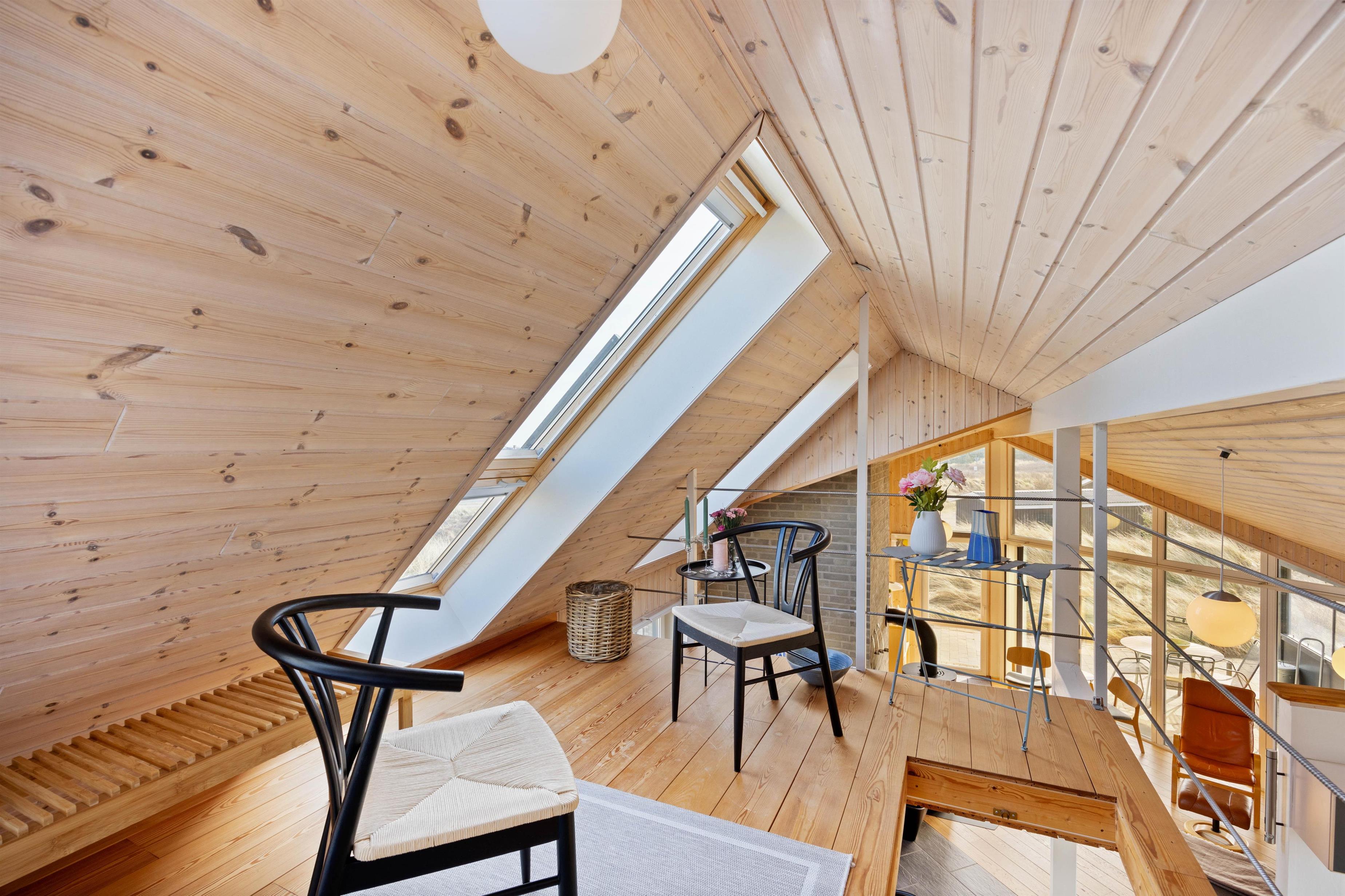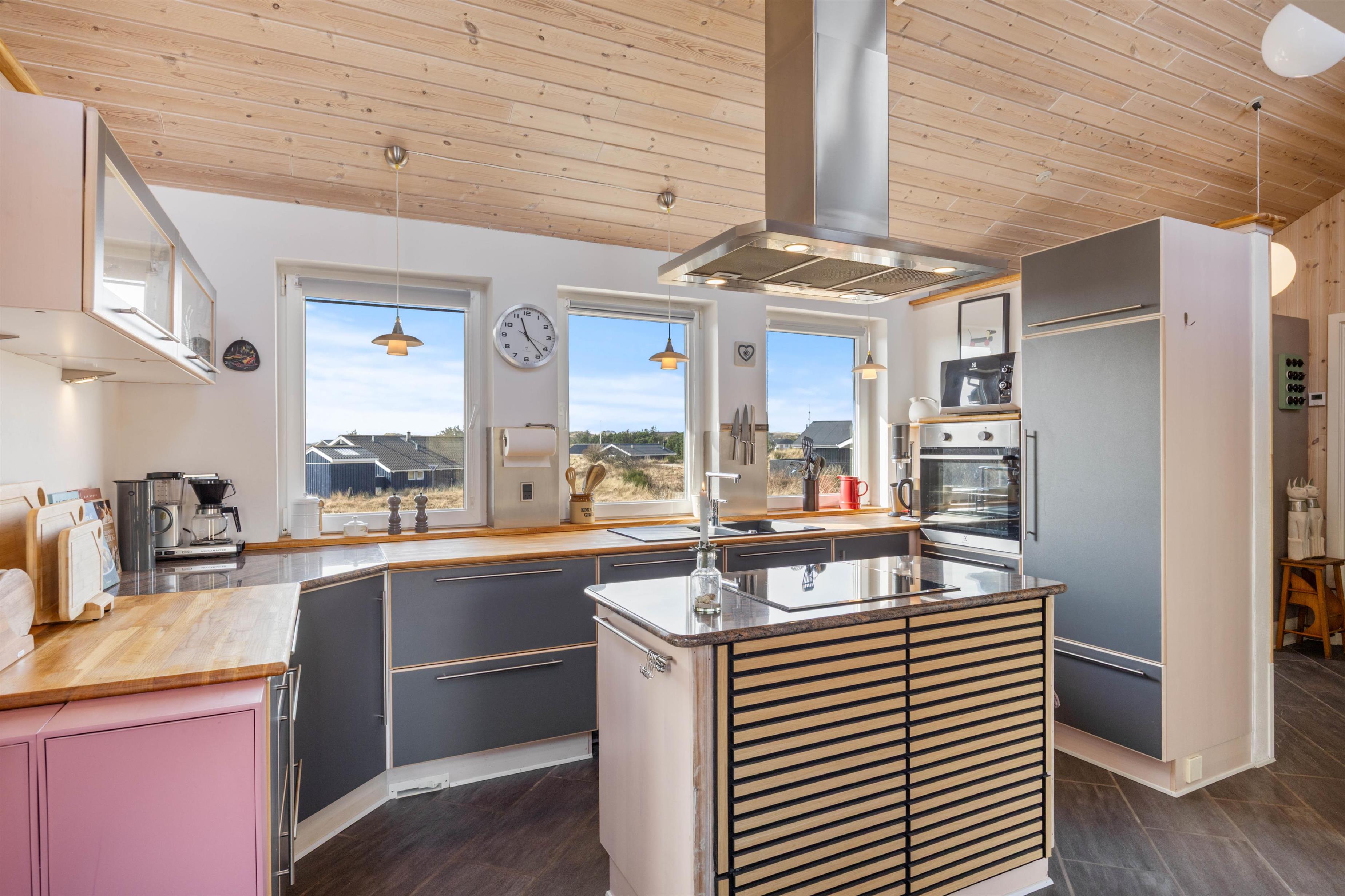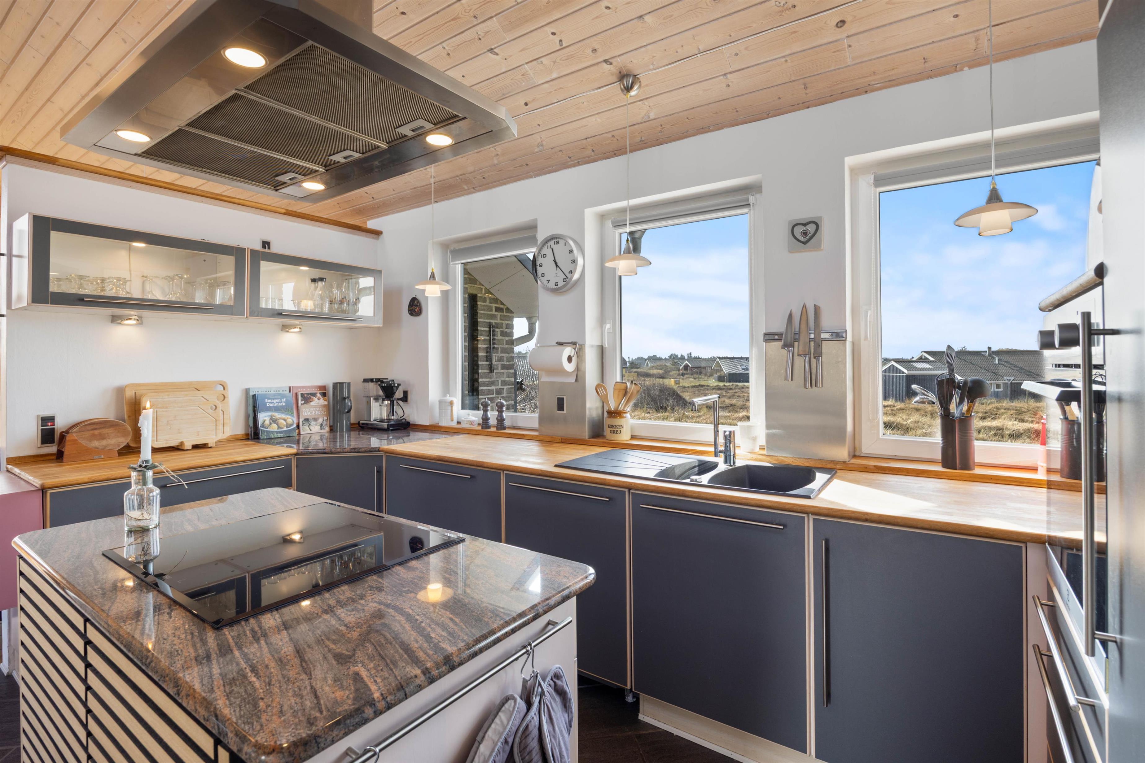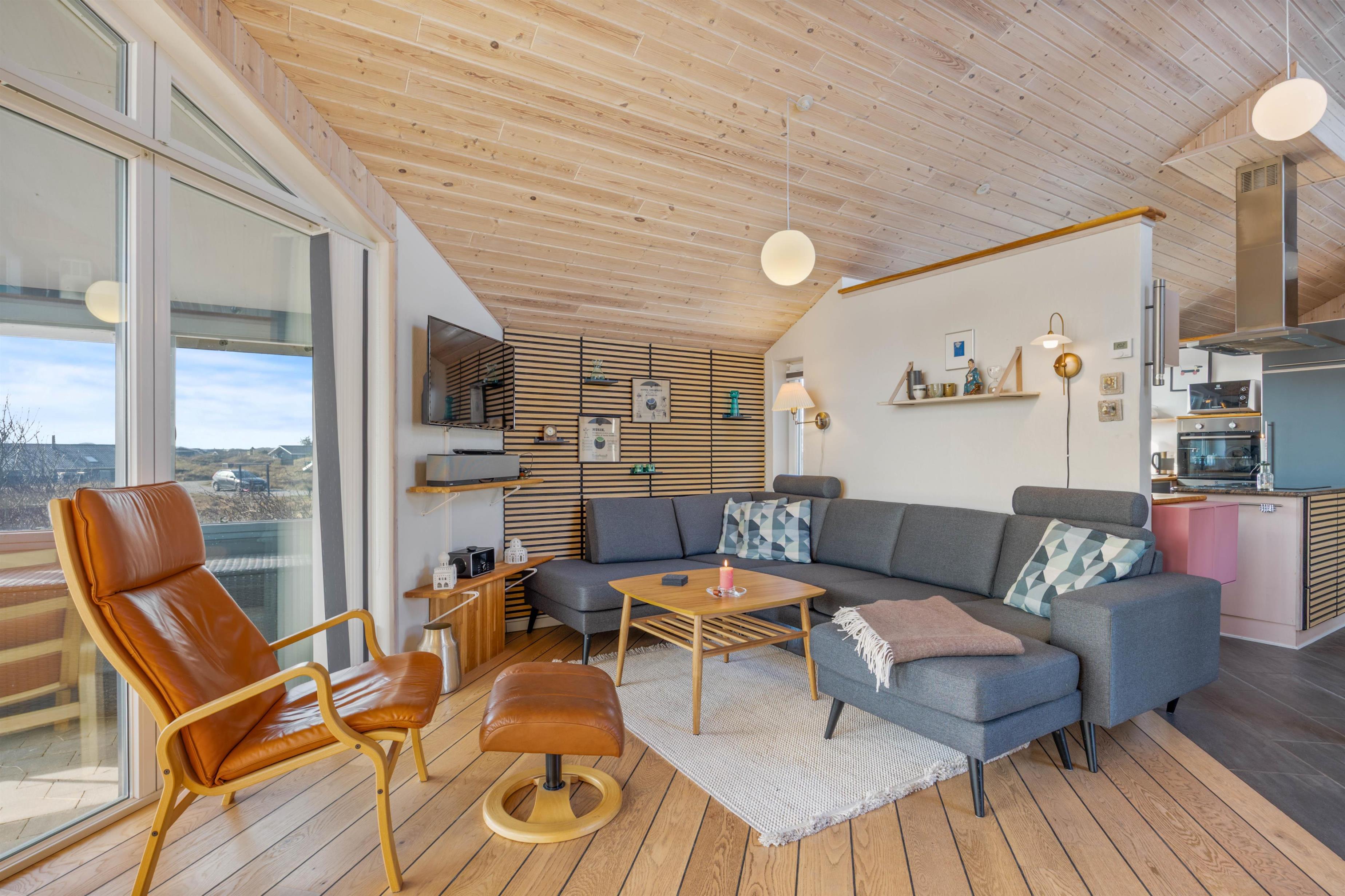 Det lyse feriehus er på 115 velindrettede kvadratmeter. I den hyggelige stue med mange vinduer og komfortable møbler finder du en brændeovn til en afslappende aften med familien. Det rummelige, åbne køkken indeholder alt, hvad I behøver for at forkæle hinanden med lækre hjemmelavede måltider, herunder opvaskemaskine og en separat fryser på 100 l, som især lystfiskere vil blive glade for.