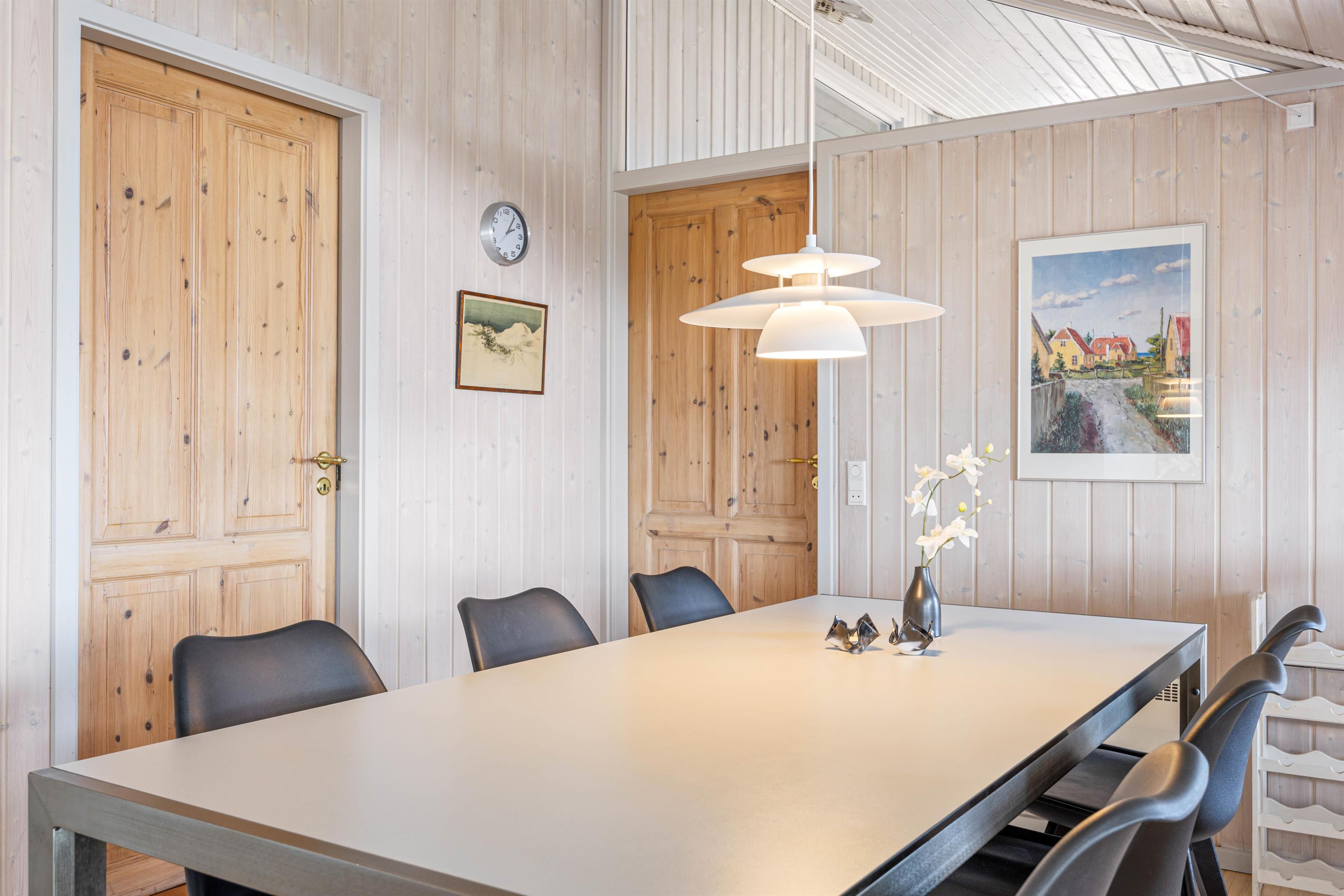 Indretningen er lys og funktionel, og med 3 soveværelser – alle med dobbeltseng – er der god plads til både par og familier. I stuen skaber brændeovnen en hyggelig stemning, når mørket falder på, og varmepumpen bidrager til et behageligt indeklima hele året.