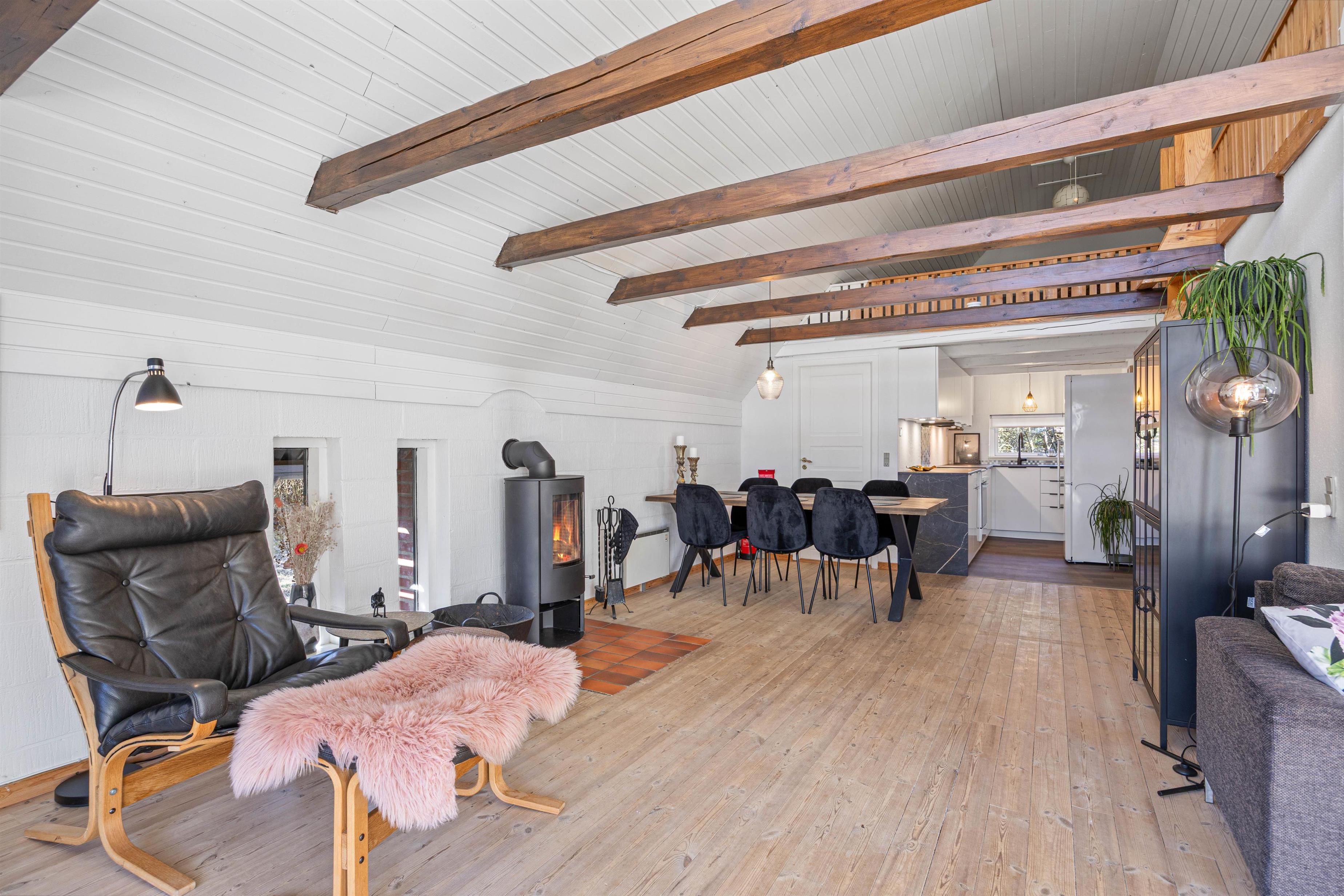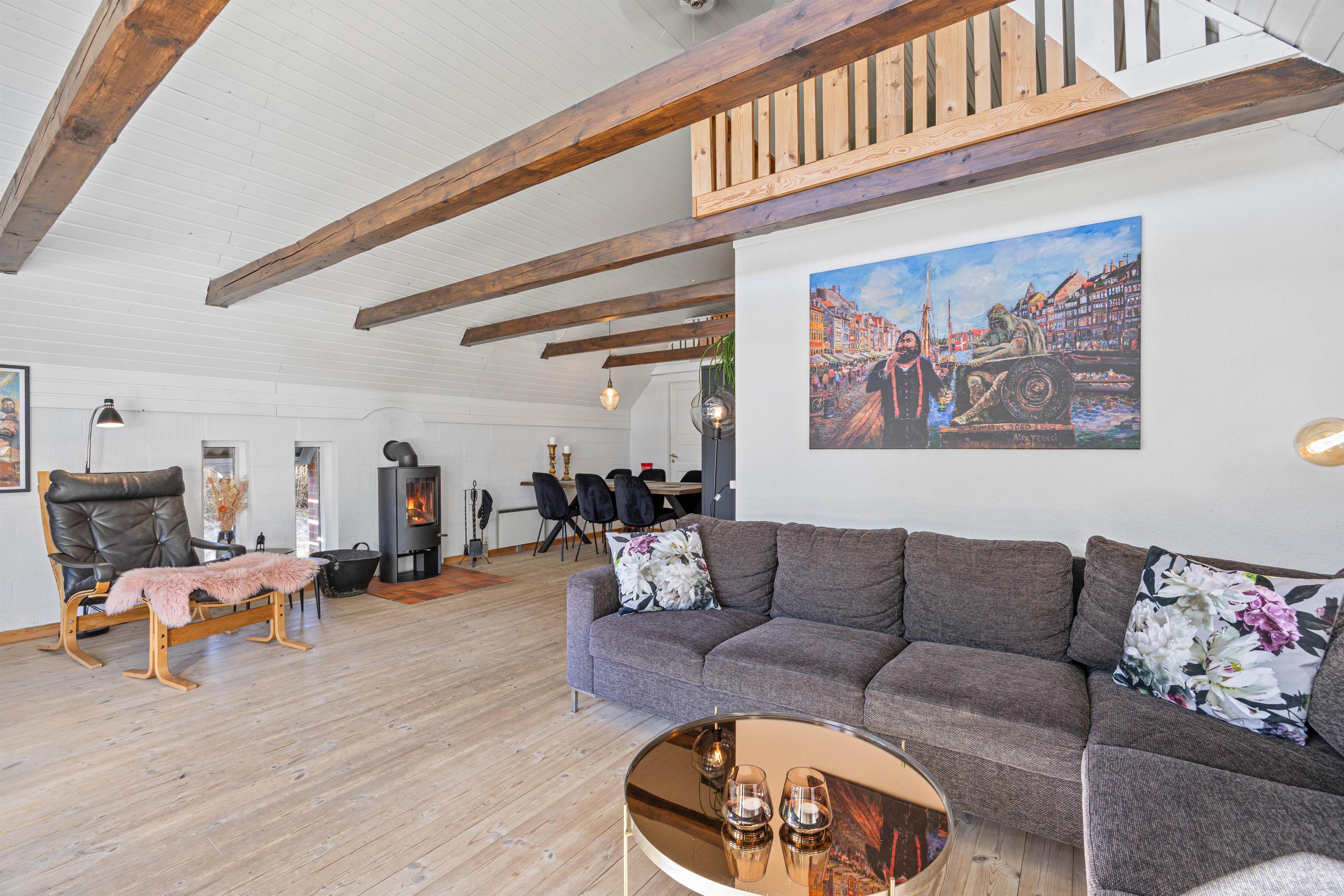 I det charmerende feriehus På Kr Madsens Vej 71 kan du holde en hyggelig ferie sammen med din familie eller venner. De varme farver og loft op i kip i den rummelige stue skaber en hyggelig atmosfære, hvor I kan nyde opholdet sammen. Det fine lysindfald gennem vinduespartiet giver en dejlig feriestemning, og samtidig kan I føle jer tæt på naturen. Tænd op i brændeovnen, hyg jer i sofaen og kom helt ned i gear.