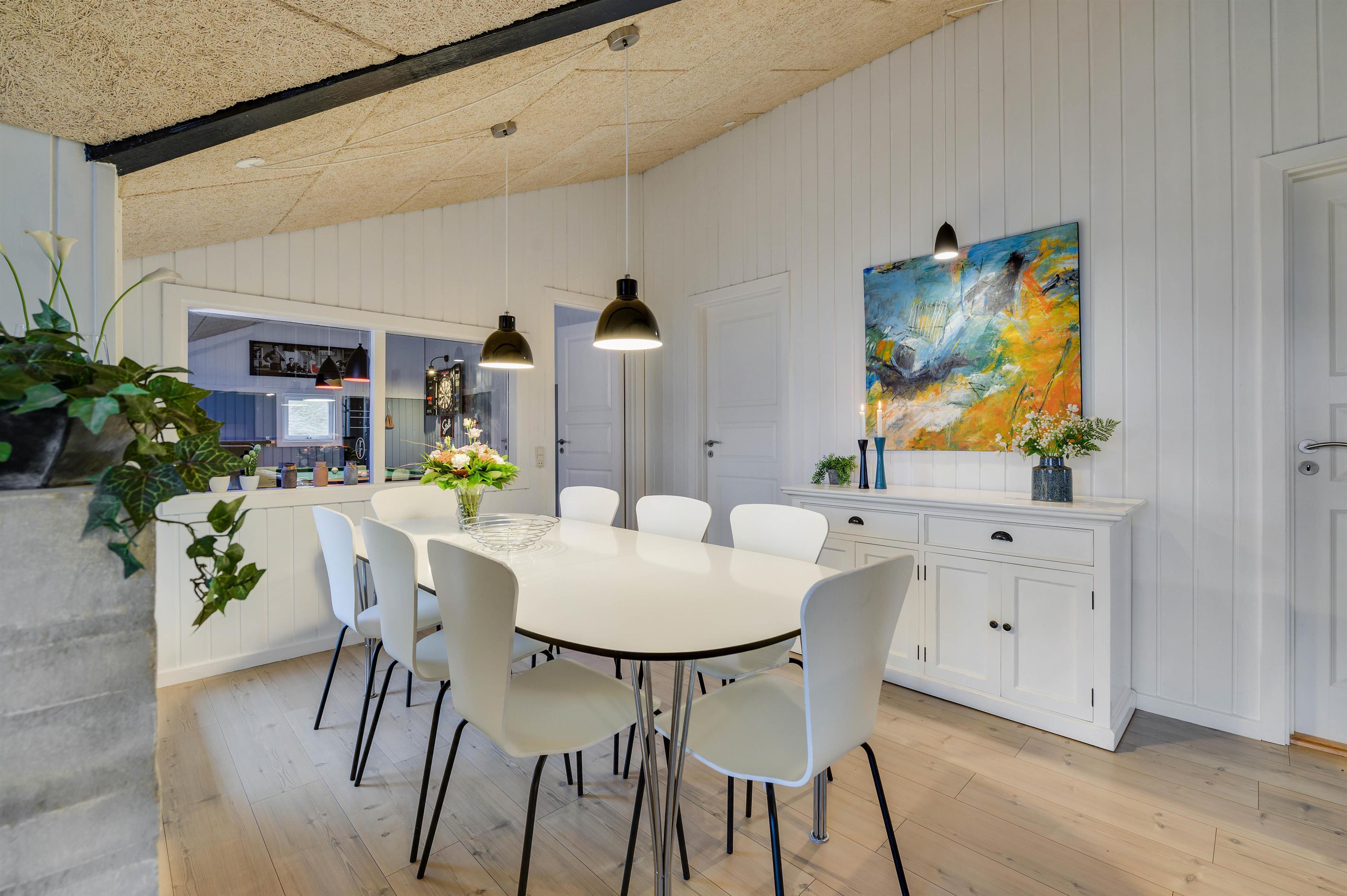 Feriehuset er indrettet i en flot, enkel stil, der giver et harmonisk og indbydende indtryk. I den hyggelige stue er der en dejlig brændeovn og en varmepumpe, der sørger for en behagelig varm temperatur. Og i det flotte køkken vil madlavningen sikkert gå som en leg, mens børnene kan sidde i spiseafdelingen lige ved siden af og spille spil.