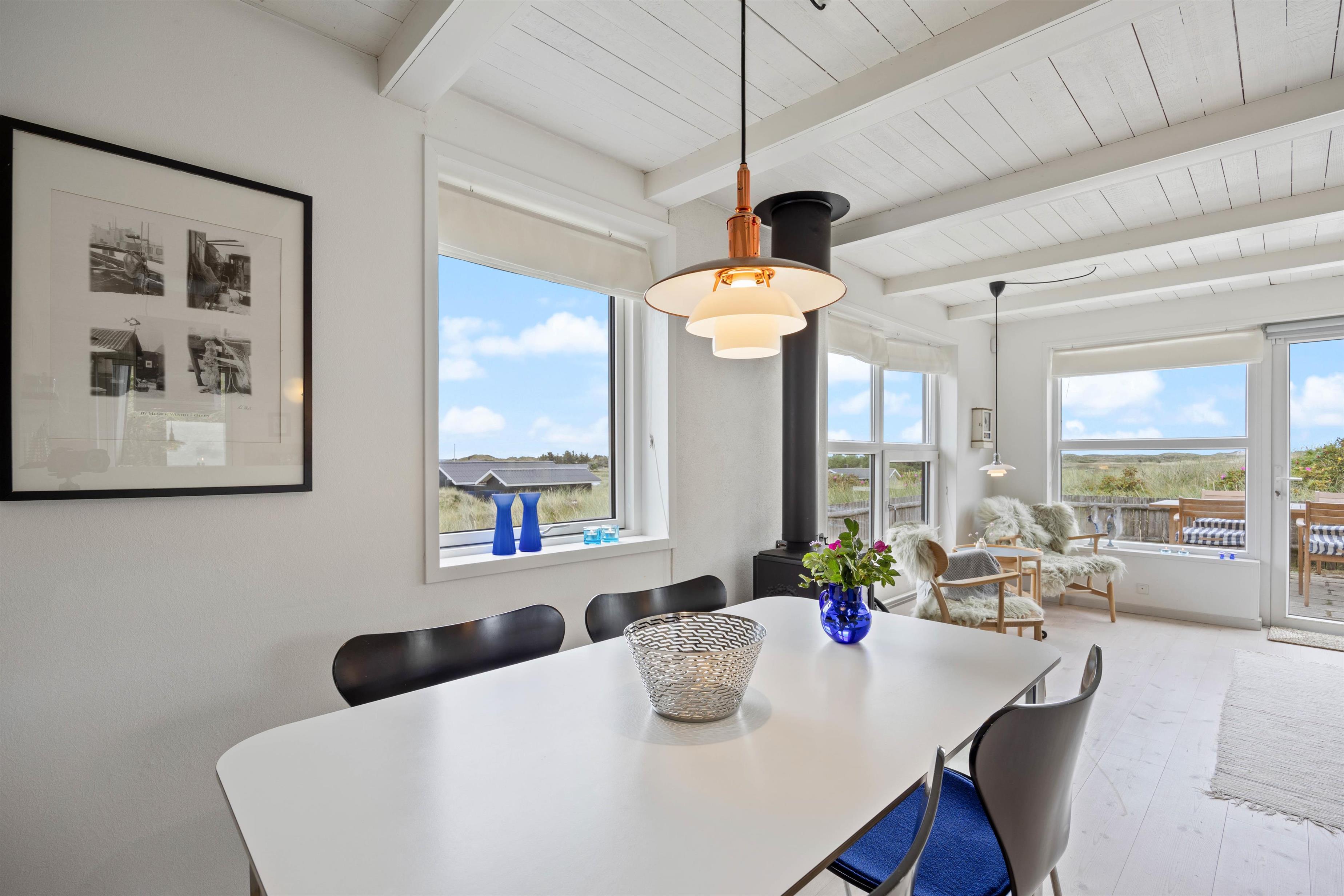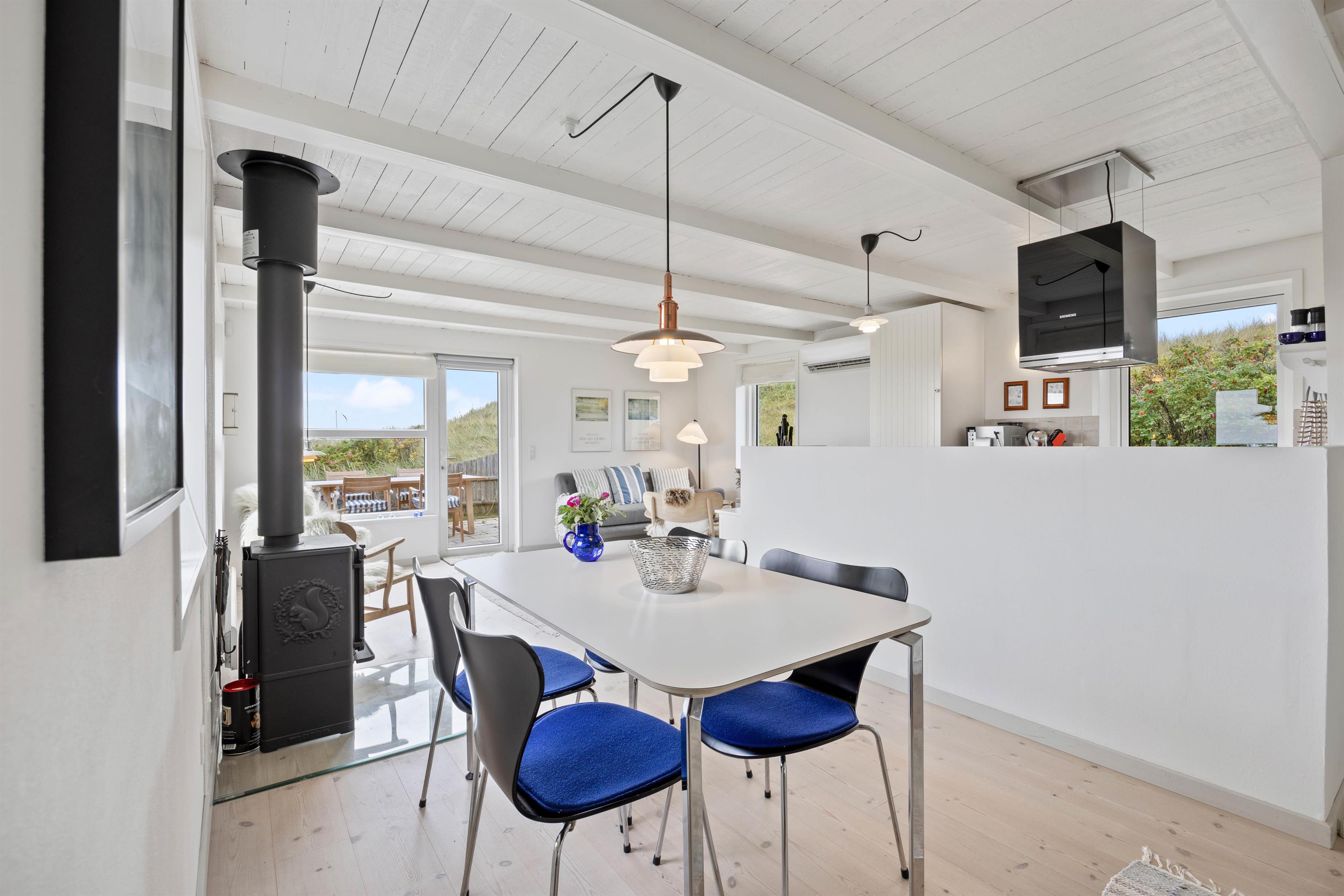 Sommerhuset er lyst og velegnet til den lille familie, to hold venner eller parret, der ønsker et afbræk fra hverdagen. I rolige, hjemlige omgivelser kan I trække jer tilbage og nyde at holde fri langt fra hverdagen. Her kan I alle samles og skabe skønne ferieminder. Saml jer om spisebordet til en lækker brunch, mens dagens program planlægges. Efter dagens udflugt kan I sætte jer godt til rette i sofaen med kortspil, yndlingsbogen eller til filmhygge. Hold indeklima og rummet behageligt med den energibesparende varmepumpe eller tænd op i brændeovnen. Brændeovnens hygge og varme breder sig i rummet, og det samme gør duften fra køkkenet.