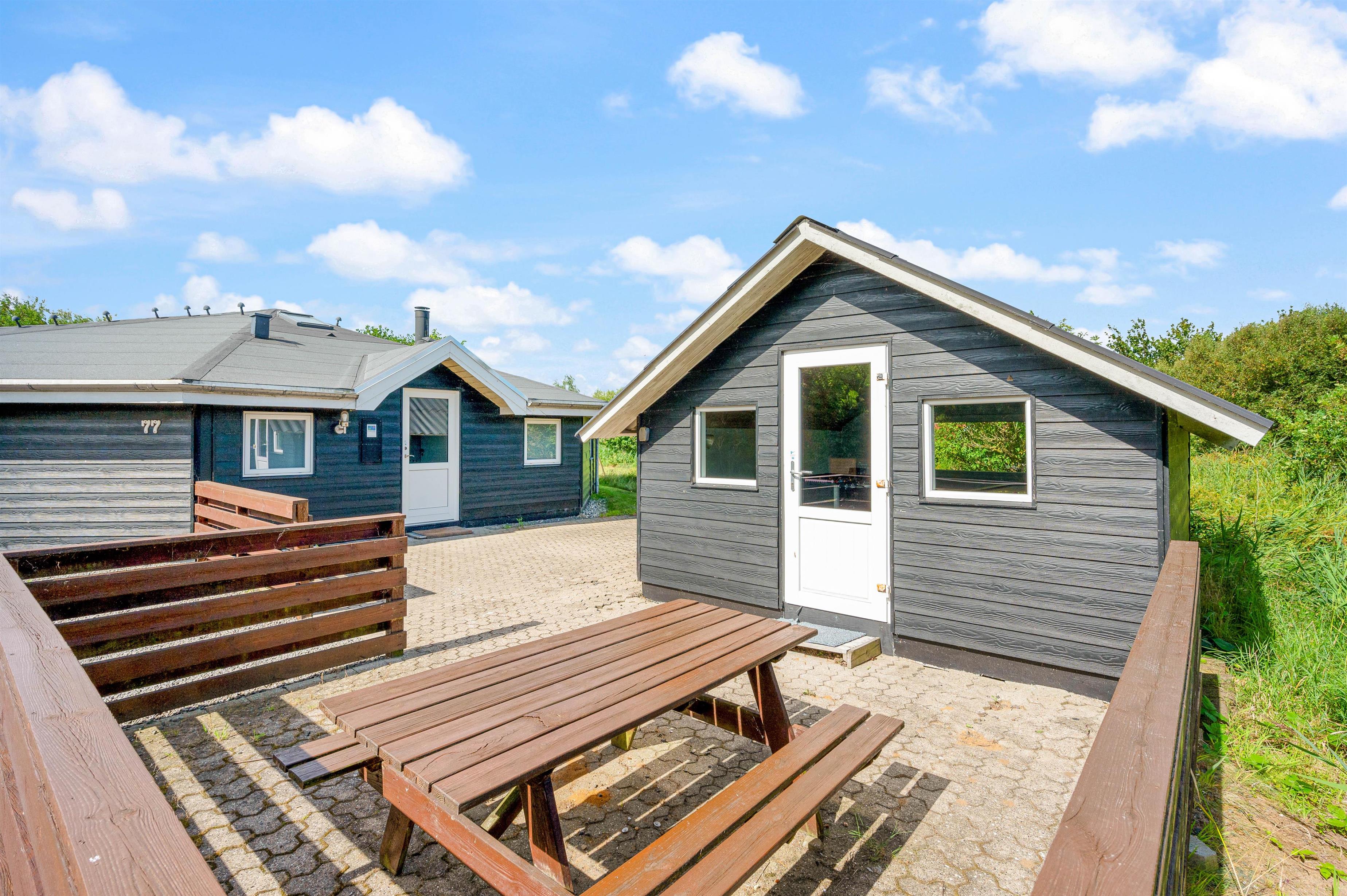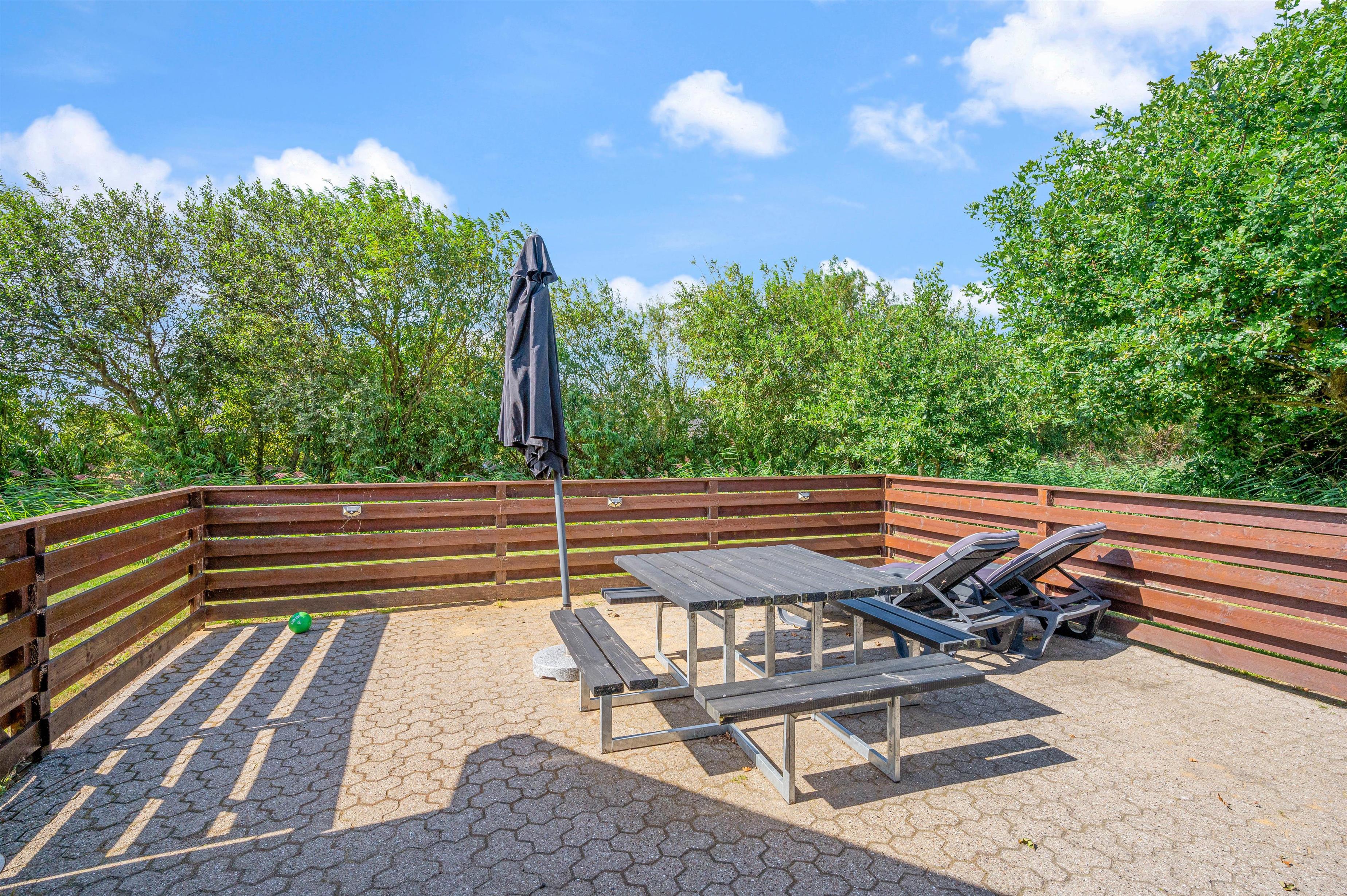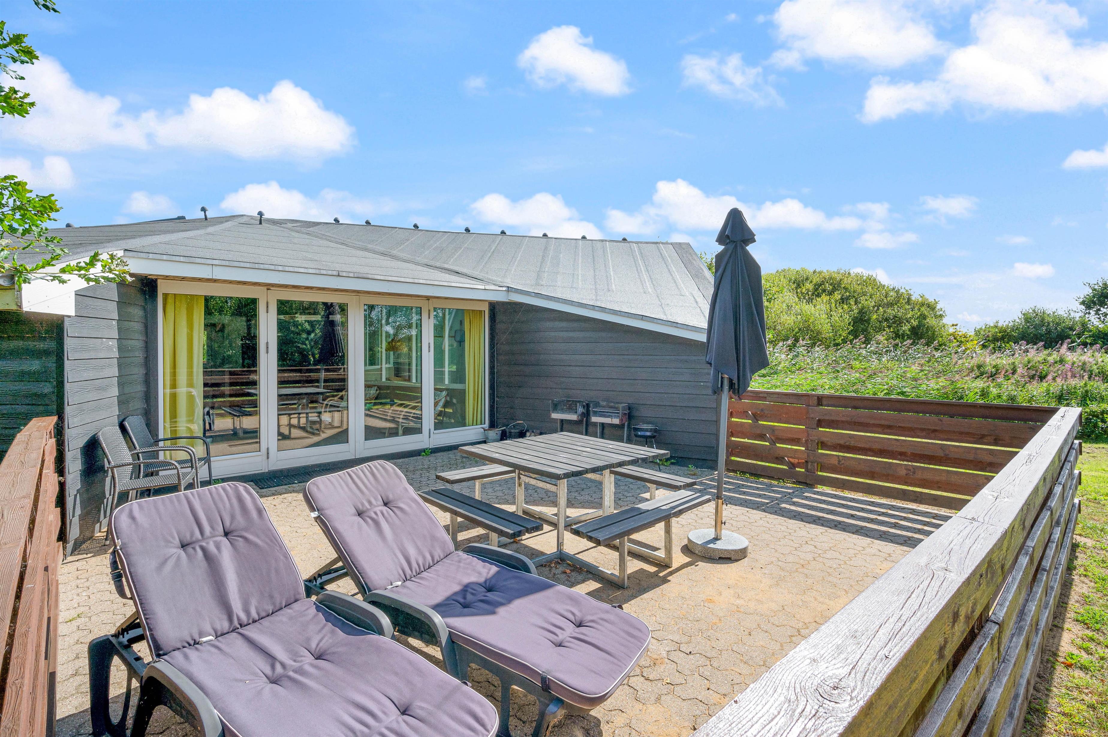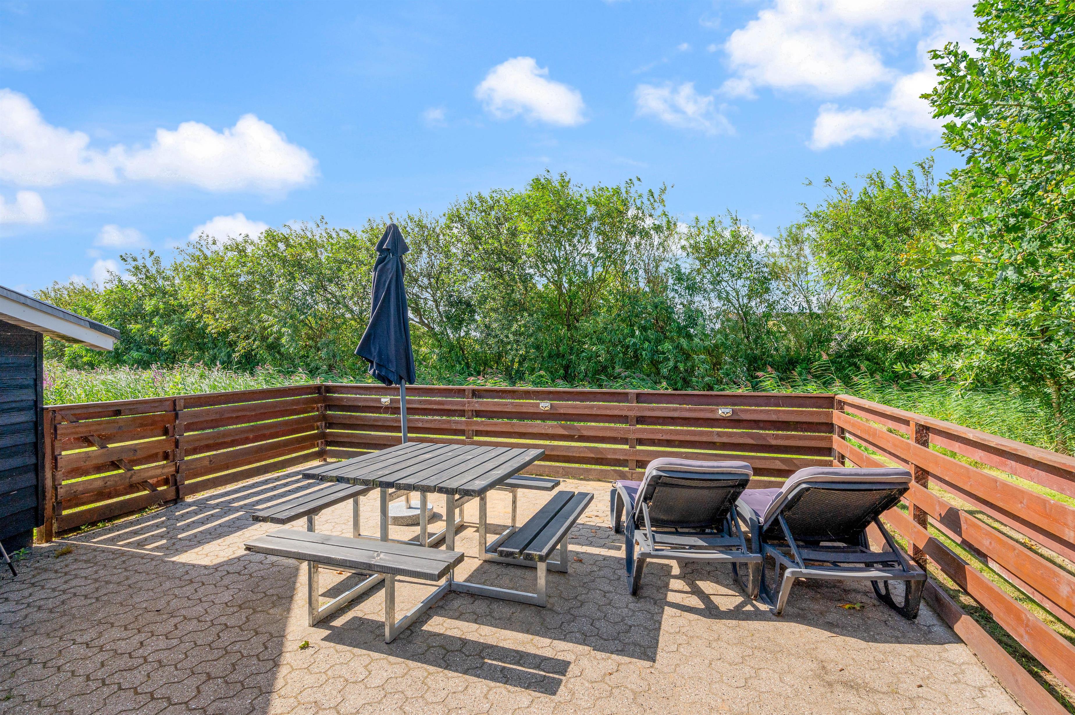 Sommerhuset har 2 dejlige terrasser, hvorfra I kan nyde solen og den friske luft. Den ene terrasse er nordøstvendt, og her kan du drikke en god kop kaffe til solopgangen, imens resten af familien sover videre. Den sydvestvendte terrasse er lukket, og herfra har I en fantastisk udsigt til Ringkøbing Fjord. Denne terrasse er perfekt til et lækkert grillmåltid på en lun sommeraften.