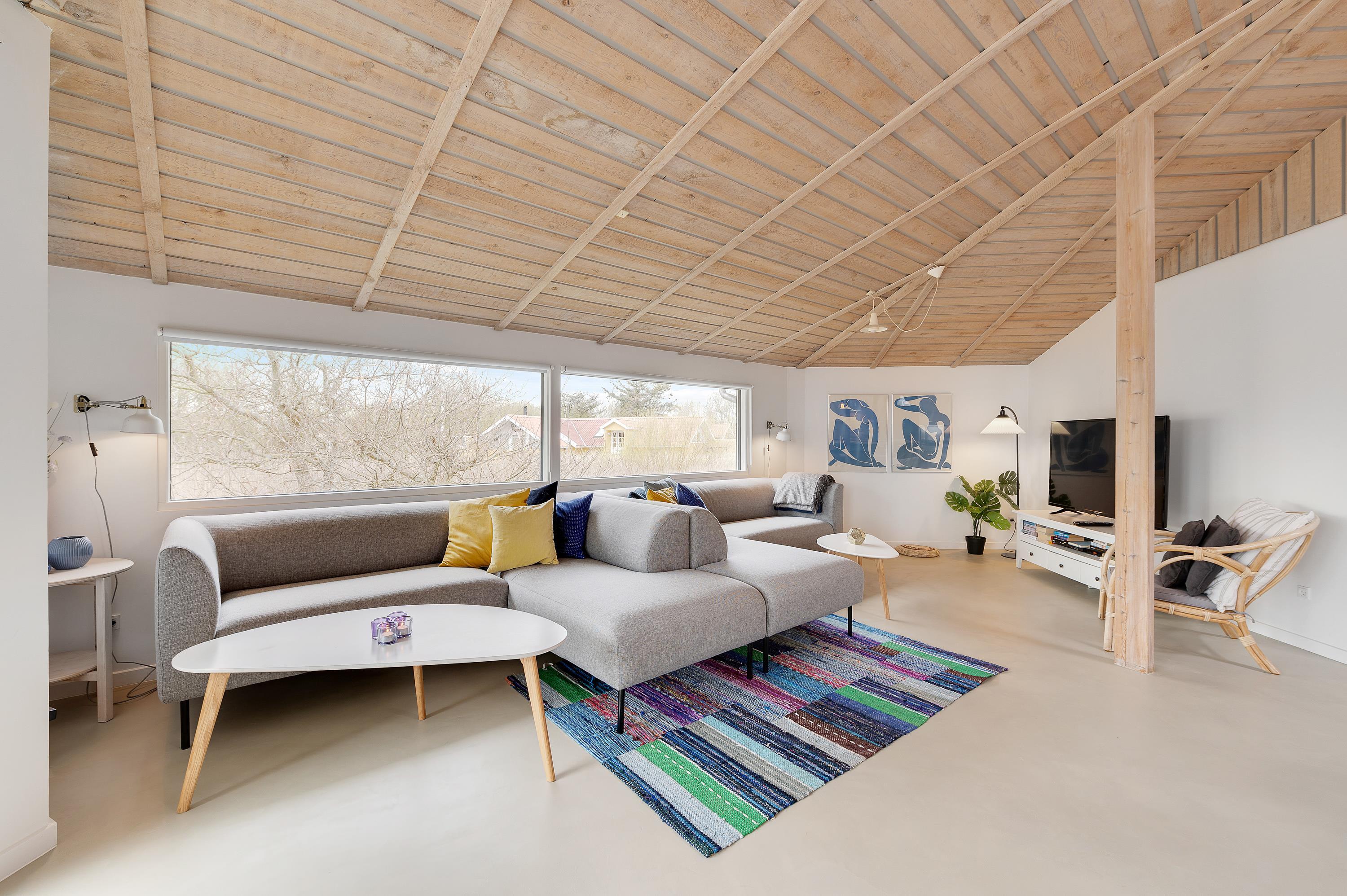 Lyst og hyggeligt opholdsrum med brændeovn