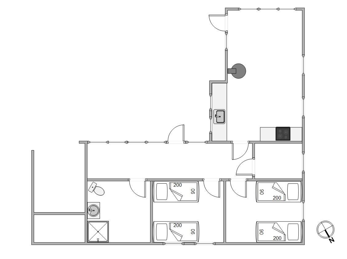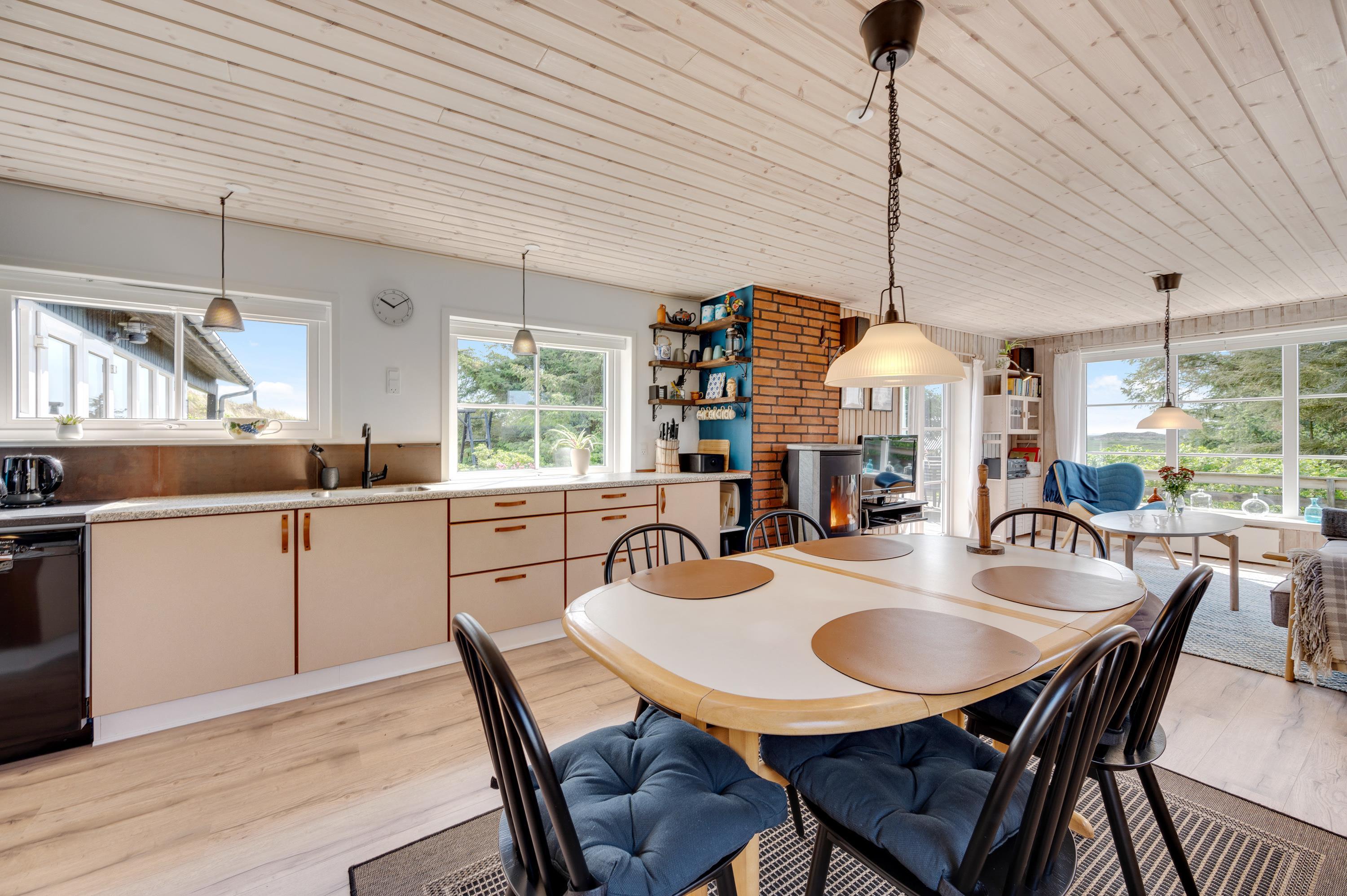Vinkelhuset her er hyggeligt og hjemligt indrettet. Opholdsrummet er med kombineret stue, spise- og køkkenafdeling. Køkkenafdelingen indeholder alt, hvad I har brug for til en god ferie, bl.a. mikroovn og opvaskemaskine.