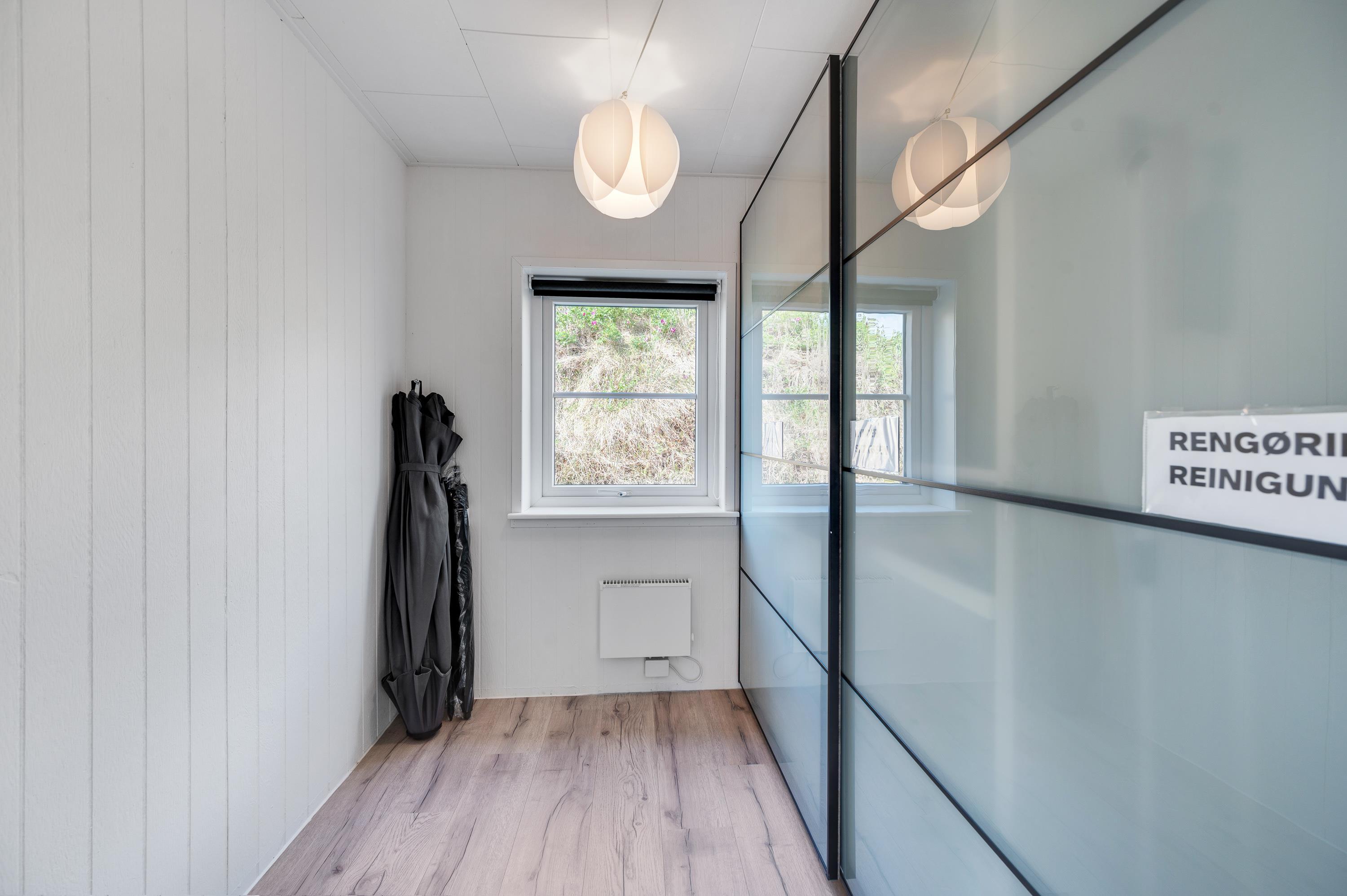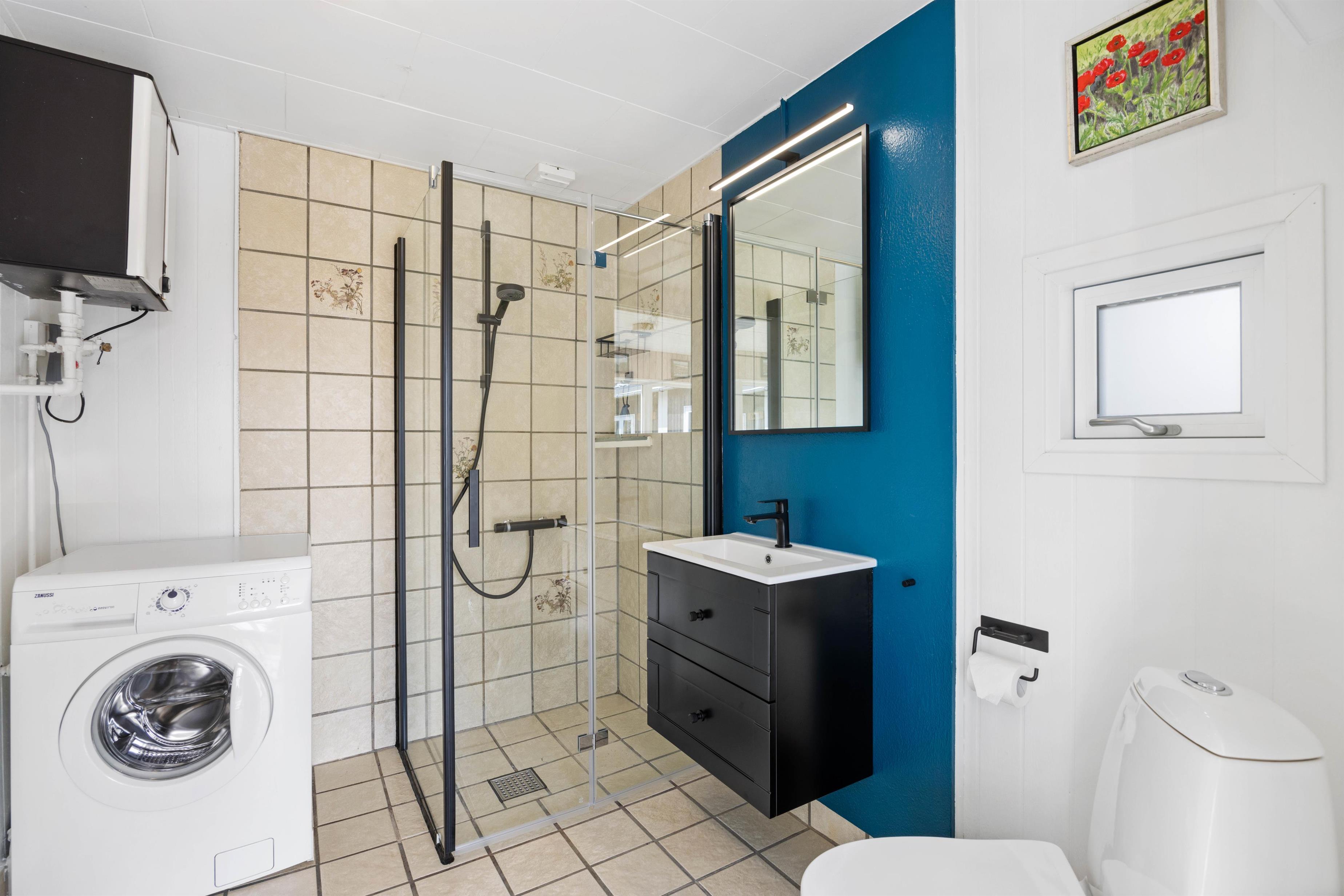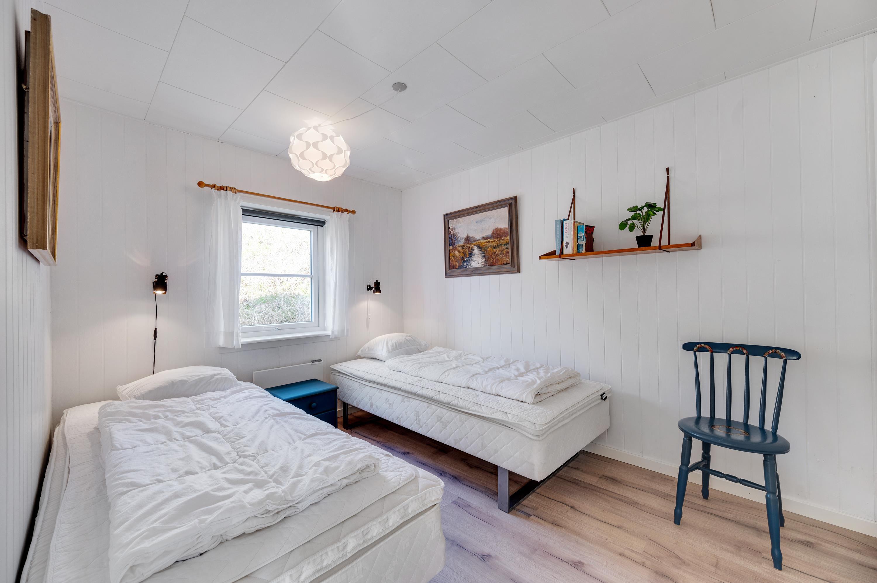 Badeværelset har en fin størrelse, hvor der også er plads til vaskemaskine, som måske især børnefamilier vil blive glad for. De 4 sovepladser i huset er fordelt på 2 soverum, hver med 2 enkeltsenge.