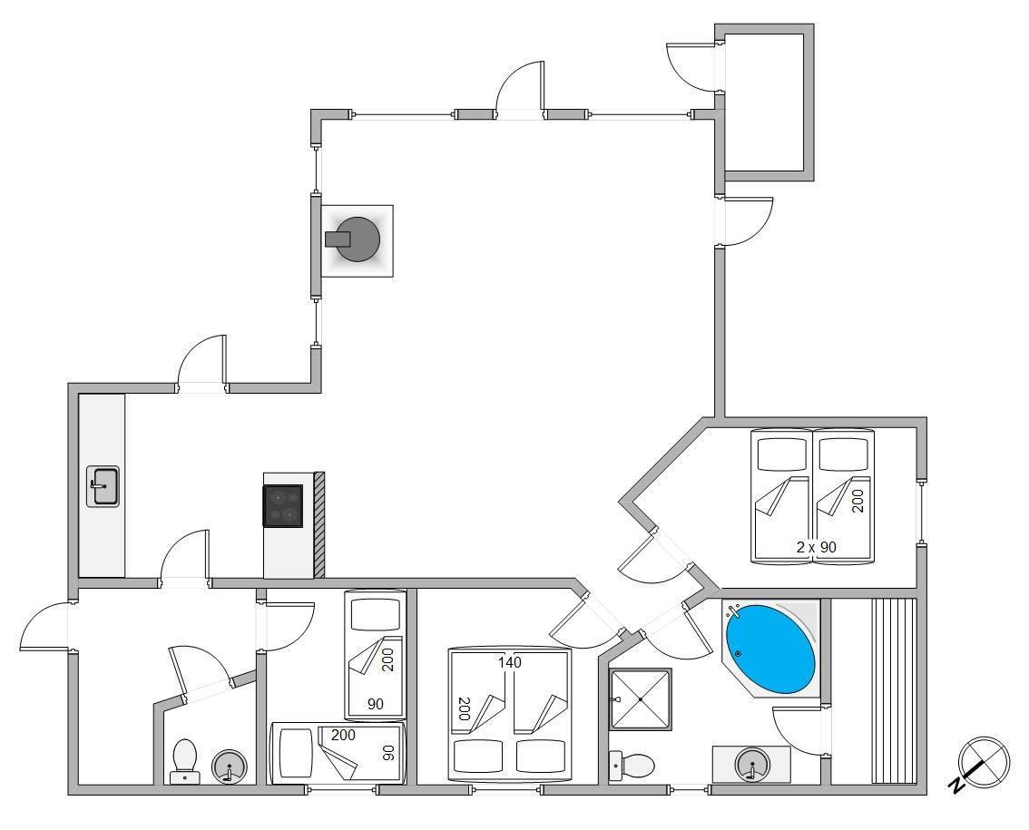 Indenfor er huset lyst og dejligt indrettet med gode møbler og masser af moderne udstyr, som er med til at gøre ferien så behagelig som muligt. Har I lyst til at hoppe i sauna eller spabad – så er det også en mulighed. Det er særligt attraktivt på dage, hvor I har været meget ude i den friske luft. Det varme vand giver ny energi til både krop og sjæl. I huset er der også et gæstetoilet samt 3 soverum med både dobbeltsenge og et enkelt værelse med 2 enkeltsenge. I det store køkkenalrum kan I samles om madlavningen eller nyde en aften foran fjernsynet, imens I kan høre lyden fra brændeovnens knitrende flammer.