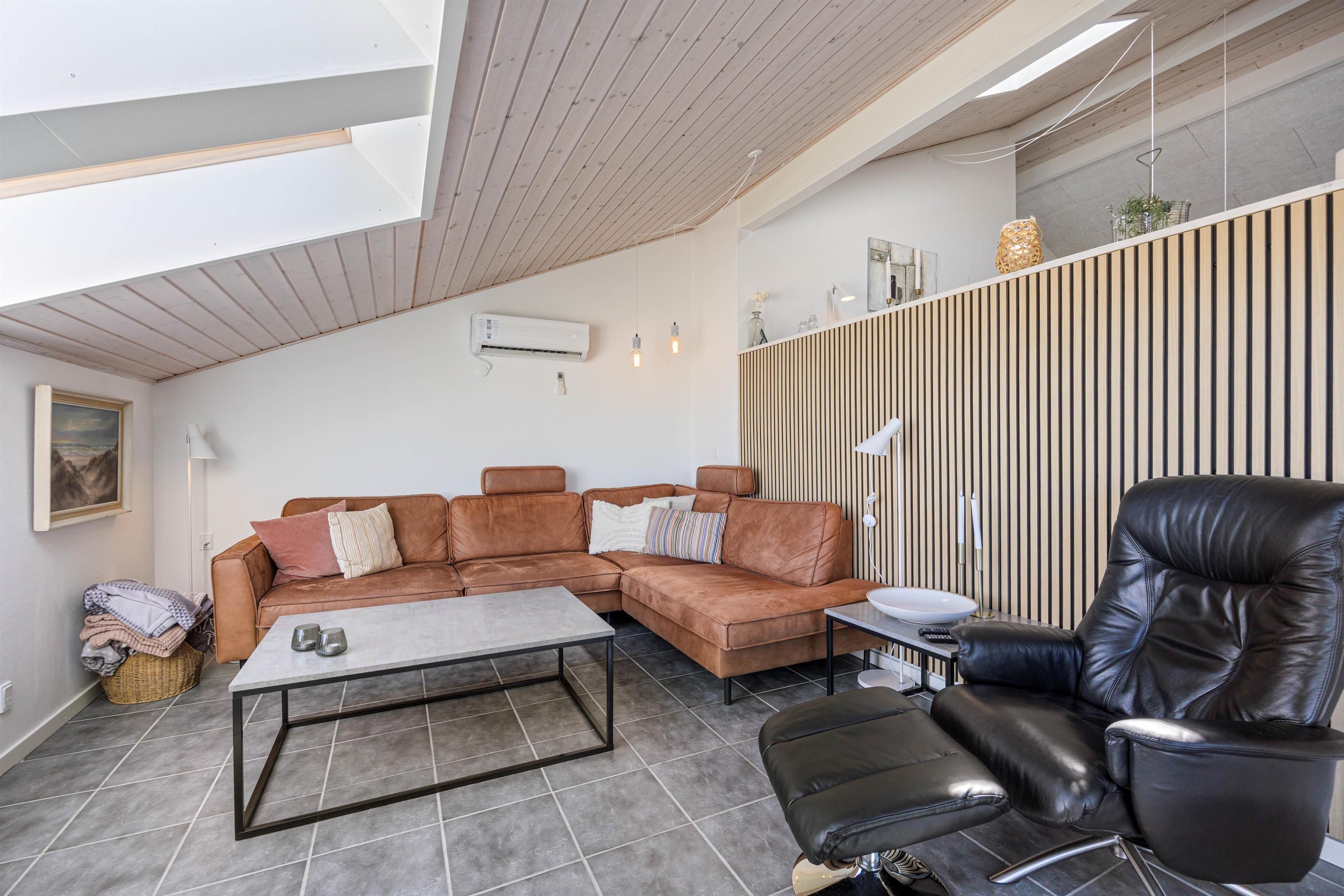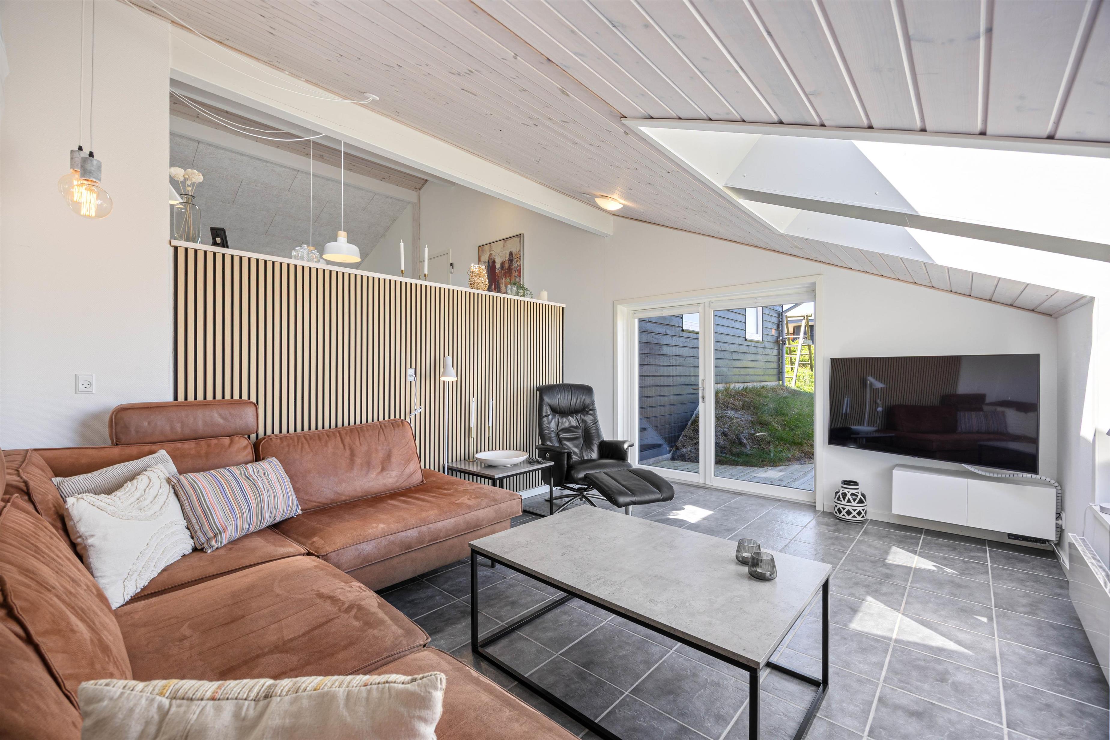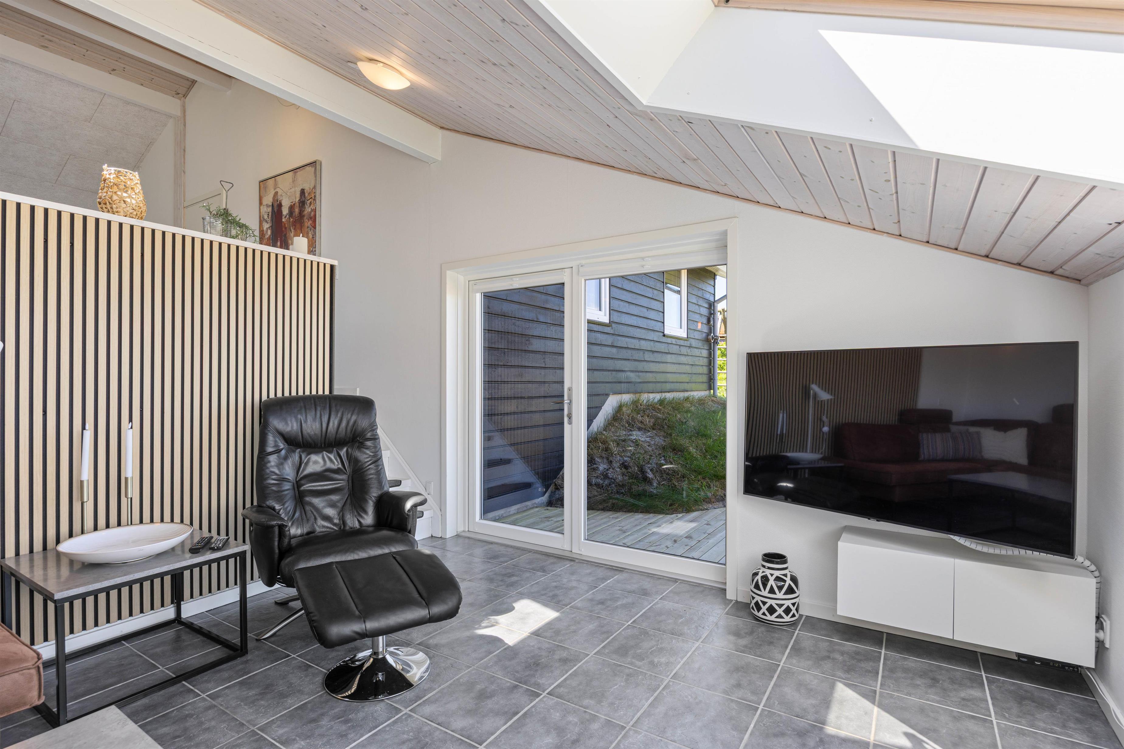 Den lyse og rummelige stue byder på en behagelig sofa, hvor I kan slappe af og se en film sammen om aftenen. TV'et med Chromecast giver dig mange valgmuligheder. Gulvvarmen i opholdsrummet sikrer sammen med den energibesparende varmepumpe en behagelig varme.