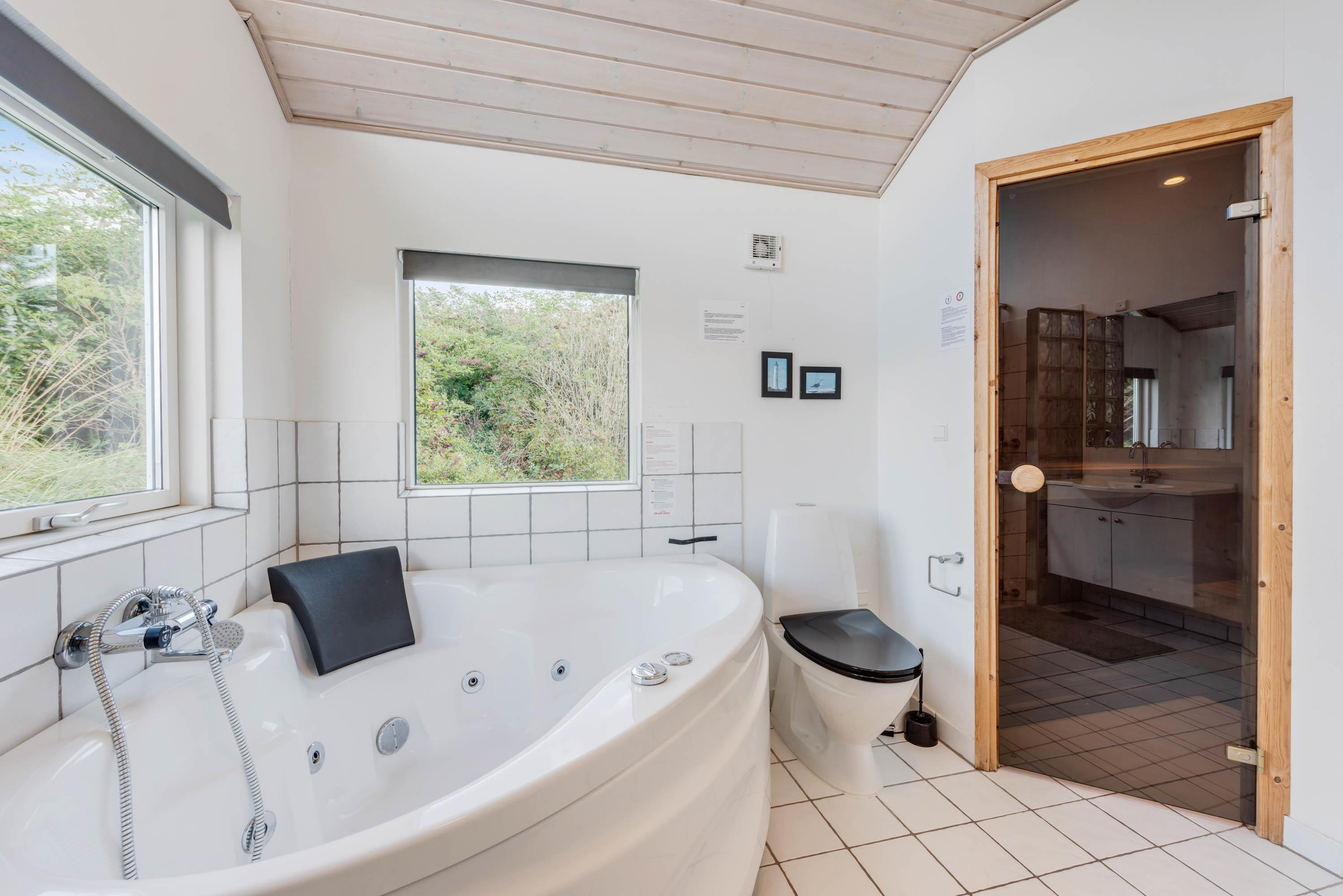 Feriehuset på Laust Digesvej 41 er udstyret med 2 flotte lyse badeværelser. Fra det ene badeværelse er der indgang til husets sauna, hvor I kan varme jer på de kolde vinterdage eller tanke nye kræfter efter en herlig feriedag ude i den friske luft. Derudover kan I nyde godt af lidt ekstra selvforkælelse i det lækre 2 personers spabad.