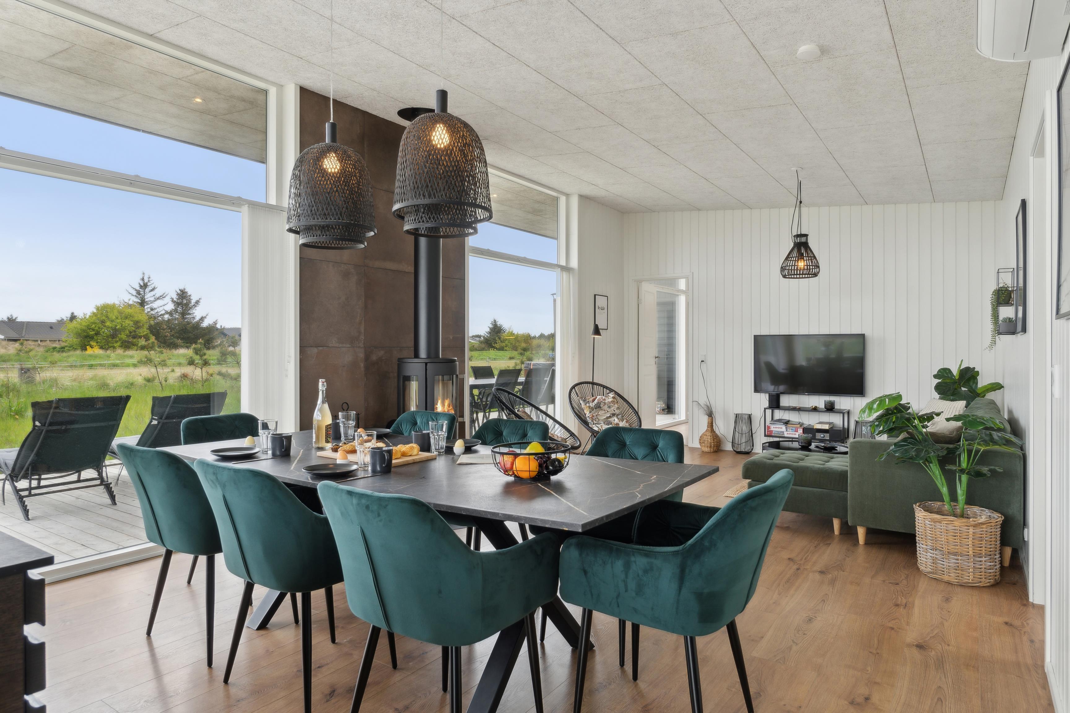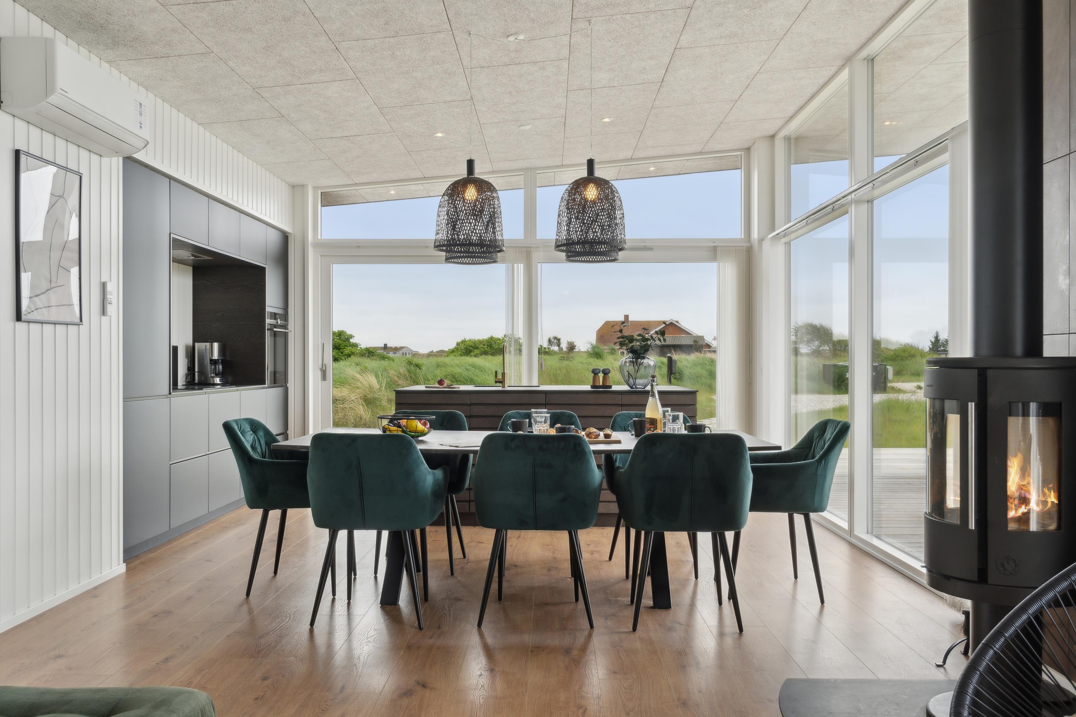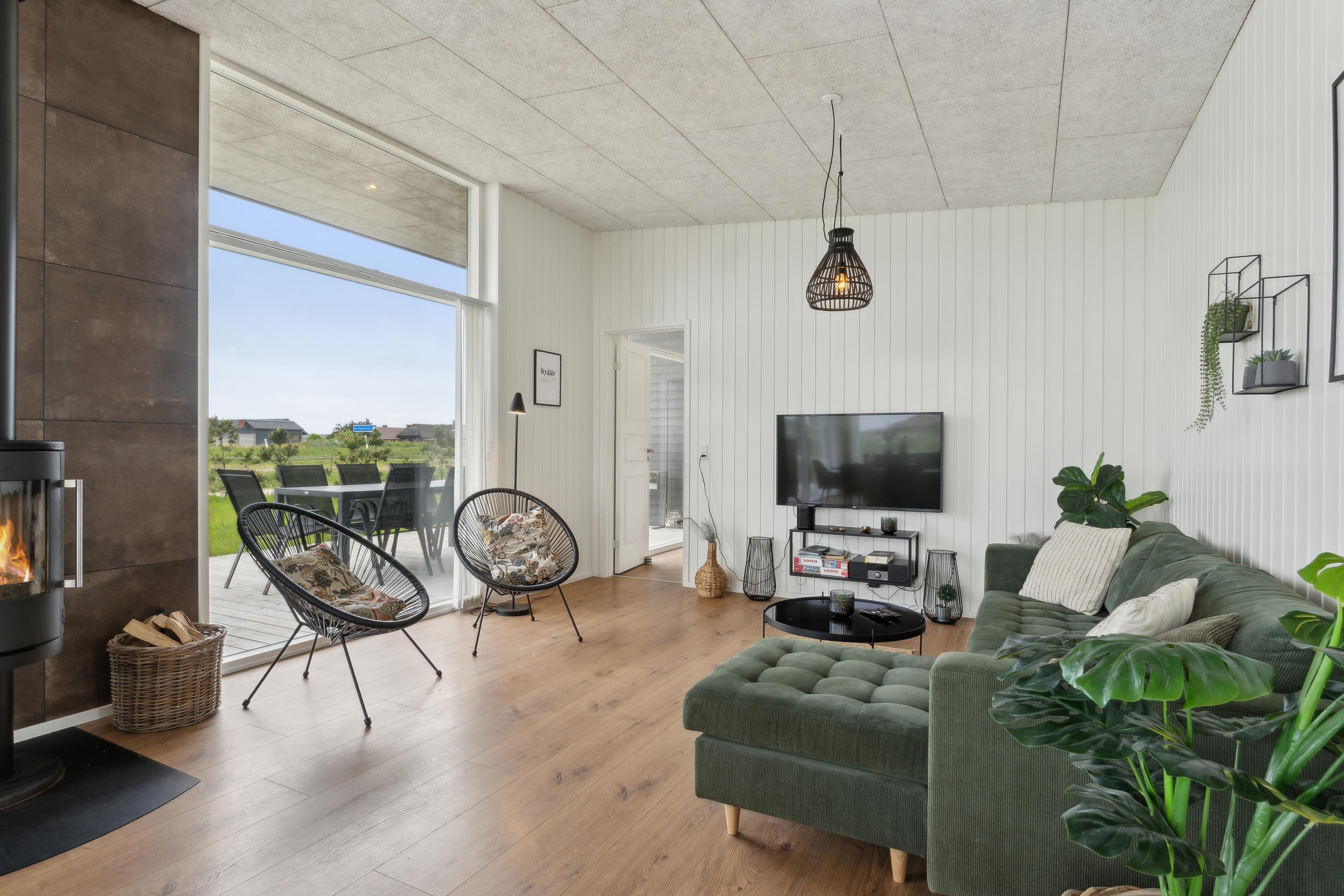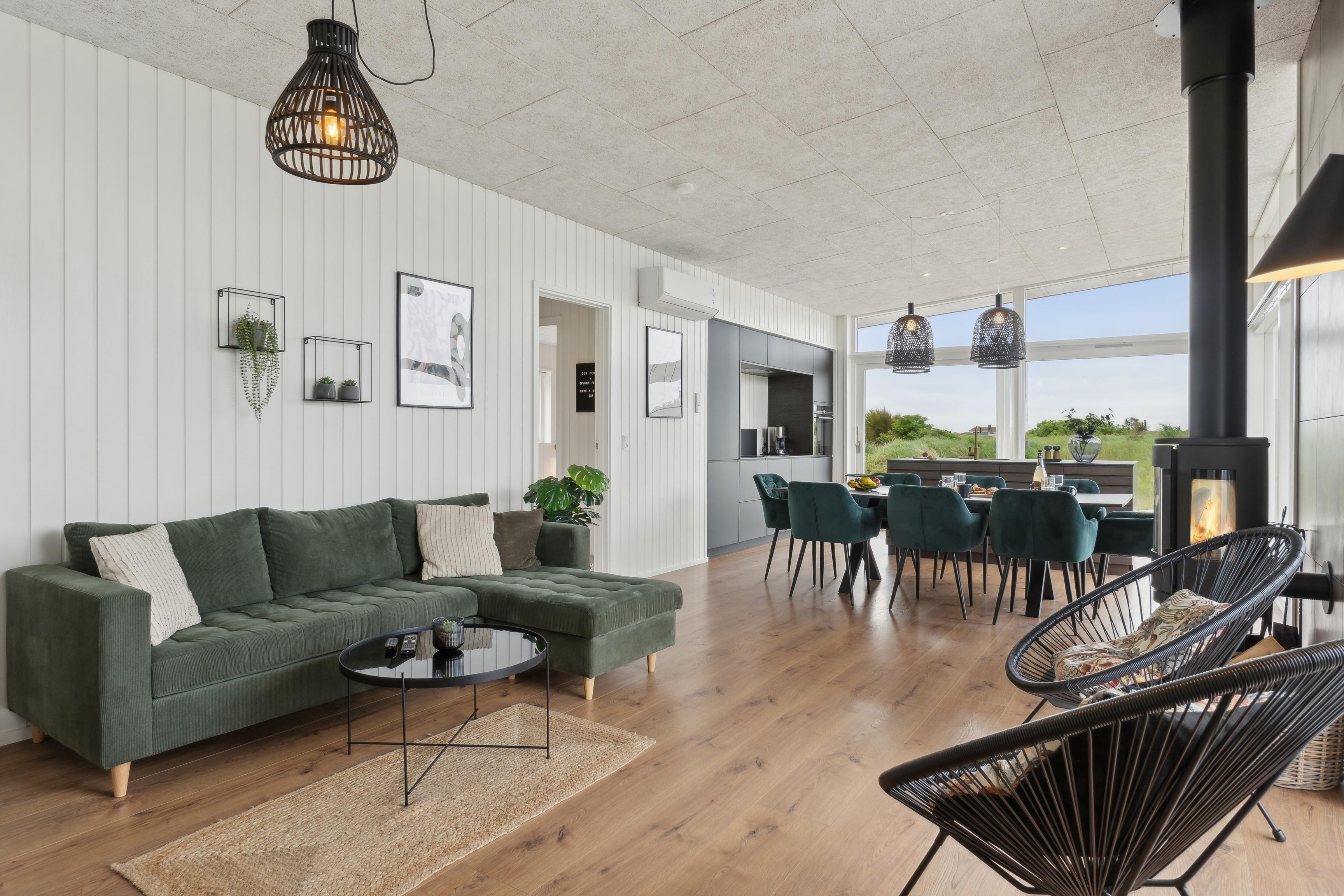 Sommerhusets hjerte er det åbne rum, hvor køkken, spiseplads og stue er samlet. Her kan hele familien nyde et kortspil eller en hyggelig aften på sofaen. Der er også en pejs, der skaber varme og ekstra hygge på de køligere dage. Huset har desuden en effektiv varmepumpe, som kan bruges til opvarmning, og som også kan køle huset ned på varme sommerdage.