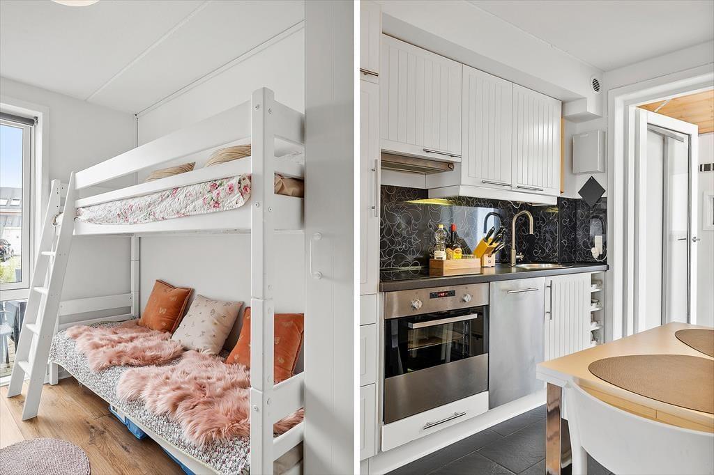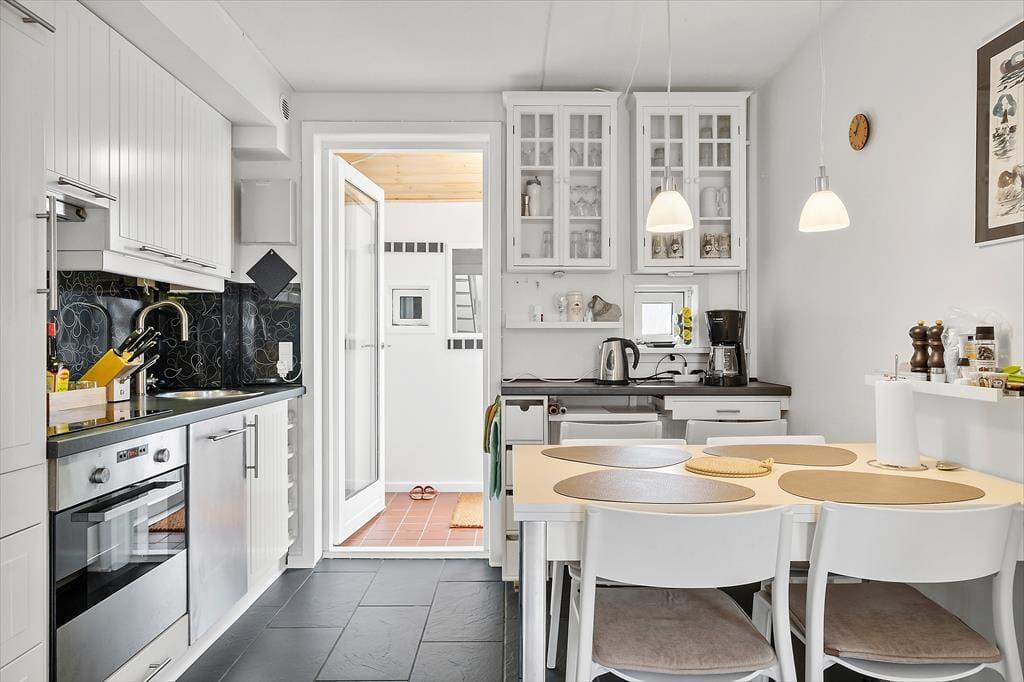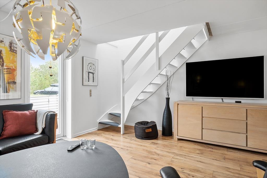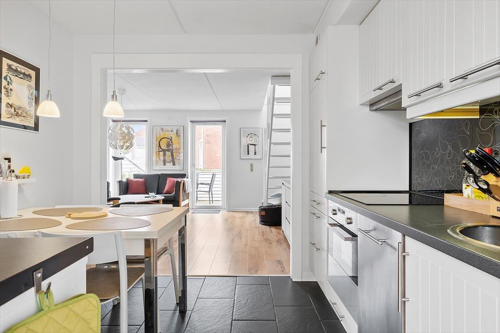 Lejlighedens 68 m² breder sig over to plan, og efter en vellykket renovering i 2023 fremstår begge etager lyse og indbydende. Der er to soveværelser med dobbeltseng på førstesalen og et værelse med køjeseng i stueplan, og ovenpå finder du for øvrigt et badeværelse med bruser og vaskemaskine. I stueetagen ligger køkken og stue i åben forbindelse, så du behøver ikke at misse småsnak og familiehygge, selvom der skal røres i gryderne eller kigges til lasagnen. Når maden er lavet, og måltidet er spist, er det rart at have en opvaskemaskine i køkkenet, for så kan du hurtigt få ryddet af og smutte ind i sofaen eller ud på terrassen.