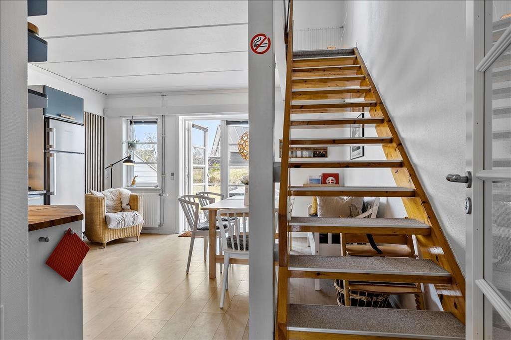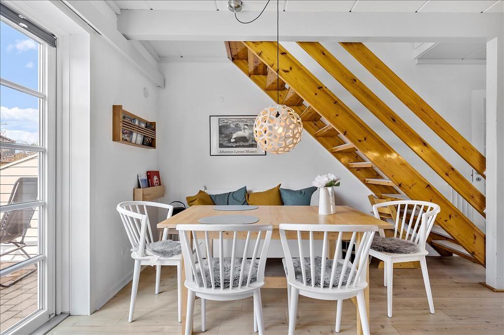 Husets indretning er både hyggelig og funktionel, og lysindfaldet er godt, såvel i stueplan som på førstesalen. Familiesamværet kan foregå både oppe og nede i huset, for der er opholdsrum på begge etager: I stueplan er et veludstyret køkken en integreret del af spisestuen, og på førstesalen kan du hygge dig i opholdsstuens bløde siddemøbler. Planløsningen byder også på tre gode værelser og et pænt badeværelse med bruseniche og vaskemaskine.