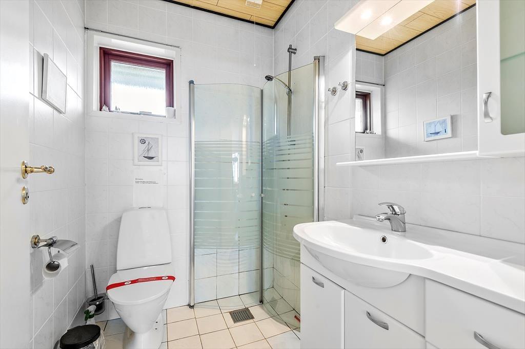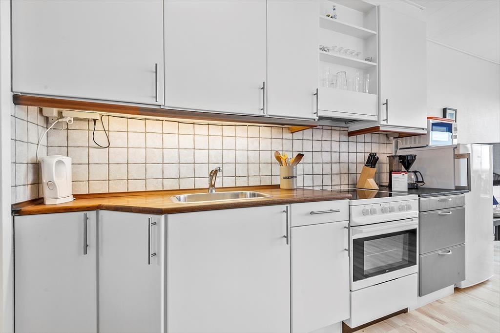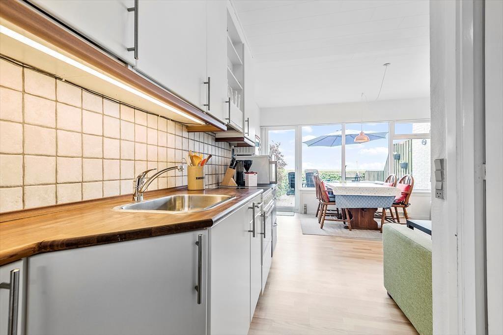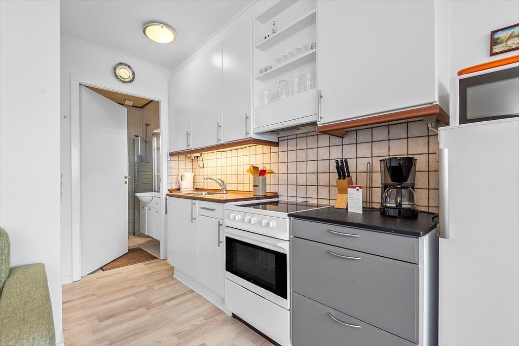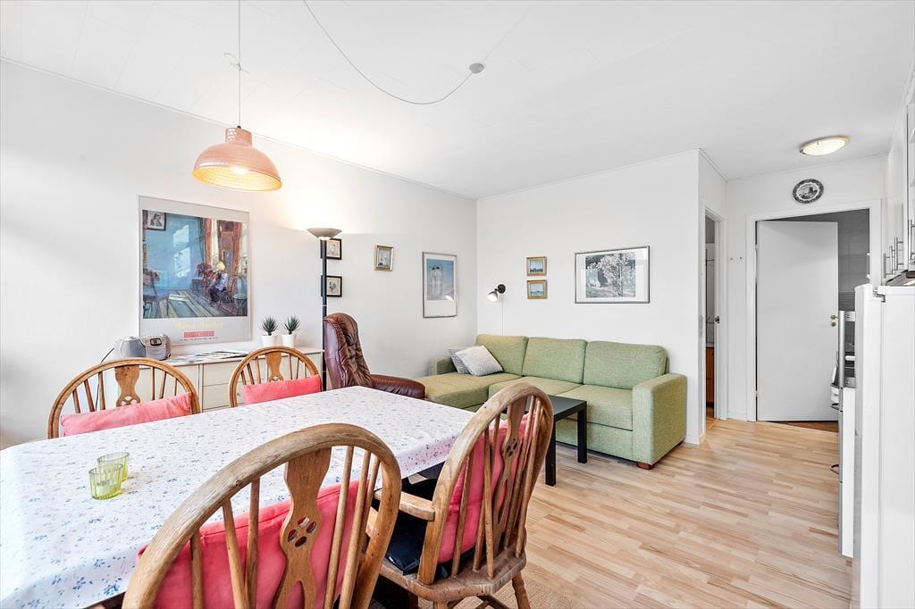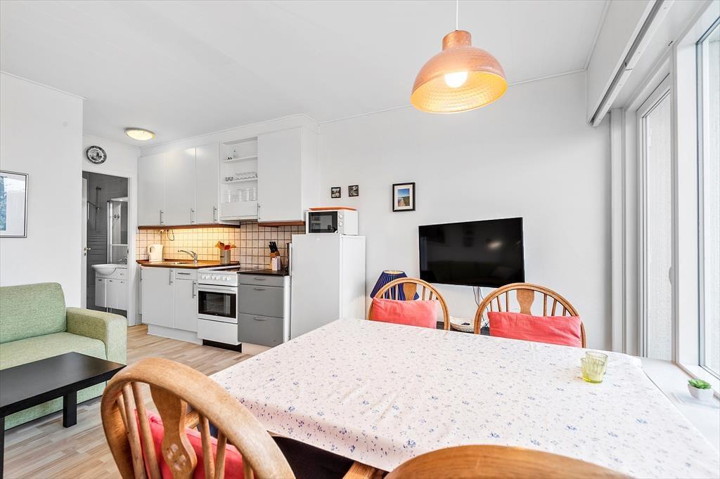 Rækkehuset ligger direkte ud til vandet, og derfor er udsigten fra stuen så glimrende. Opholdsrummets vinduesparti går fra væg til væg, så I får mest muligt ud af de flotte naturomgivelser, og det optimerer selvfølgelig også lysindfaldet. Møbleringen i stuen er hyggelig: Her er et spisebord til fire personer, bløde siddemøbler og en veludstyret køkkenafdeling, hvor I kan tilberede de lækre feriemåltider. Sofaen er for øvrigt en dobbelt sovesofa, som er et godt supplement til soveværelsets dobbeltseng. Et pænt badeværelse med en god brusekabine hører også med til planløsningen i det flot renoverede rækkehus.