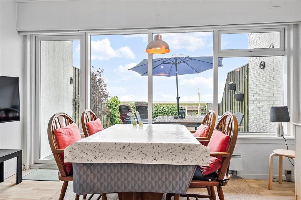 Ude i det fri råder I over to terrasser: Den ene er vestvendt, mens den anden peger mod øst og altså lige ud mod Vadehavet. Det gør det let altid at finde en dejlig solplet – og hvis I ønsker skygge, er der mulighed for at tage vest terrassens markise i brug. Fra øst terrassen har I direkte adgang til et græsklædt fællesareal, og der er sandkasse til de yngste feriegæster.