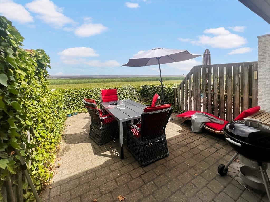 Der er terrasser på begge sider af huset, og derfor får I rig mulighed for at finde en opholdsplads i solen både formiddag og eftermiddag. Vil I nyde havudsigten imens, skal I vælge den østvendte terrasse, mens den vestvendte er det oplagte valg, hvis I vil grille og nyde de lyse sommeraftener. Foran huset er der plads til at parkere, og ud mod Vadehavet breder et grønklædt fællesareal sig.