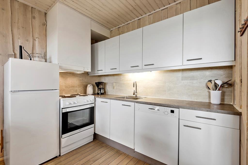 Lejligheden er renoveret i 2022, og der er tale om en stuelejlighed på 74 m², som i alt kan rumme seks overnattende gæster. De to soveværelser er henholdsvis indrettet med en dobbeltseng og to enkeltsenge, og derudover står der en sovesofa til to personer i stuen. Stuen er derudover indrettet med flere komfortable siddemøbler, spisebord og tv med DVD-afspiller, og så er køkkenet på praktisk vis etableret i den ene ende af rummet. Store vinduespartier inviterer masser af dagslys indenfor, og selv når I står ved komfuret, kan I kigge ud og nyde de naturskønne omgivelser. Lejligheden rummer selvfølgelig også et badeværelse, og her kan I tænde for saunaen og tage jer en velfortjent pause i spabadet, når I kommer hjem efter dagens eventyr.