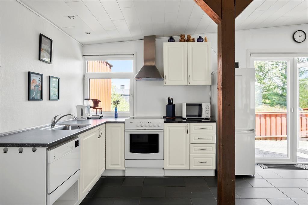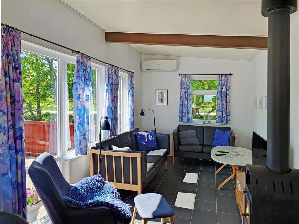 Det rødmalede træsommerhus har en pæn og lys indretning med mange gode detaljer. Det åbne køkken er veludstyret, så du har opvaskemaskine og alt det nødvendige for at lave god mad. Mellem stuens spisebord og sofaarrangementet står en brændeovn, og der er også en varmepumpe i rummet – og så er der for øvrigt gulvvarme under det mørke flisegulv. Et badeværelse med bruser og to soveværelser med i alt fem sengepladser hører med til planløsningen, og til de alleryngste feriegæster er der både en barneseng og en barnestol.