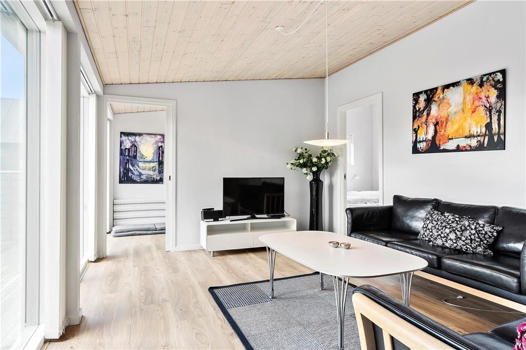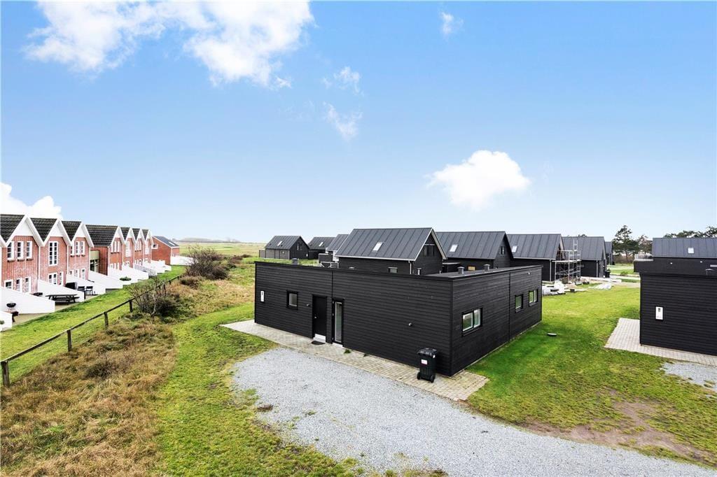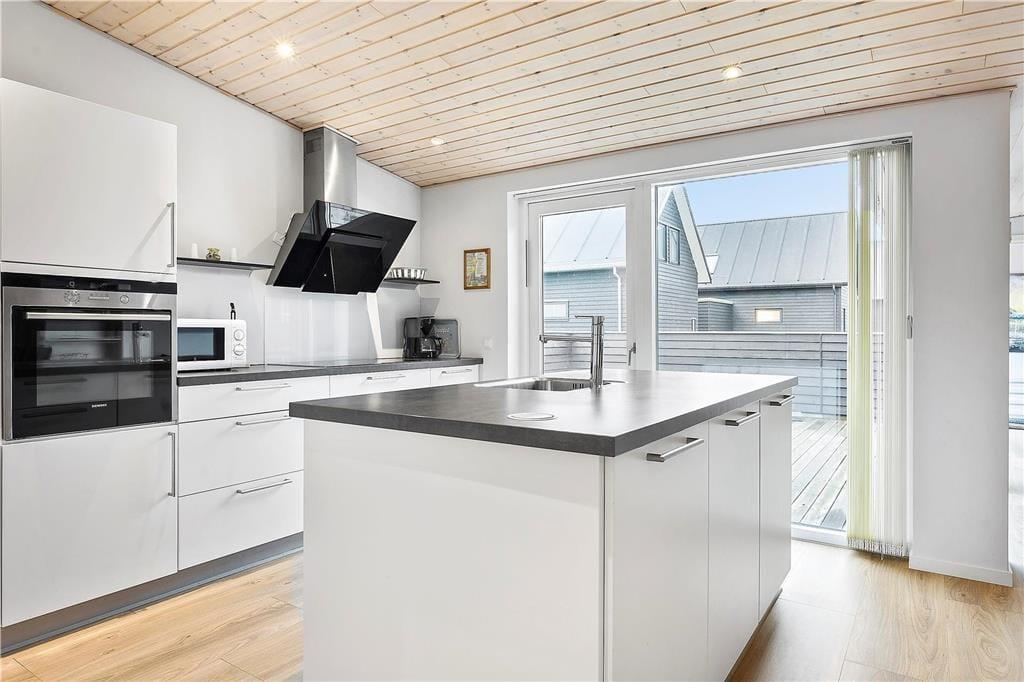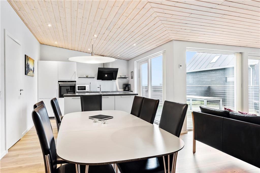 De luksuriøse huse her i området er tegnet af Ginnerups Tegnestue, som har lagt vægt på at skabe en enkel og harmonisk arkitektur. Netop dette hus er opført i 2014 og byder på en velgennemtænkt planløsning, så syv personer nemt kan få det godt og bekvemt inden døre. Alle rum er indrettede med pæne møbler og komfortable boligløsninger, og de store vinduespartier sørger for et godt lysindfald. Huset byder på fire soveværelser og to badeværelser, hvoraf det største er udstyret med sauna og en lækker topersoners spa. Endelig er der opholdsrummet, som er et stort og vinkelformet rum med sofaafdeling, spiseplads og en veludstyret køkkenafdeling med alskens hårde hvidevarer.