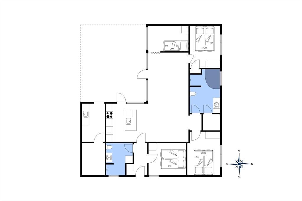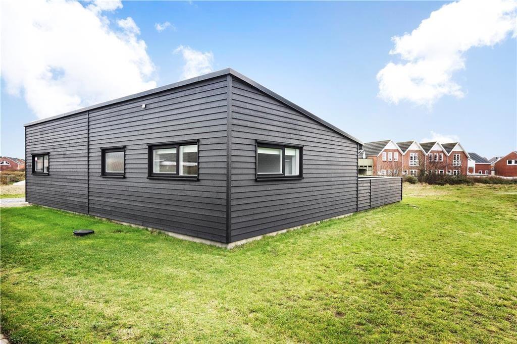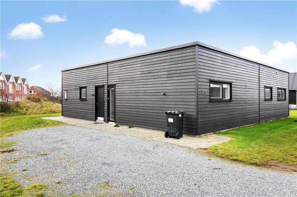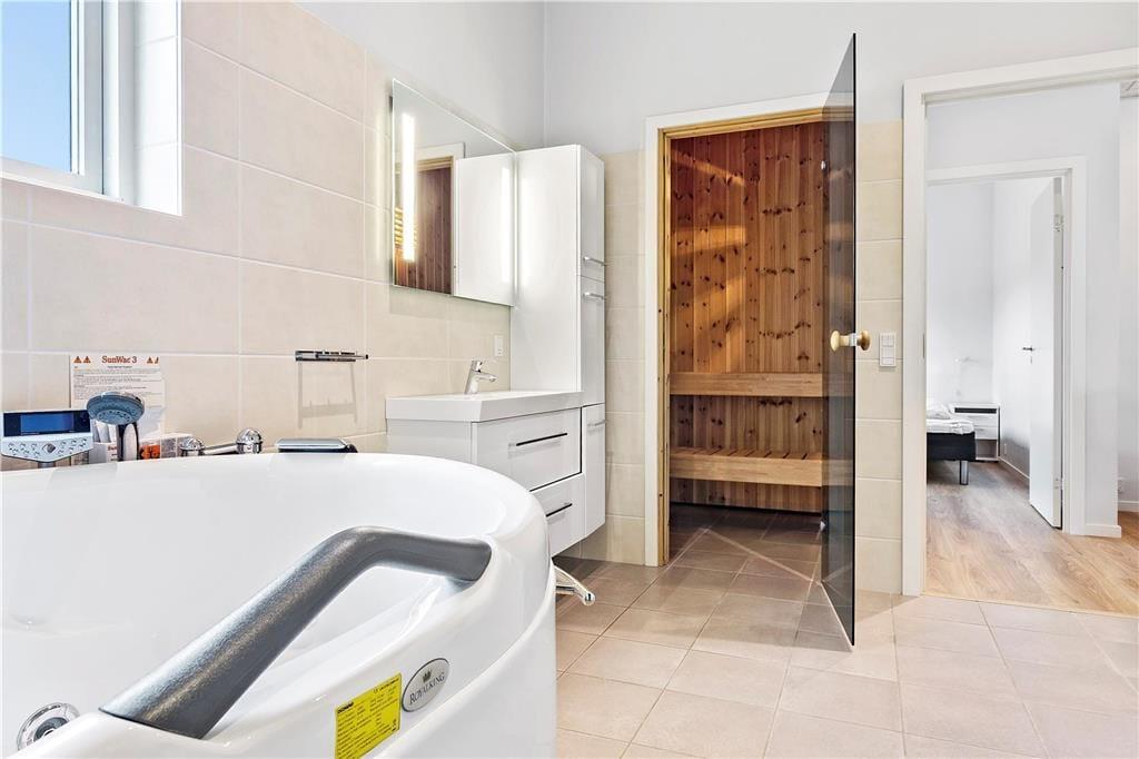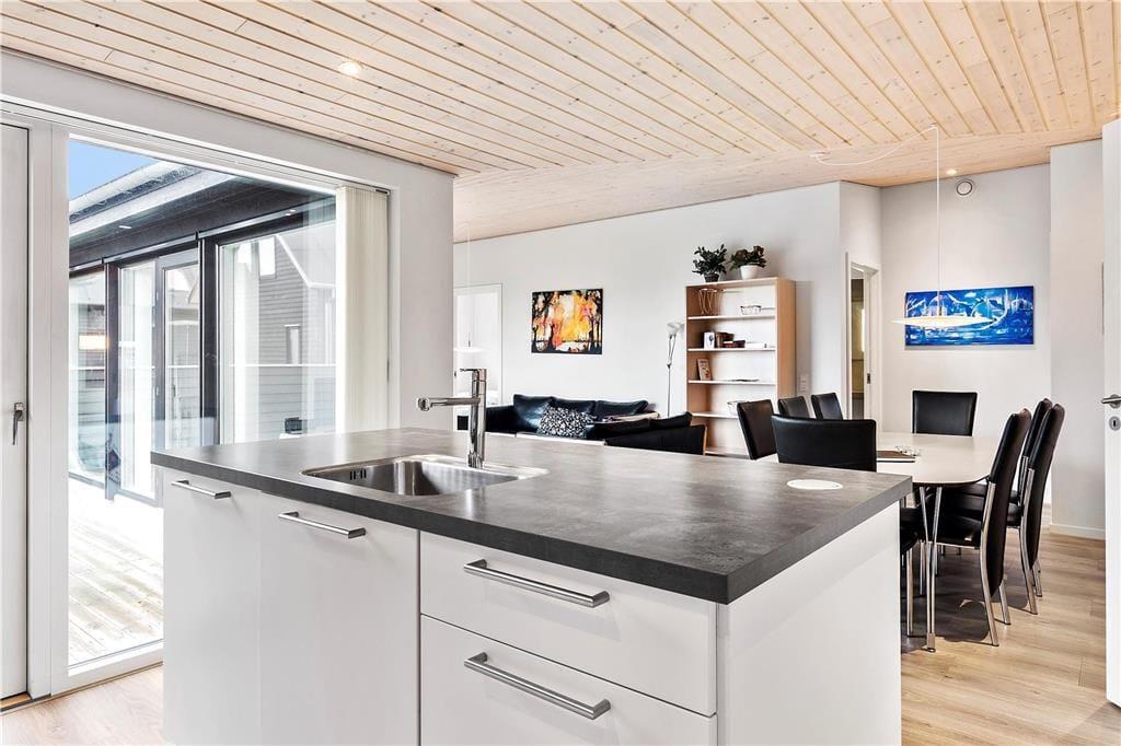 De luksuriøse huse her i området er tegnet af Ginnerups Tegnestue, som har lagt vægt på at skabe en enkel og harmonisk arkitektur. Netop dette hus er opført i 2014 og byder på en velgennemtænkt planløsning, så syv personer nemt kan få det godt og bekvemt inden døre. Alle rum er indrettede med pæne møbler og komfortable boligløsninger, og de store vinduespartier sørger for et godt lysindfald. Huset byder på fire soveværelser og to badeværelser, hvoraf det største er udstyret med sauna og en lækker topersoners spa. Endelig er der opholdsrummet, som er et stort og vinkelformet rum med sofaafdeling, spiseplads og en veludstyret køkkenafdeling med alskens hårde hvidevarer.