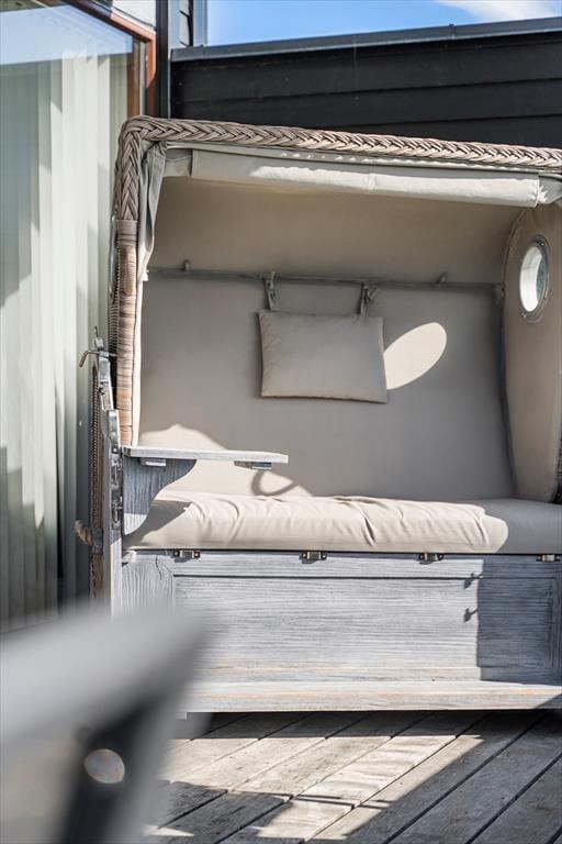 Også ude i det fri kan I suge udsigten til jer fra det sydvendte terrassemiljøet. I kan også gå op på førstesalens altan, hvorfra har I et glimrende udsyn og kan følge med i færgesejladsen mellem Rømø og Sild – det er en god måde at komme helt ned i tempo og mærke feriefornemmelsen brede sig.