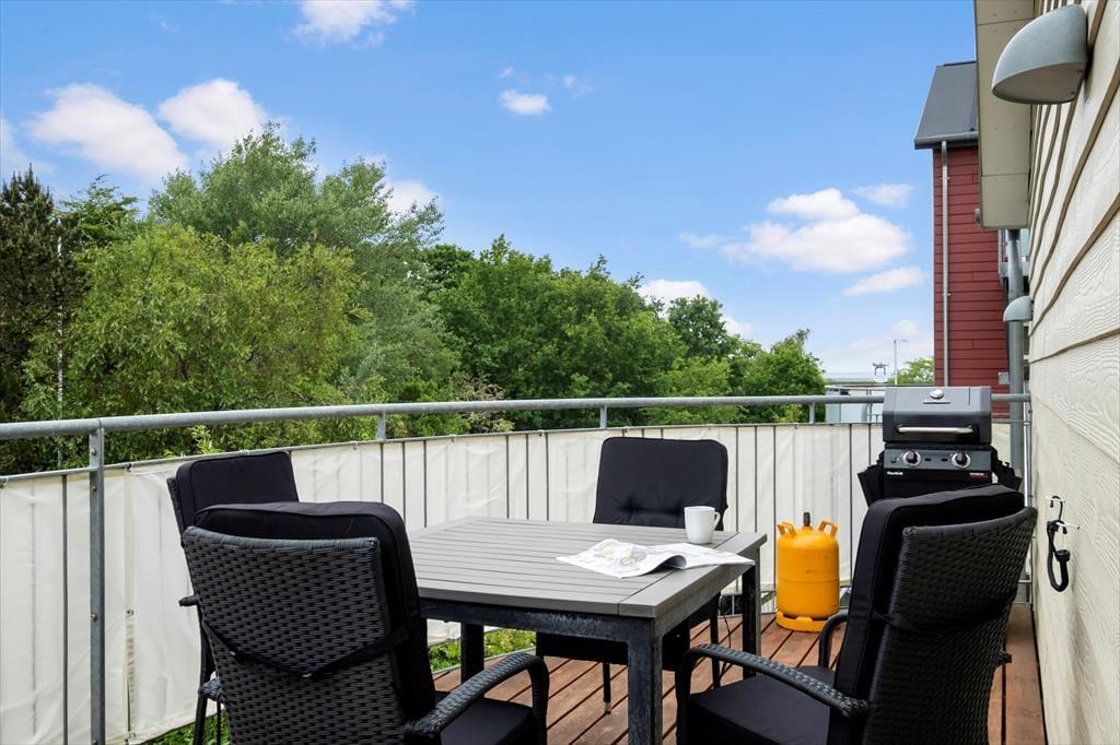 Lejlighedens vestvendte altan er et skønt sted at nyde det gode sommervejr – endda med frit udsyn til grønne træer og kig til Vadehavet. En kop eftermiddagskaffe efter en badetur er en perfekt måde at koble af på, og hvis du kan lide at grille, kan du tilberede de lækreste måltider herude under åben himmel. På svalegangen, som du deler med nabolejligheden, har du for øvrigt også mulighed for at slå dig ned.