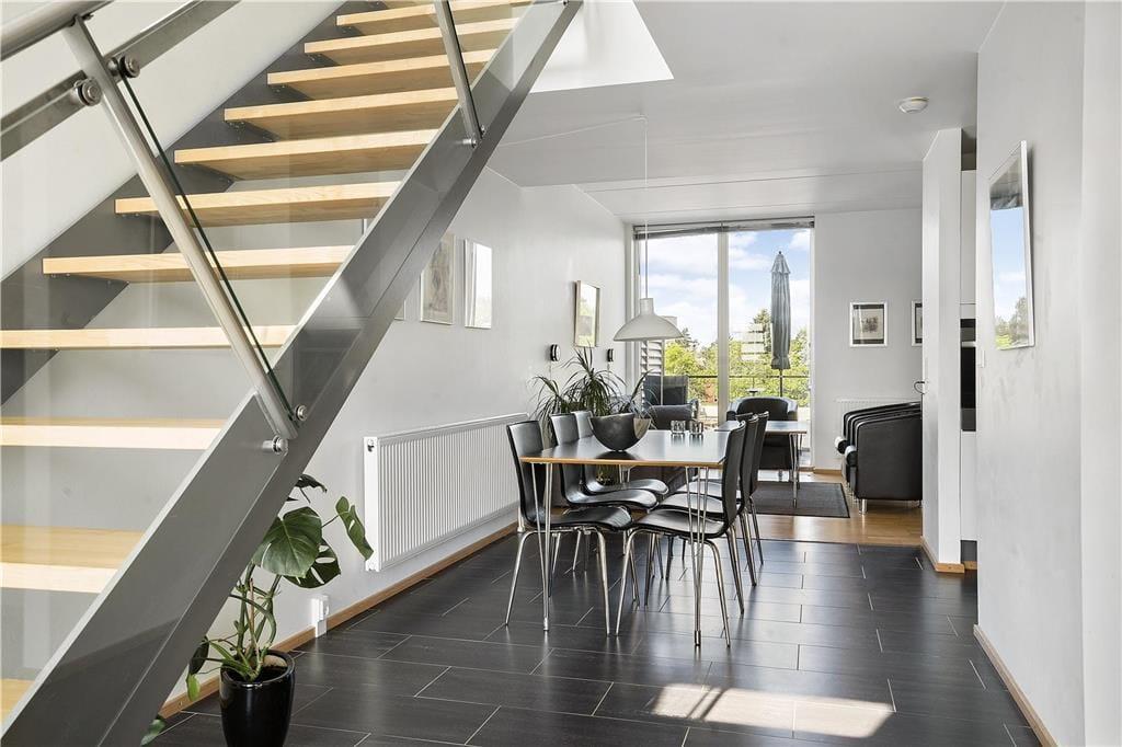 På begge etager er det muligt at træde direkte ud i det fri. I stueplan kan I slå jer ned på den østvendte terrasse eller den vestvendte altan, hvor I kan kigge ned på Havnebys hyggelige torv. Hvis I hellere vil nyde havneudsigten lidt fra oven, skal I vælge førstesalens østvendte altan.