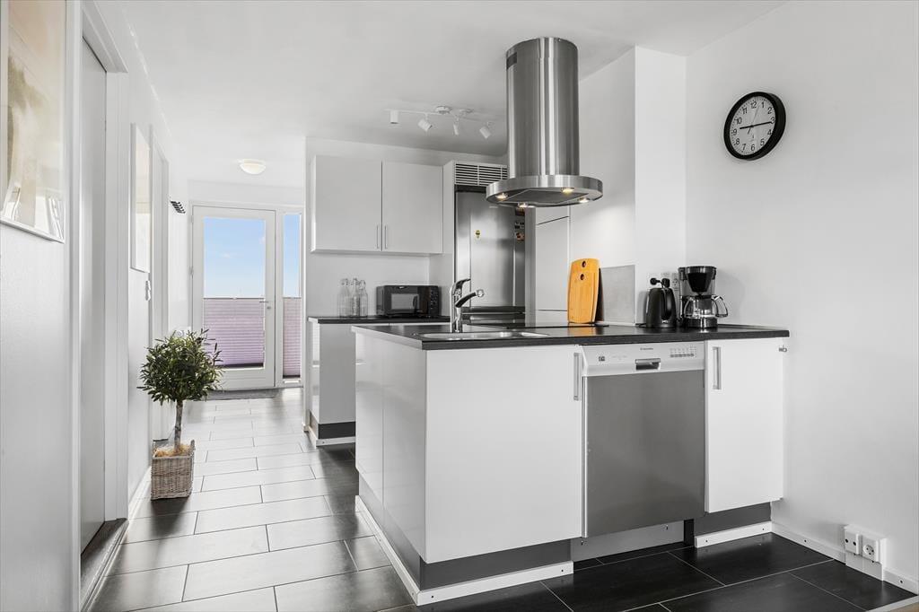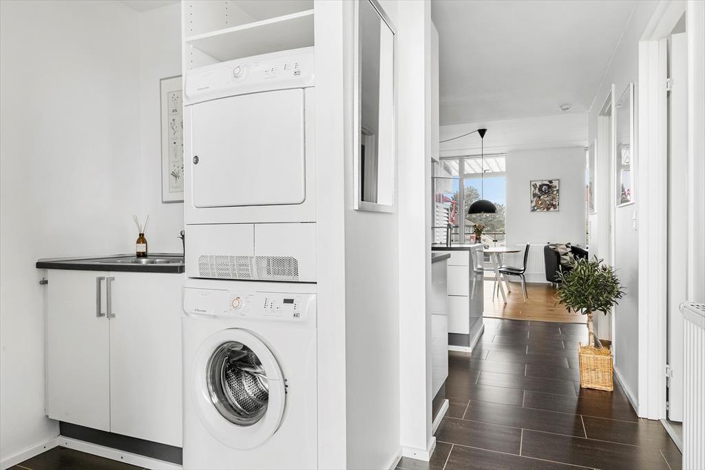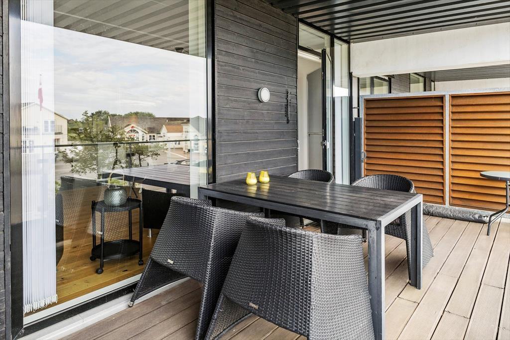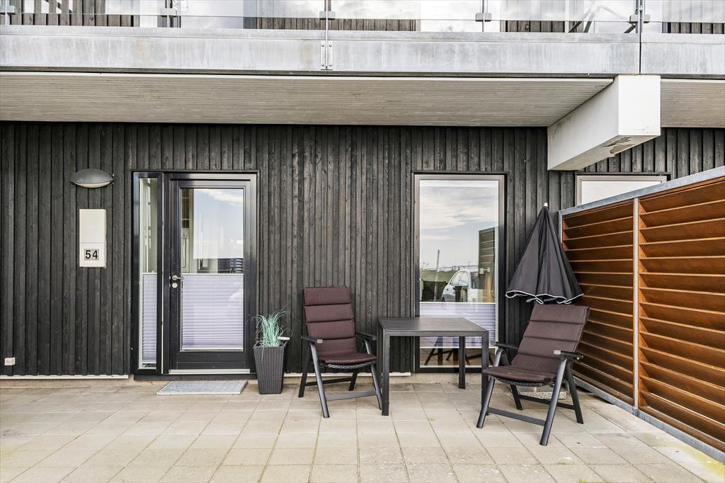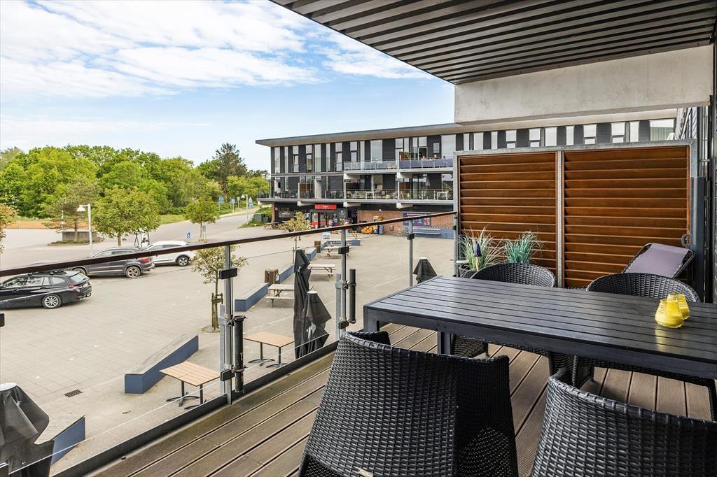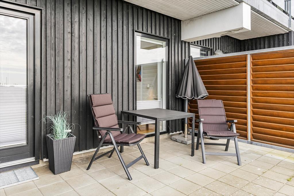 Hvis solen skinner, er det oplagt at rykke ud på en af lejlighedens to terrasser. Den ene vender mod øst og er et skønt sted at nyde morgenkaffen i dagens første solstråler. Den anden vender mod vest og ligger i direkte forlængelse af stuen. Her kan du sidde og følge med i livet på det hyggelige torv. Terrassen er udstyret med en liggestol, så hvis du holder af at dase med udkig til skyerne på himlen, er der rig mulighed for det. Det er også oplagt at dække op til en hyggelig middag, når dagen går på hæld – og da terrassen er overdækket, behøver du heller ikke bekymre dig så meget om vejrgudernes humør.