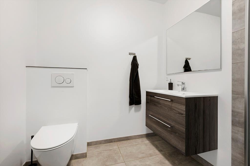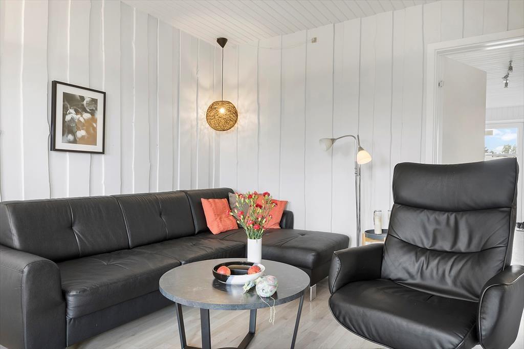 Mere præcist er der tale om en stuelejlighed, der har en fin planløsning til fire personer, så en børnefamilie eller to vennepar kan sagtens nyde dagene her. Fra entréen har du adgang til to soveværelser og et brusebadeværelse, og endelig er der opholdsafdelingen, hvor stue og køkken er forenet. Det overvejende sorte møblement giver en flot kontrast til de hvide vægge, og uanset om du slår dig ned ved spisebordet eller læner dig tilbage i sofahjørnet, kan du se frem til at sidde komfortabelt. Der er tv med danske og tyske kanaler, hvis I ikke bare hygger jer med kortspil, krimier og krydsogtværser, og hvis du løber tør for kaffe eller snacks, har du bare få skridt hen til køkkenets kaffemaskine og køleskab.