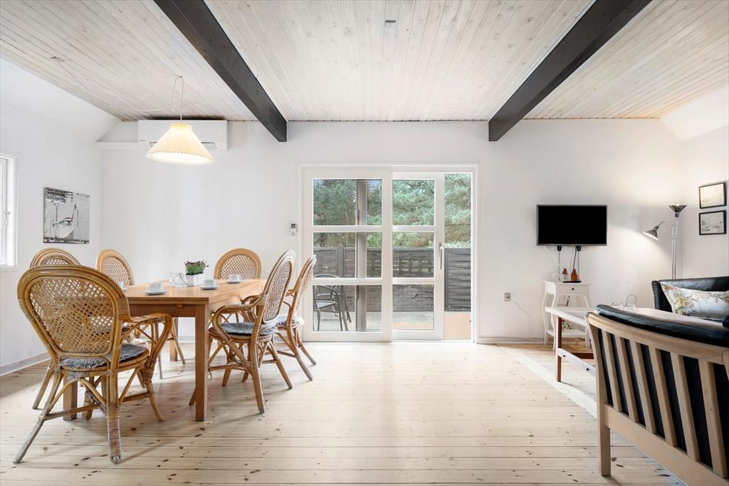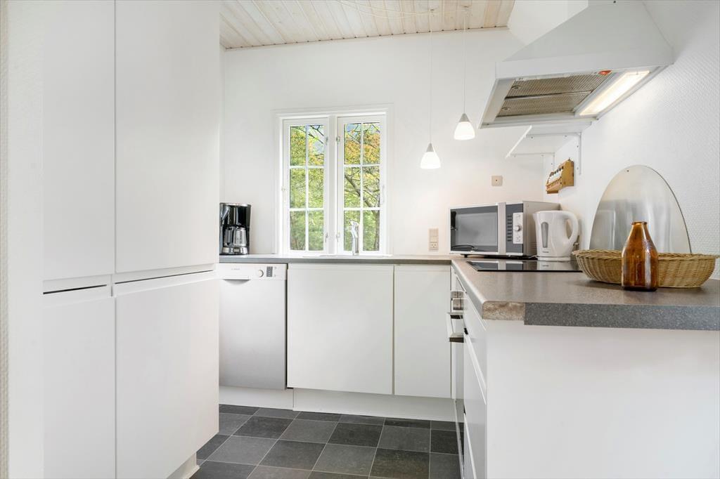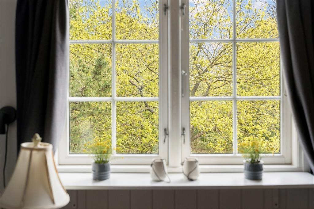 Når du træder indenfor, bliver du mødt af en varm og indbydende atmosfære, hvor charme og tradition spiller hovedrollen. Det specielle bindingsværkshus emmer af hyggelig sommerhushygge med sine trælofter med bjælker og den centrale brændeovn, der kan sprede varme og stemning på kolde eftermiddage eller aftener. Det er et område, der indbyder til socialt samvær. Et rum hvor I kan sidde sammen, nyde hinandens selskab og lytte til den knitrende ild. Det store opholdsområde er det naturlige centrum, hvor det hyggelige interiør er kombineret med store vinduer, der lukker den omkringliggende natur ind, så skov, træer og rolig daggryssol synger med i sommerhusets ægte landlige stemning.