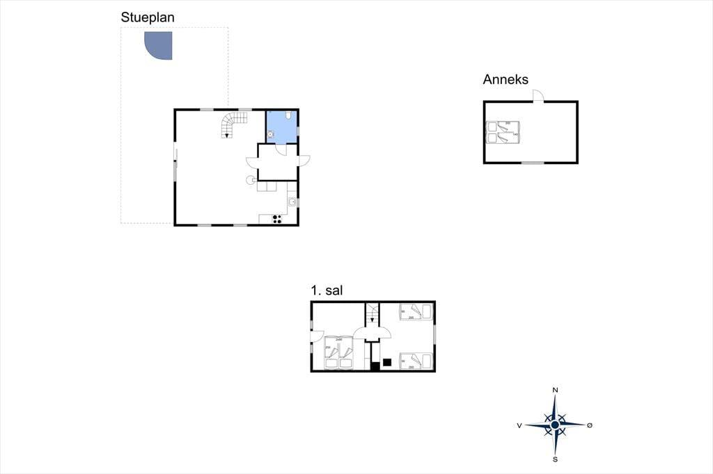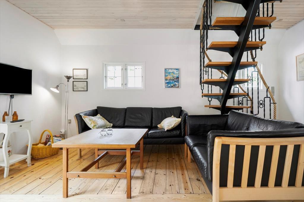 En åben vindeltrappe fører op til to gode soveværelser med hhv. en dobbeltseng og to enkeltsenge. Hvis man er flere end fire personer, der vil holde ferie i dette charmerende hus, så er der et anneks med en dobbeltseng som kan benyttes.