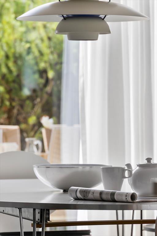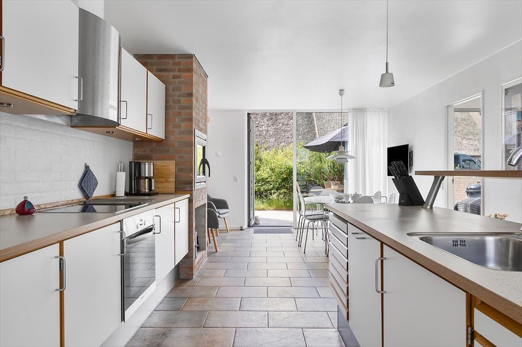 Sommerhuset, der nærmere bestemt er et stråtækt rækkehus fra 2007, har en glimrende planløsning på 112 m² fordelt på to plan. I stueplan er køkken og spisestue forenet som et stort og indbydende opholdsrum med gennemstrømmende lysindfald og stilfuldt møblement. Mens I hygger jer med madlavningen eller sidder samlet omkring spisebordet, kan I nyde varmen og skæret fra ilden i indbygningspejsen – hvis det altså ikke nærmere er vejr til at lade frisk luft strømme ind gennem terrassedøren. I kan også gå ovenpå for at slappe af i den flotte opholdsstue, der har loft til kip og et kæmpe sydvendt vinduesparti. En af sofaerne er en dobbelt sovesofa, så den kan oplagt fungere som sengeplads om natten, hvis dobbeltsengene på husets to soveværelser ikke rækker. Et badeværelse rummer huset selvfølgelig også, og det er lige så velindrettet som de øvrige rum.