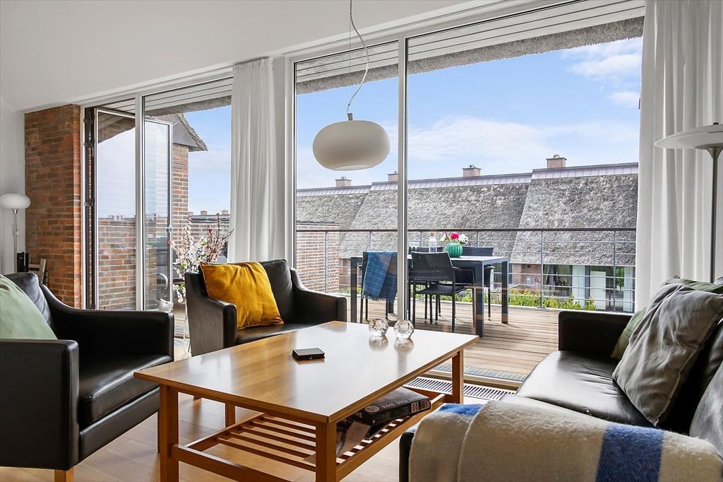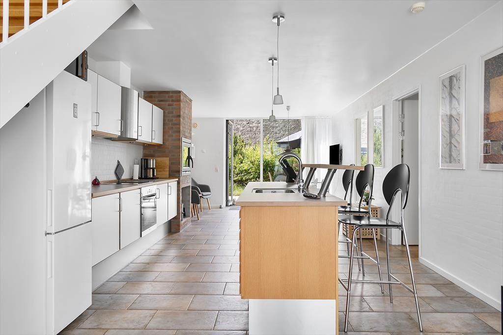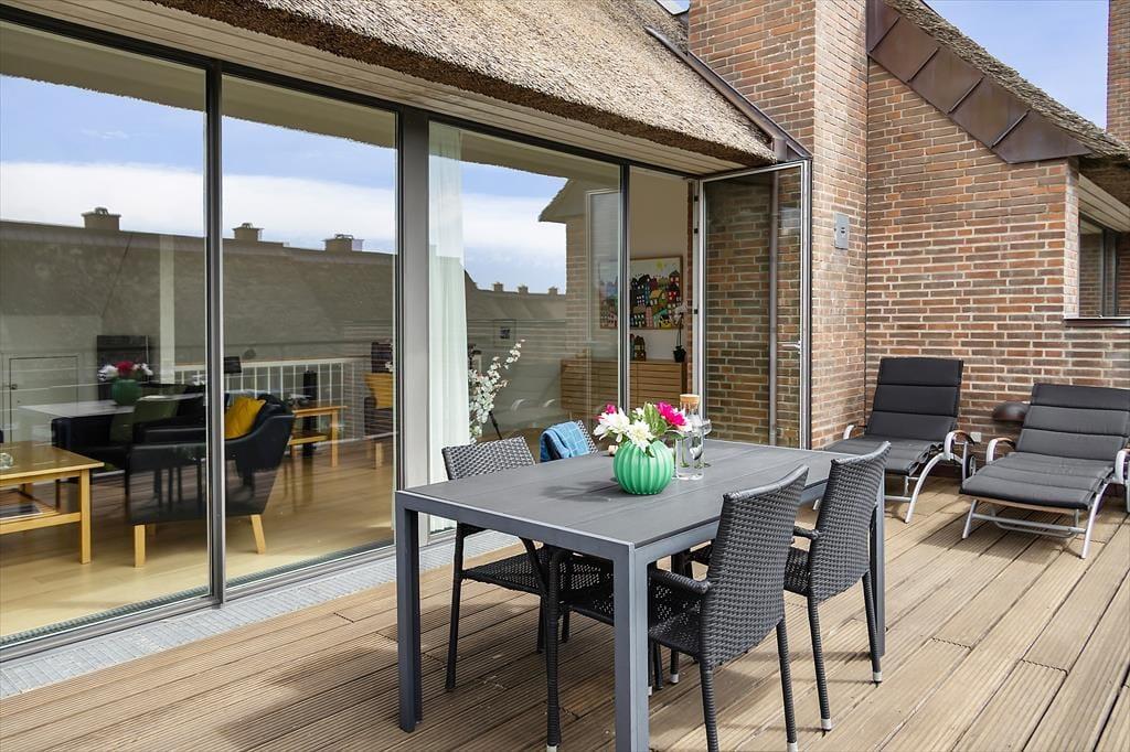 Når vejret er godt, har I flere skønne opholdspladser at vælge imellem ude i det fri. Den sydvendte terrasse ligger i forlængelse af køkken-alrummet, så det er oplagt at flytte morgenmaden og frokosten herud – og at tilberede aftensmaden på grillen under åben himmel. Det kan nu også anbefales at rykke driverlivet op på førstesalens store altan, der ligeledes er sydvendt og dermed dejligt solrig.