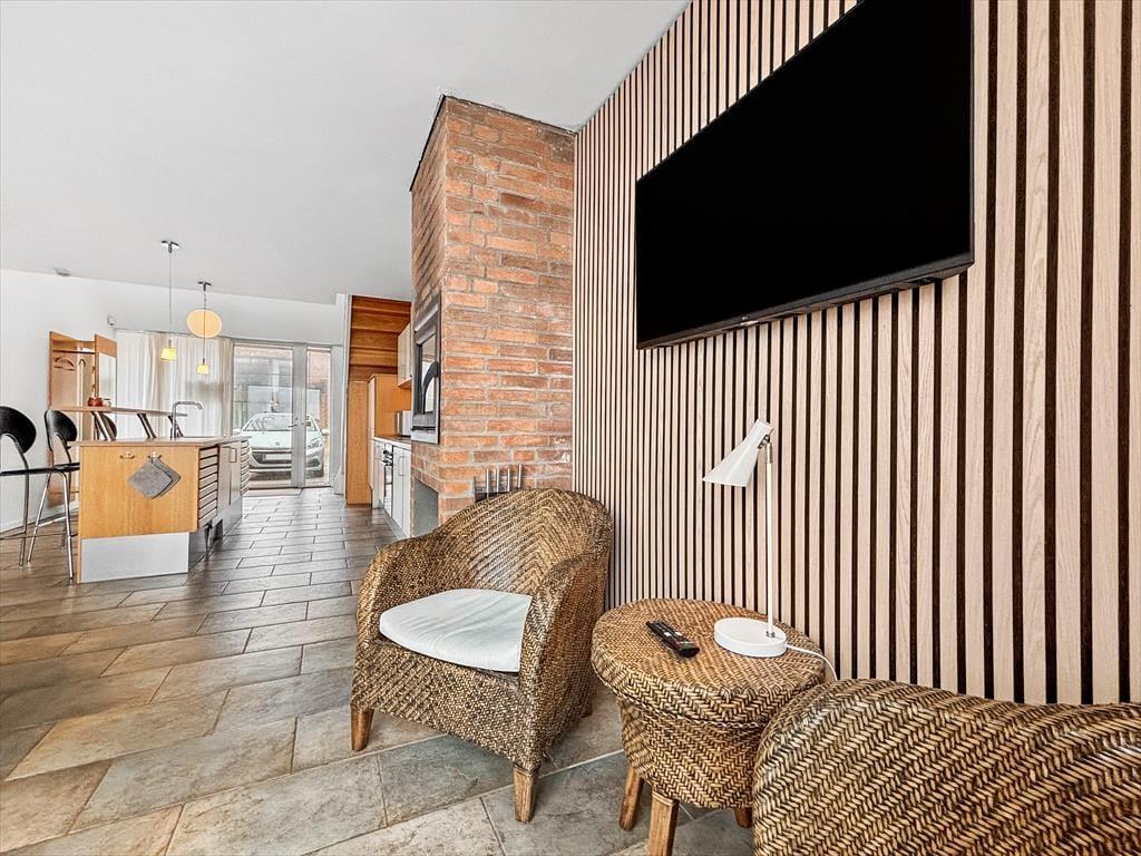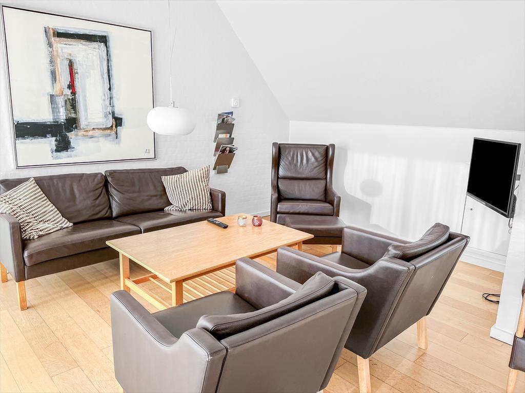 Hvis I ellers kan løsrive blikket, er selve ferieboligen også værd at bemærke – det arkitekttegnede rækkehus er nemlig ikke bare et velformet kvalitetsbyggeri, men også fyldt med lækre møbler og komfortable boligløsninger. Som ekstra detalje har dette feriehus en stor tv-pakke med 80 forskellige kanaler. Planløsningen består af to soveværelser med nye madrasser fra 2022, et badeværelse og et stort opholdsrum med integreret køkkenafdeling i stueplan, og på førstesalen ligger en dejlig udsigtsstue, som takket være en sovesofa også kan bruges som sovegemak.
