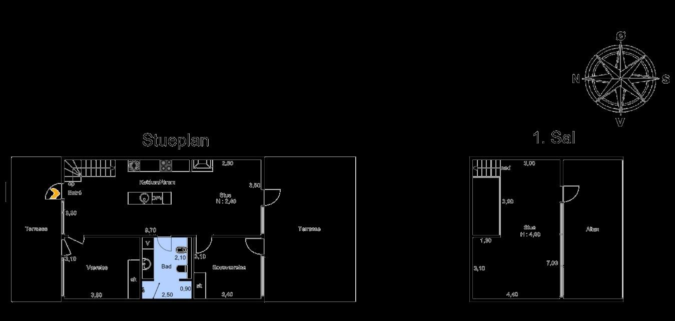 Bad/wc: Vaskemask., tørretumbler, wc, håndvask, bruser