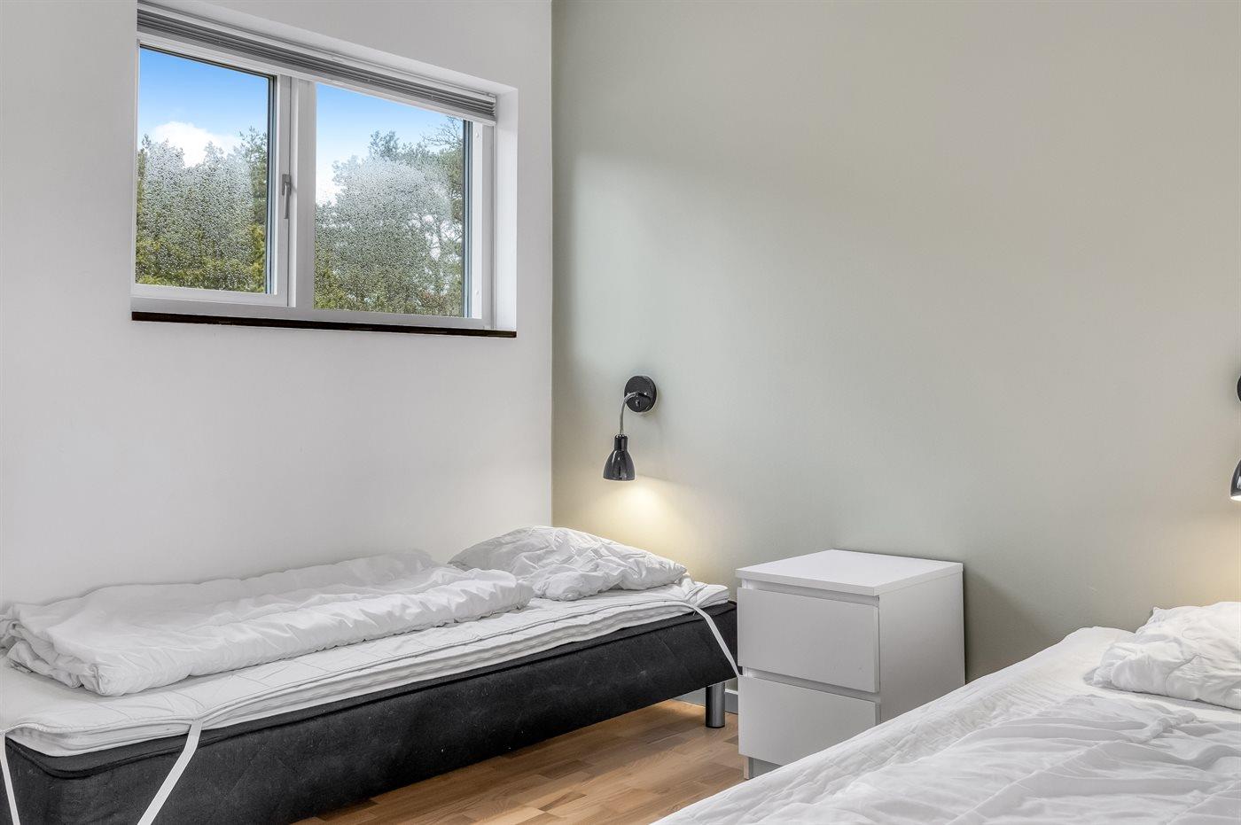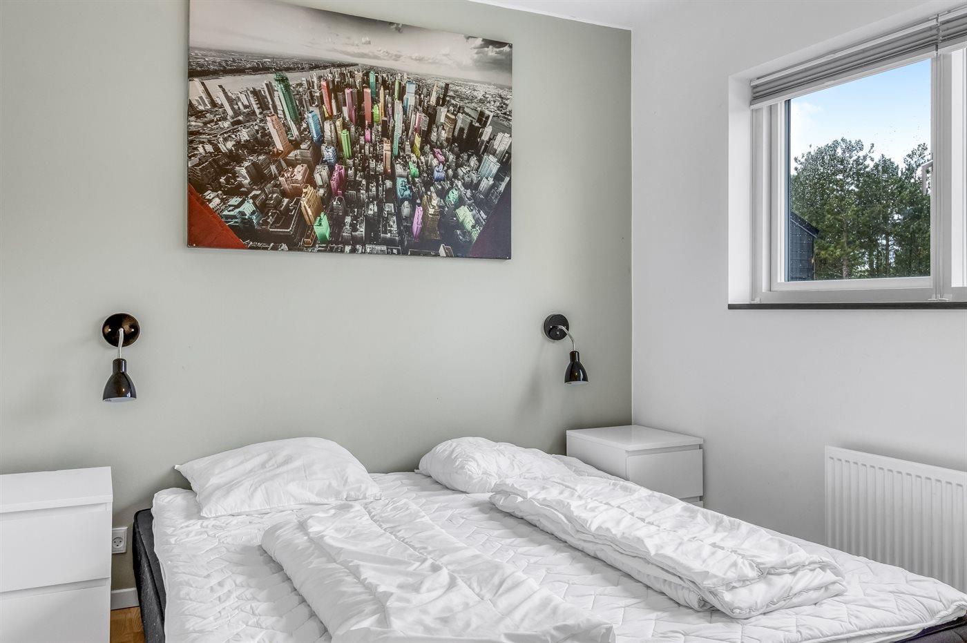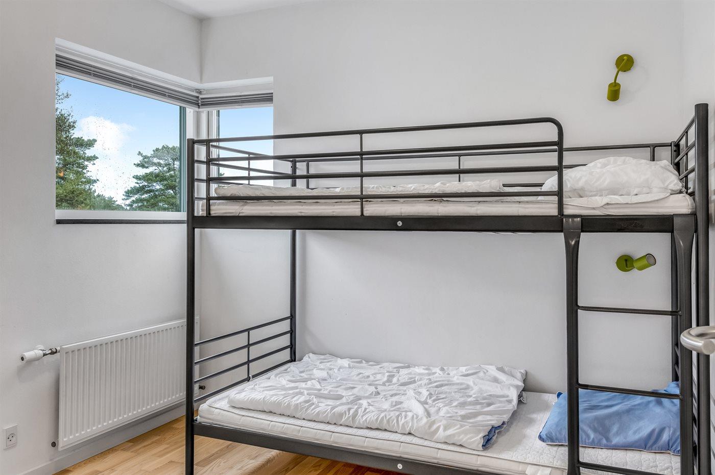 Der er i alt 4 soveværelser. Sovepladserne fordeler sig på: 4 sovepladser i dobbeltsenge. 2 sovepladser i enkeltsenge. 2 sovepladser i køjeseng. 2 sovepladser i sovesofa (dobbelt). 2 af disse sovepladser befinder sig i stuen. Derudover er der 2 stk. barnesenge. Der er gulvvarme i 4 af soveværelserne.